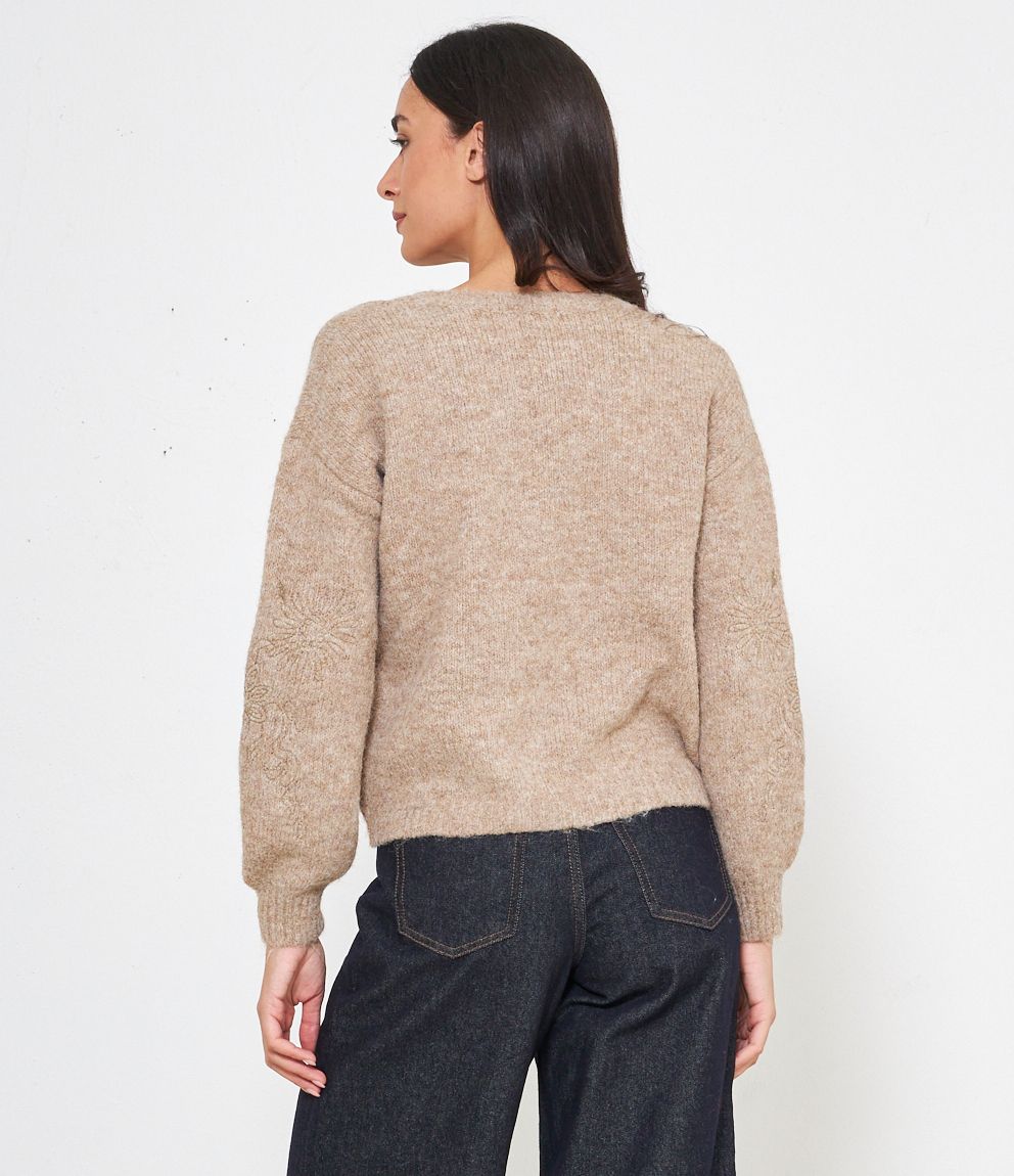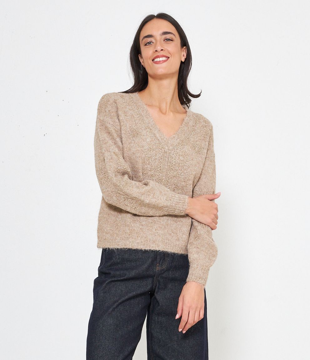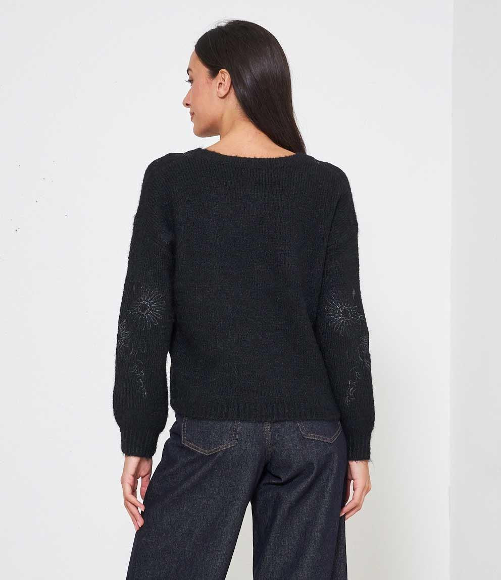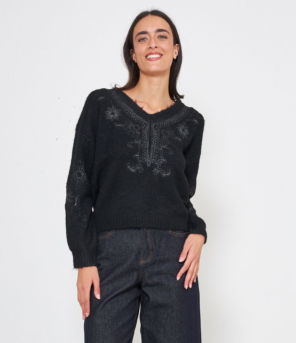 Maglia in viscosa effetto peluche modello over con scollo a v e ricami.