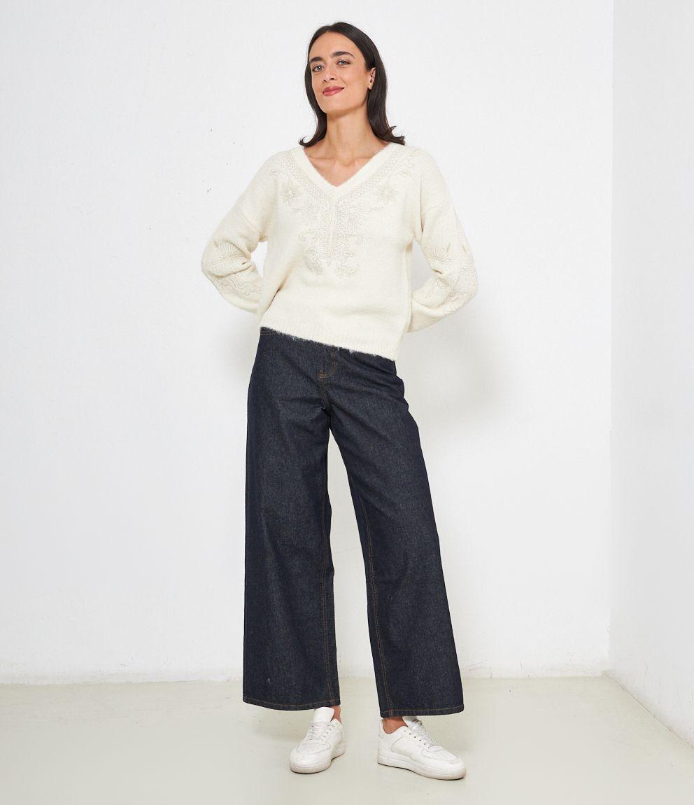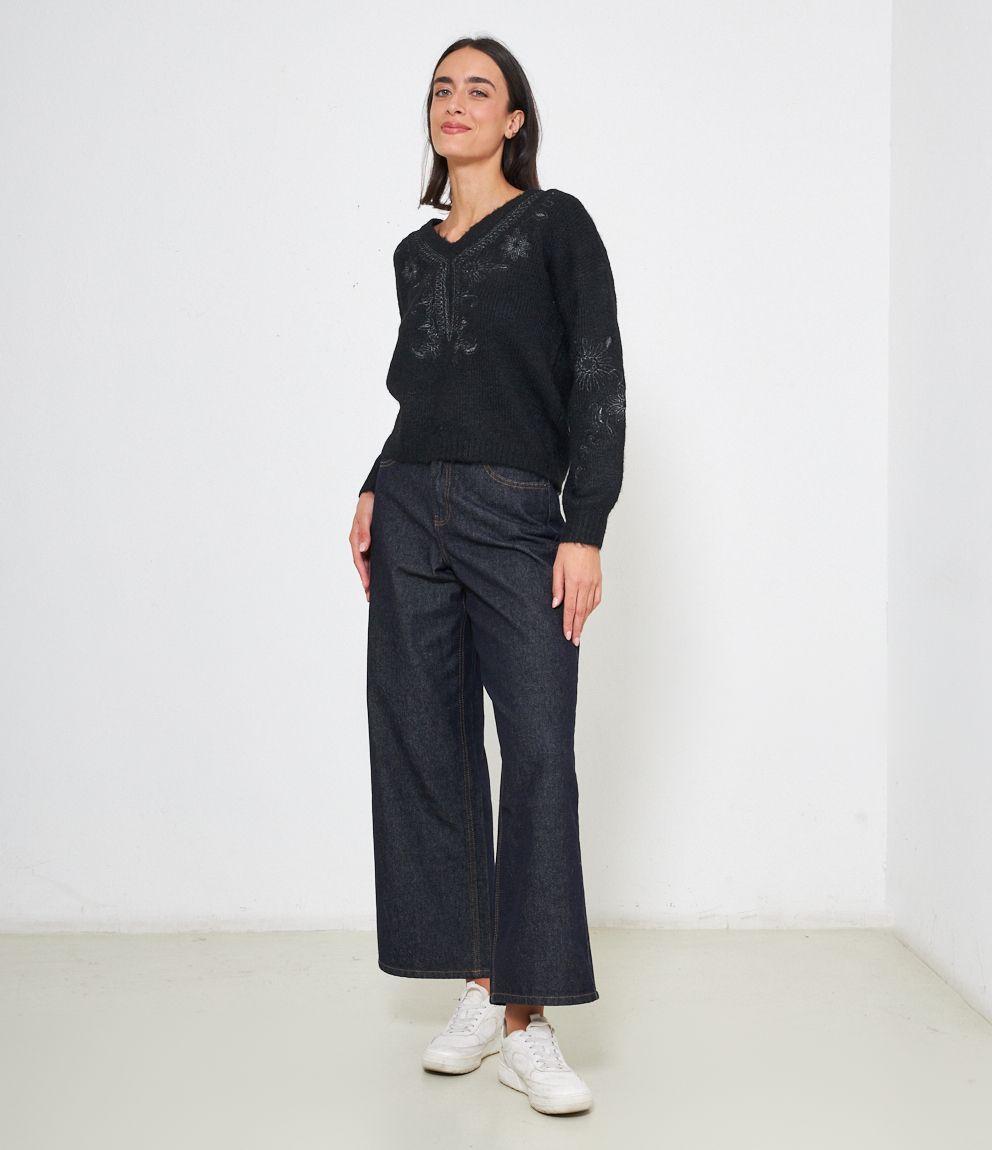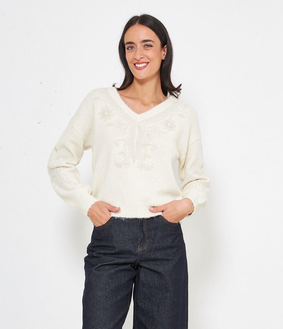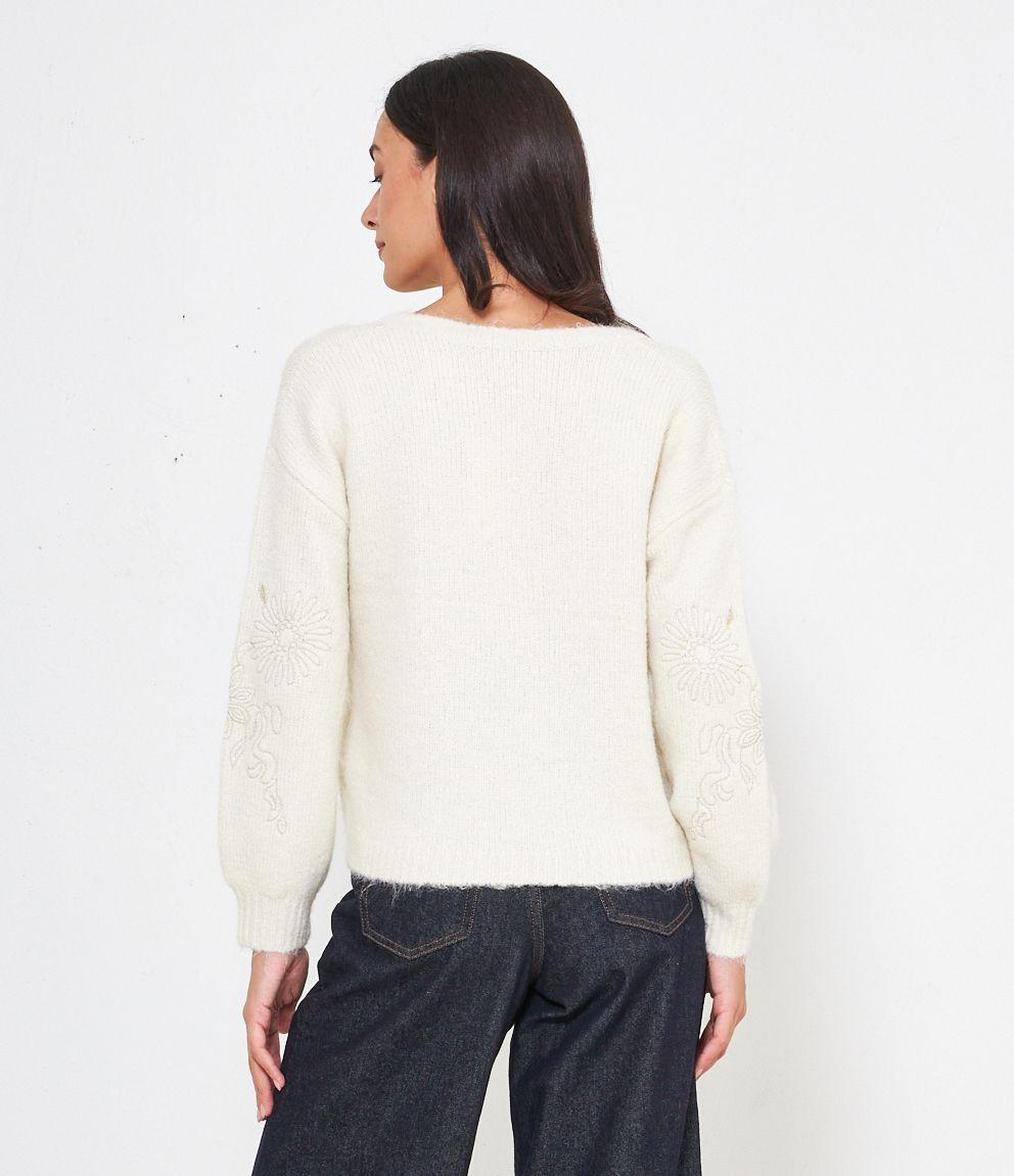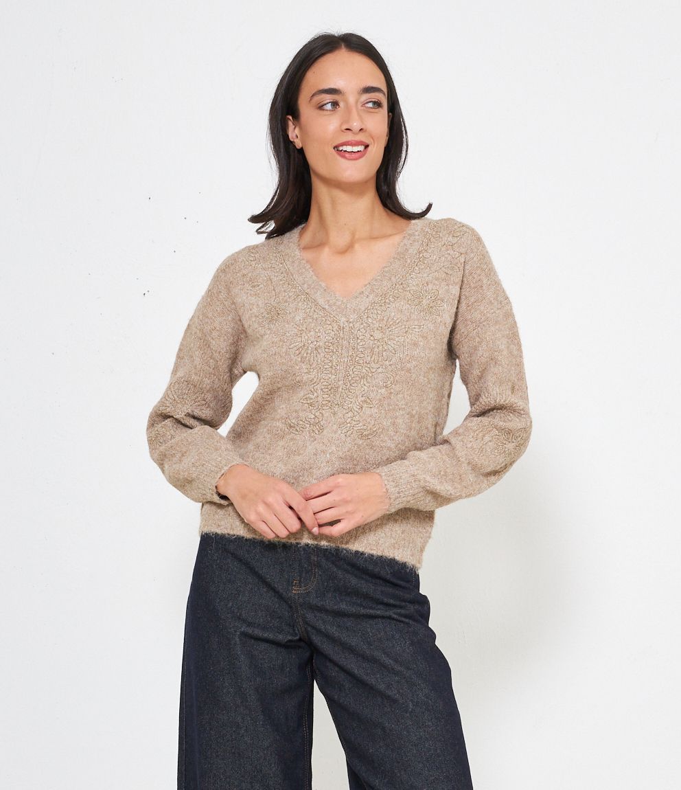 Maglia in viscosa effetto peluche modello over con scollo a v e ricami.