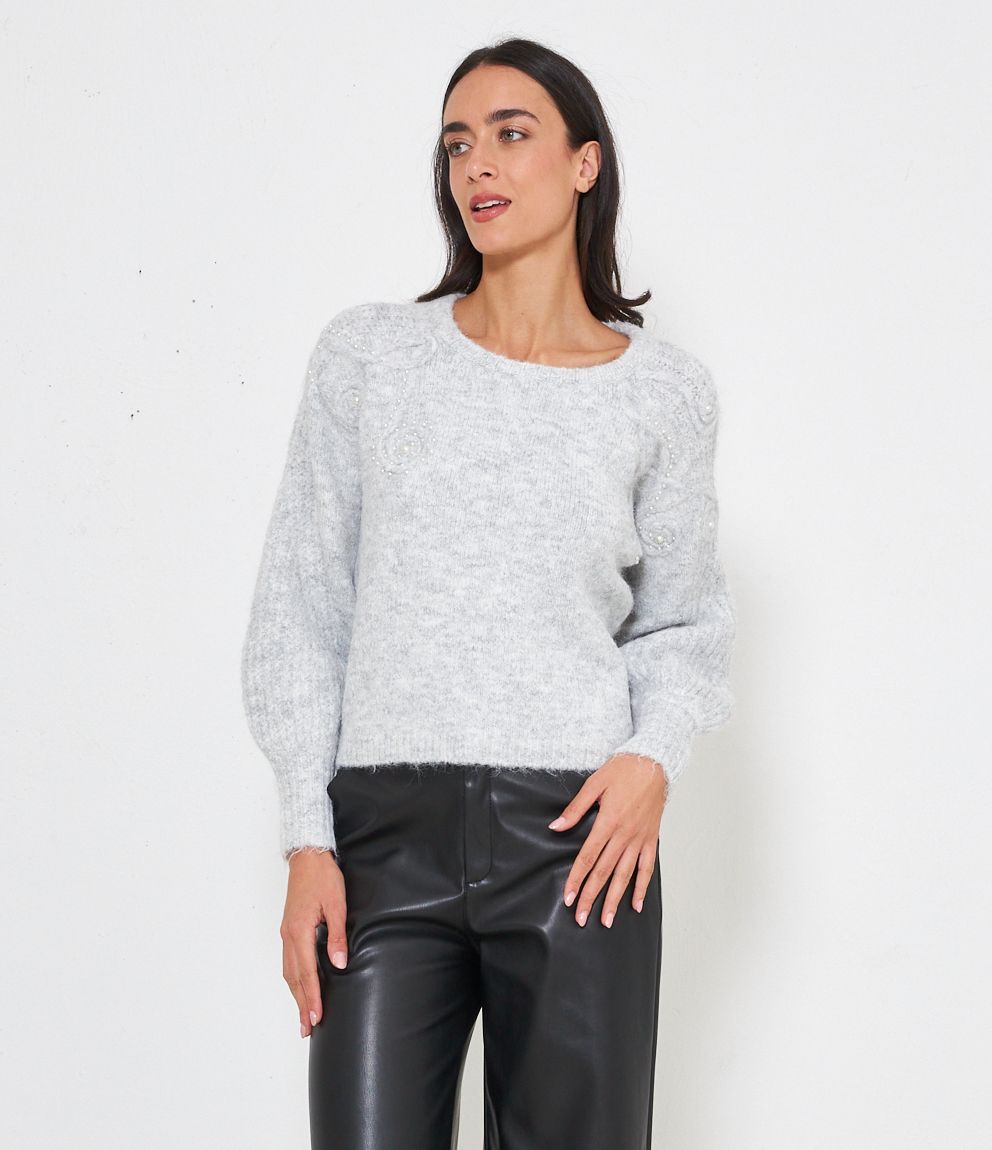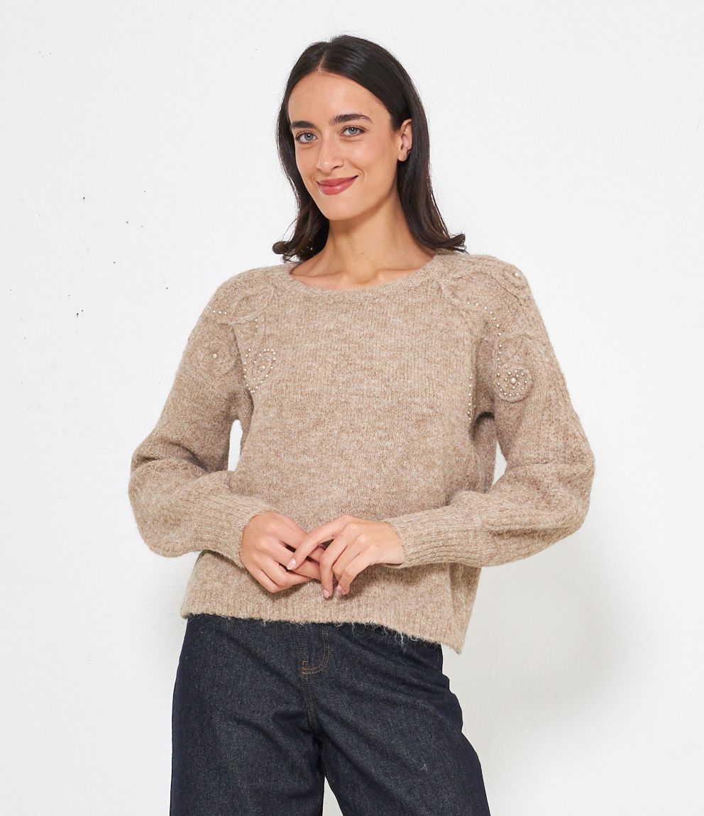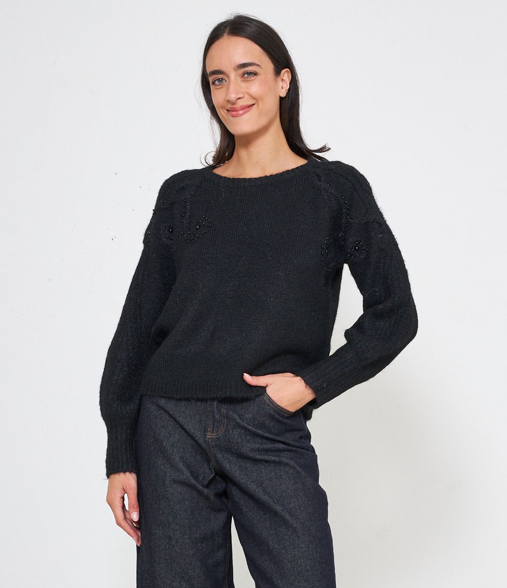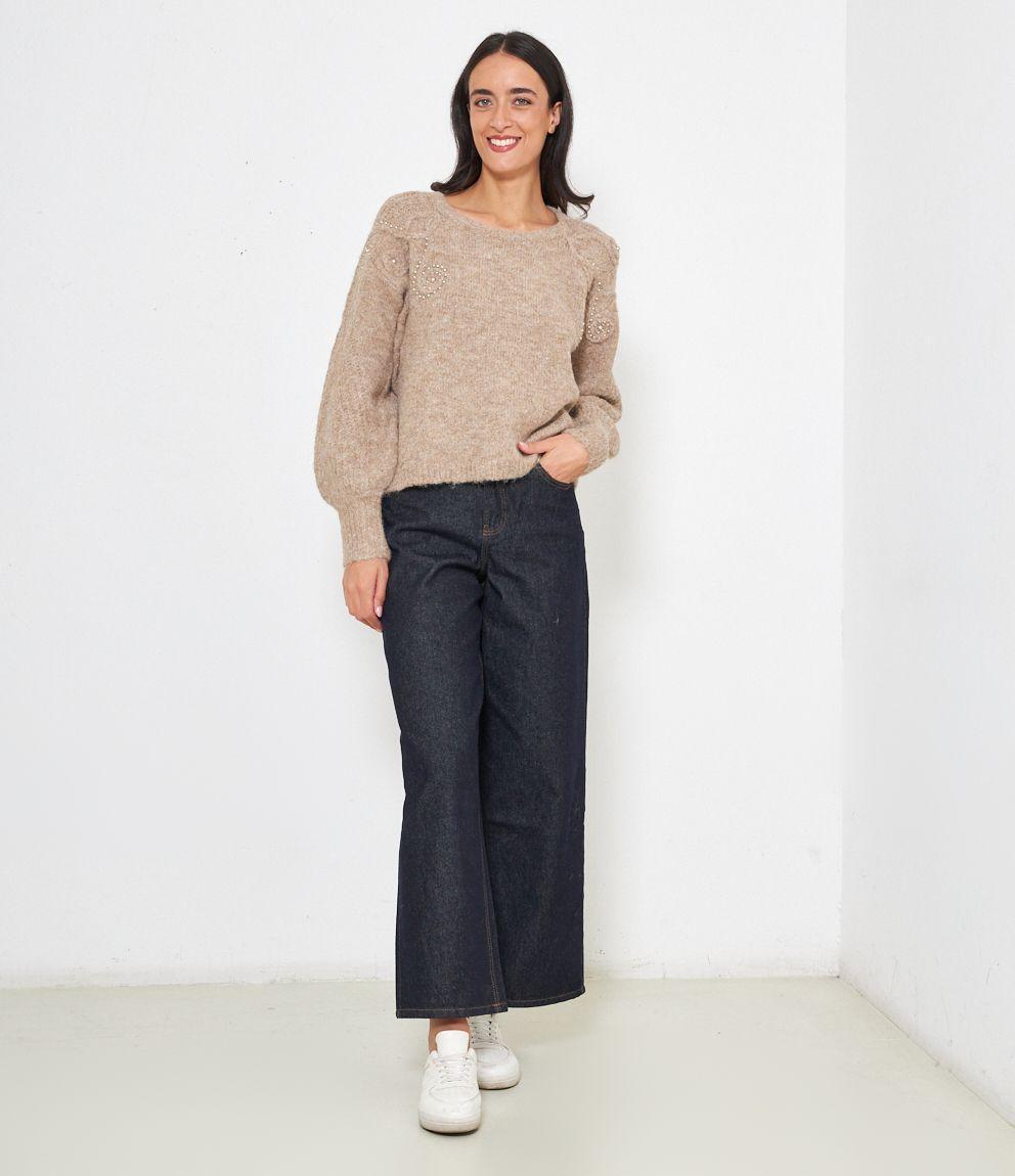 Maglia comfy con trama a rilievo e perle, scollo tondo e bordi a costine.