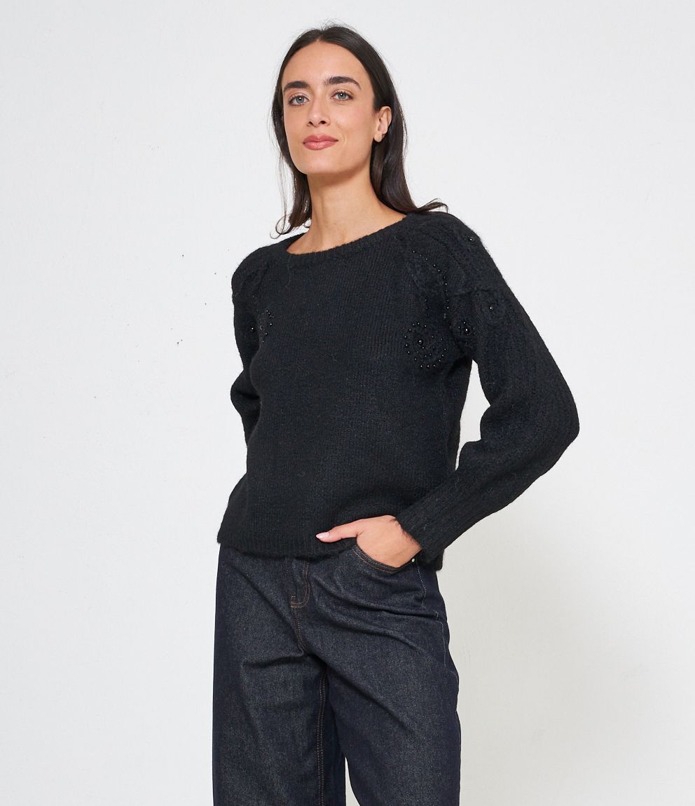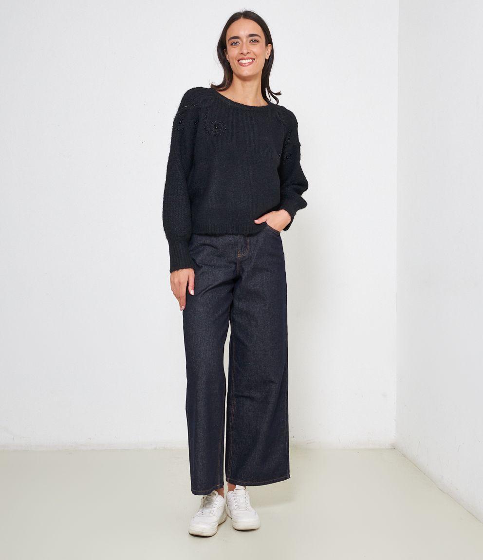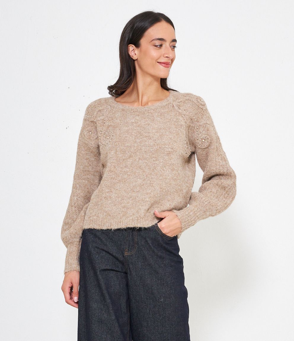 Maglia comfy con trama a rilievo e perle, scollo tondo e bordi a costine.