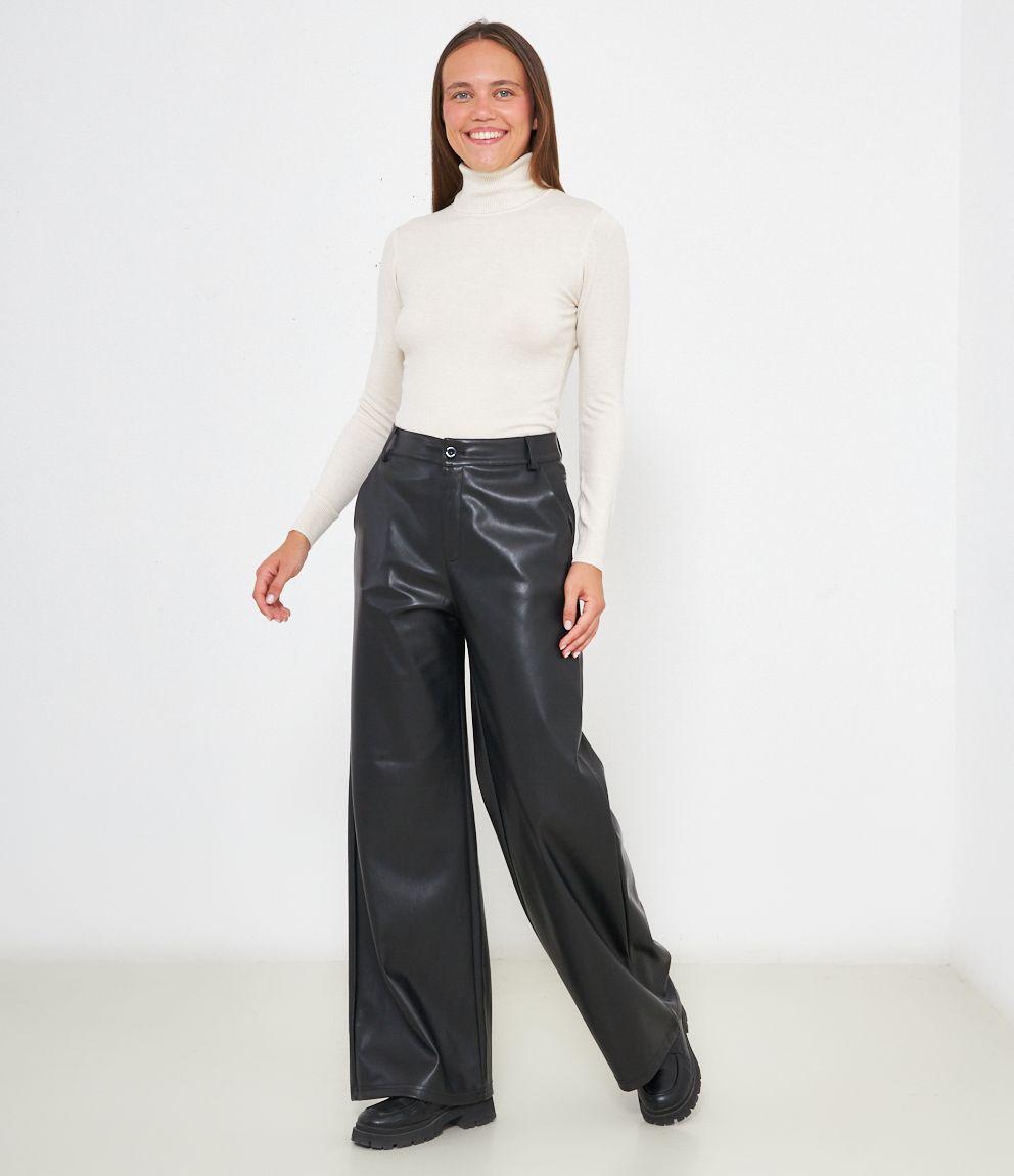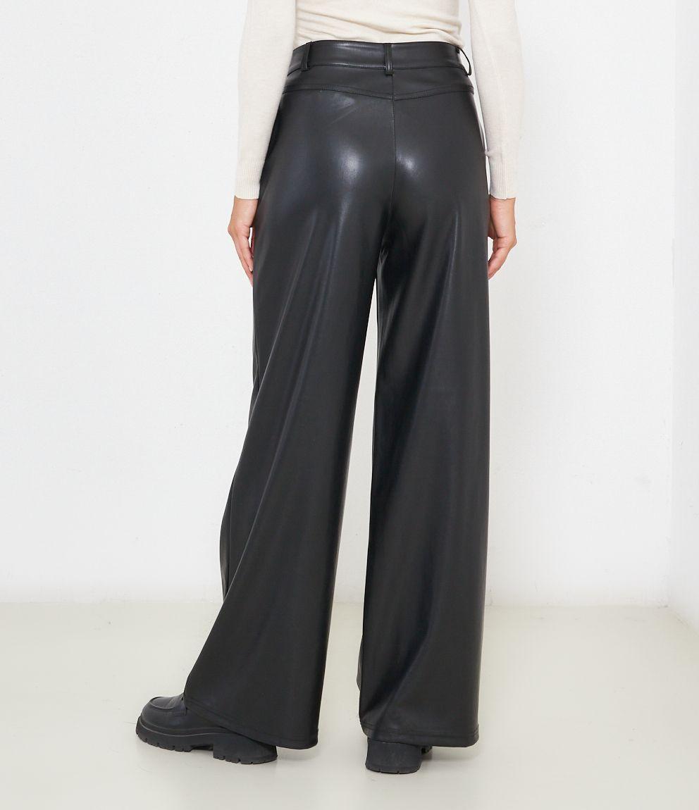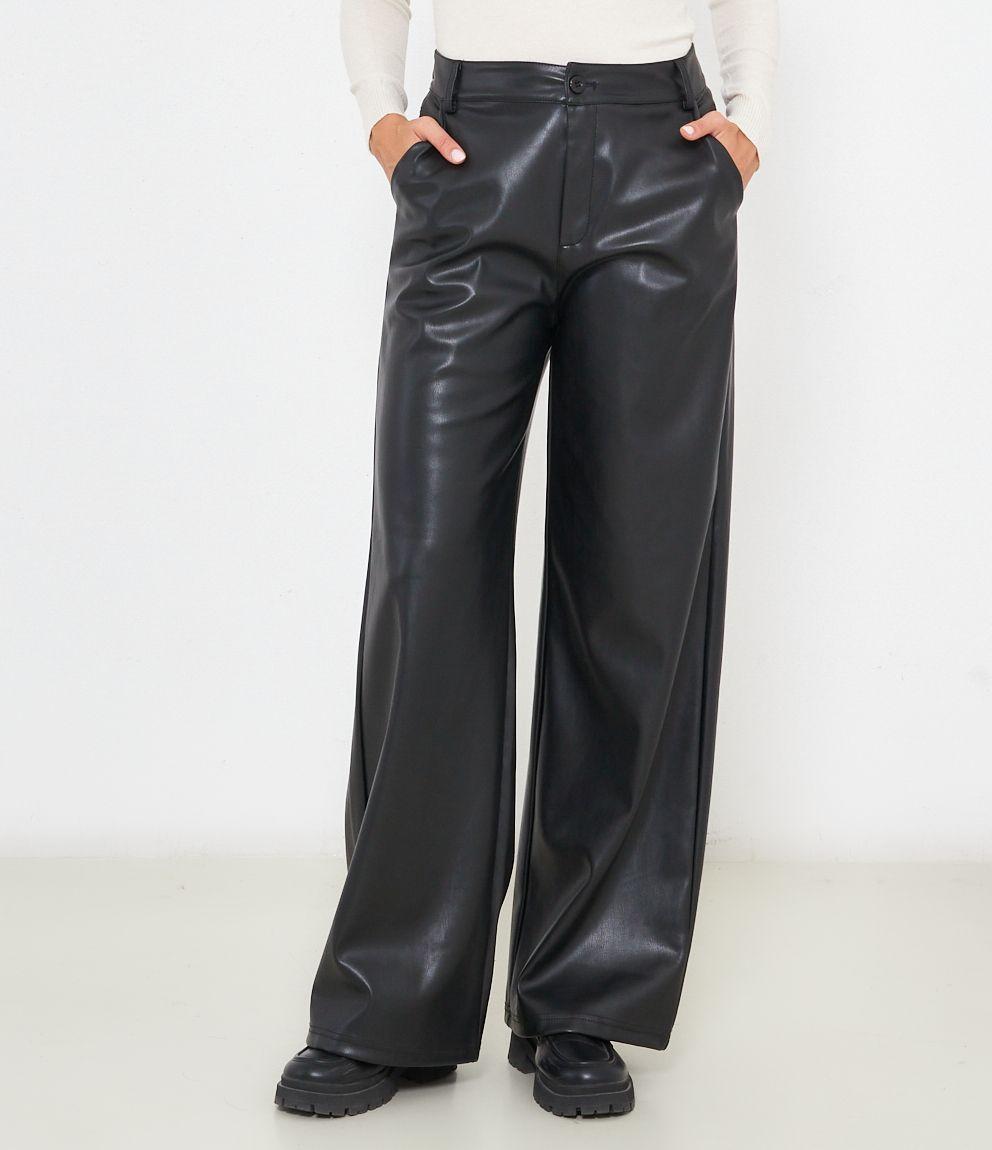Pantaloni effetto pelle, modello palazzo con tasche laterali e chiusura con zip e bottone.