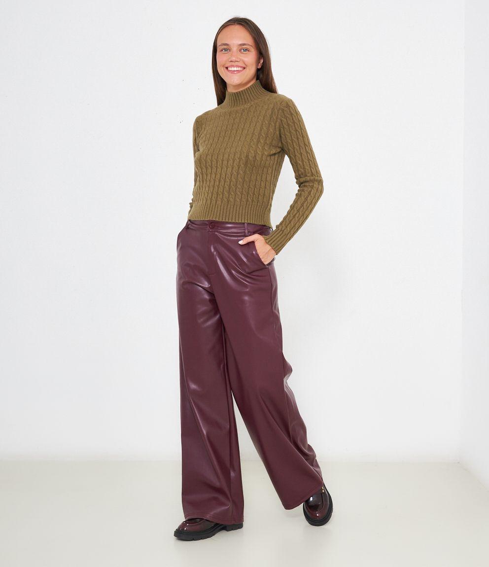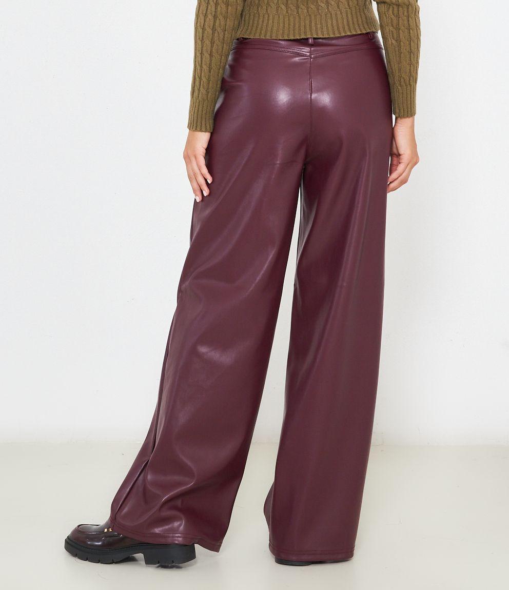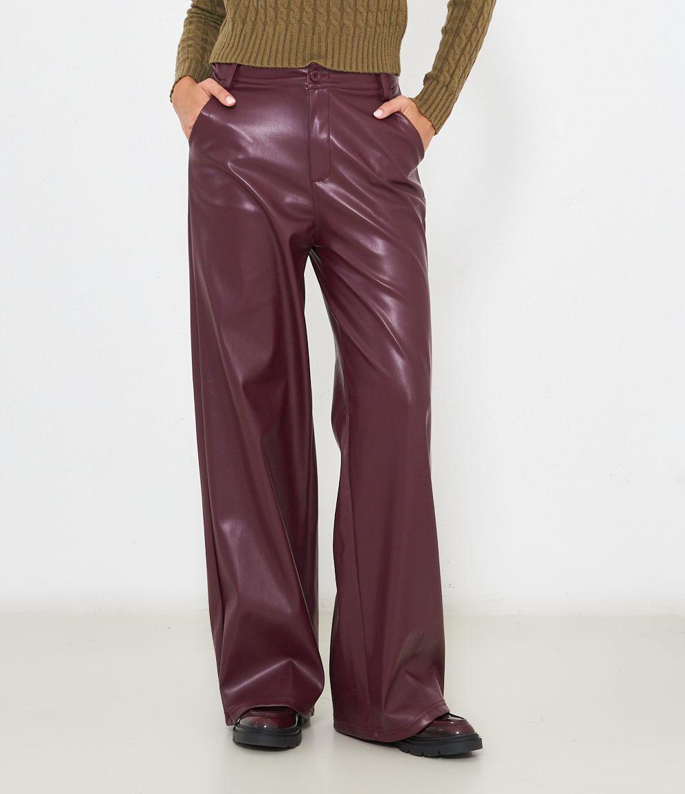 Pantaloni effetto pelle, modello palazzo con tasche laterali e chiusura con zip e bottone.
