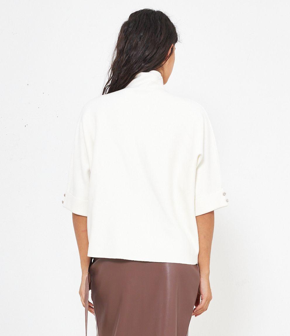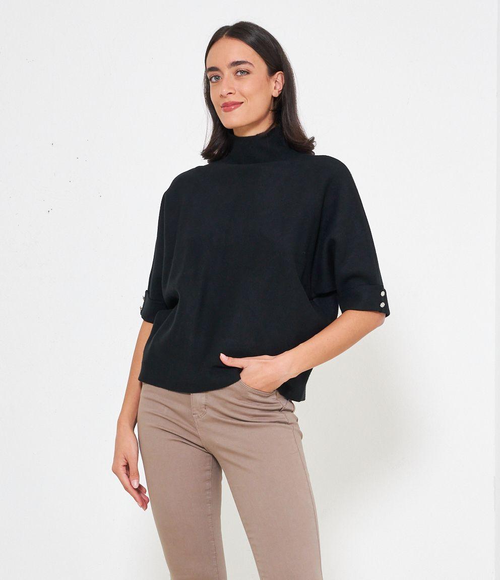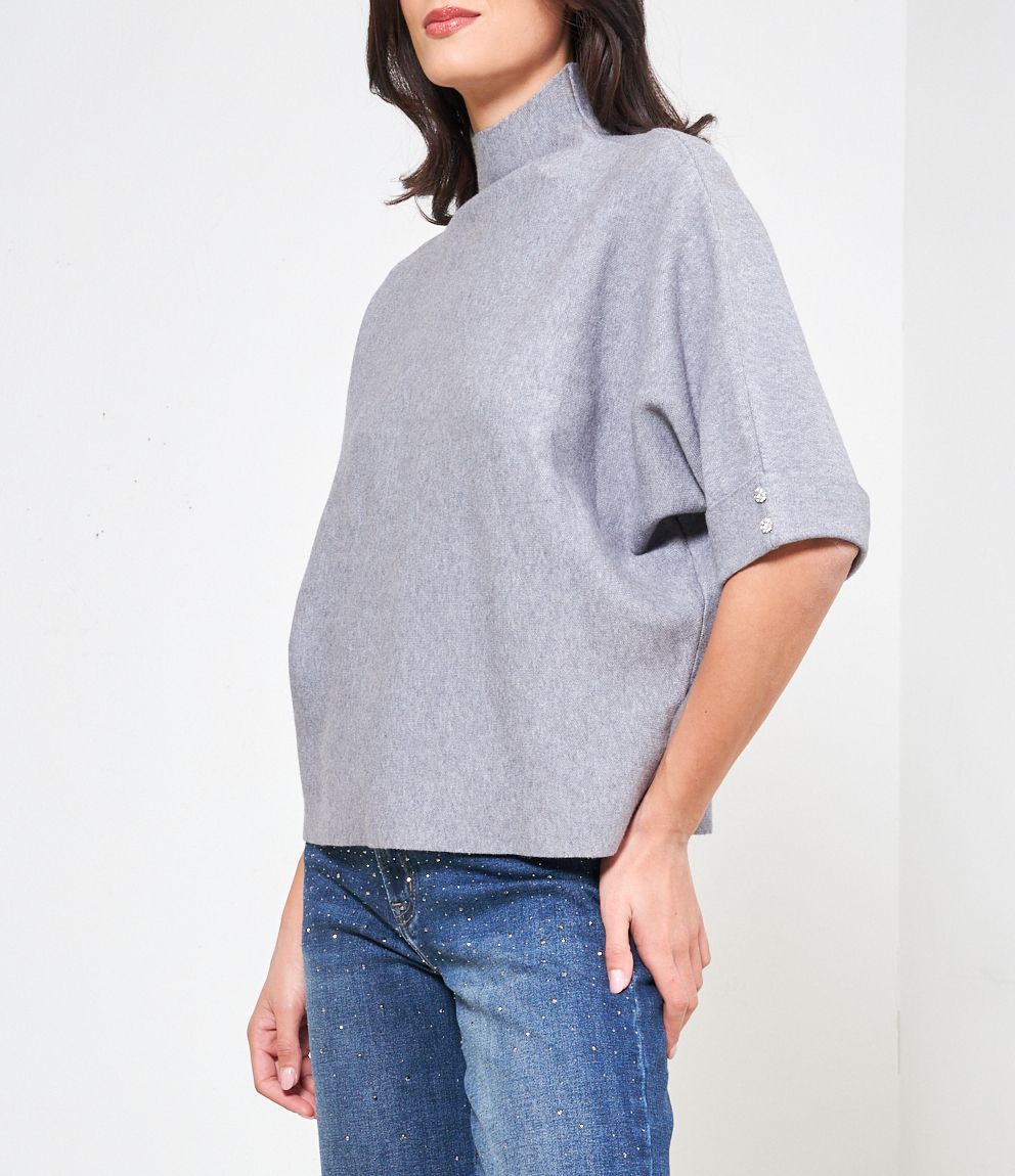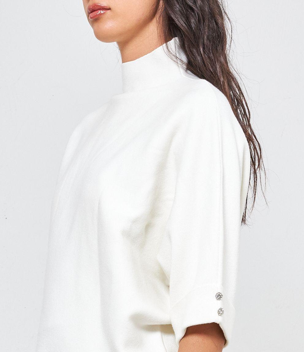 Maglia modello over con maniche a tre quarti e collo alto. Dettaglio bottoni gioiello sulle maniche.