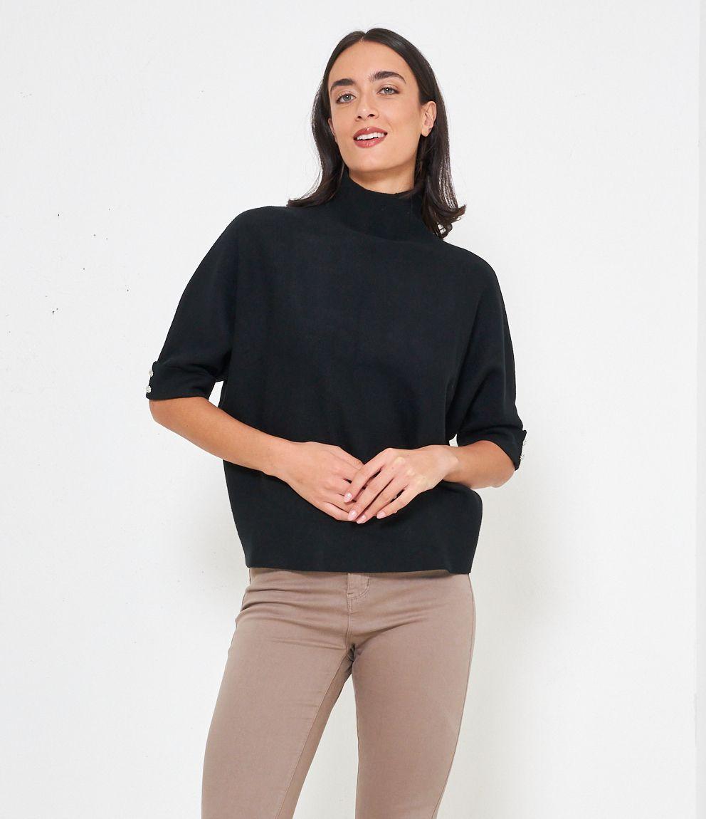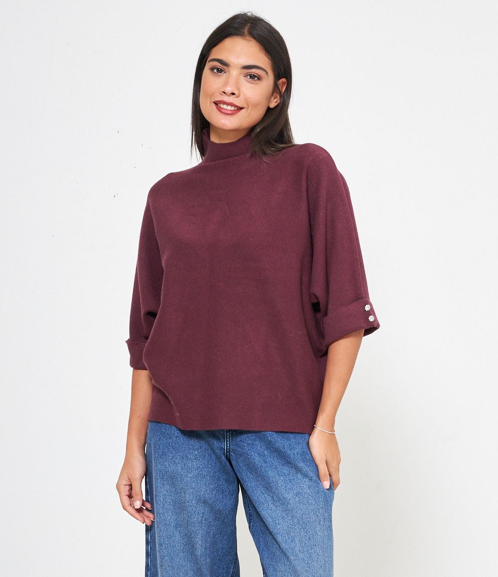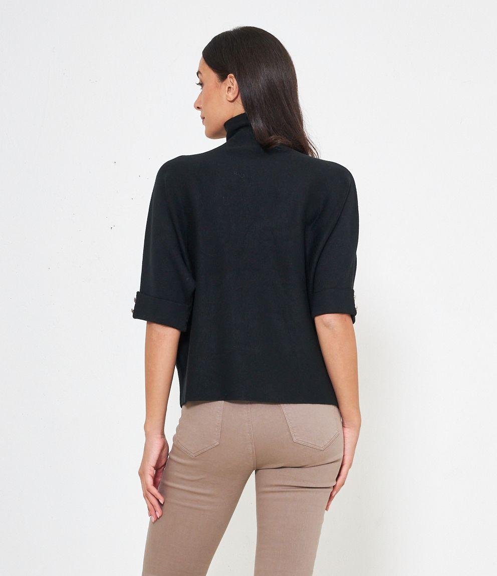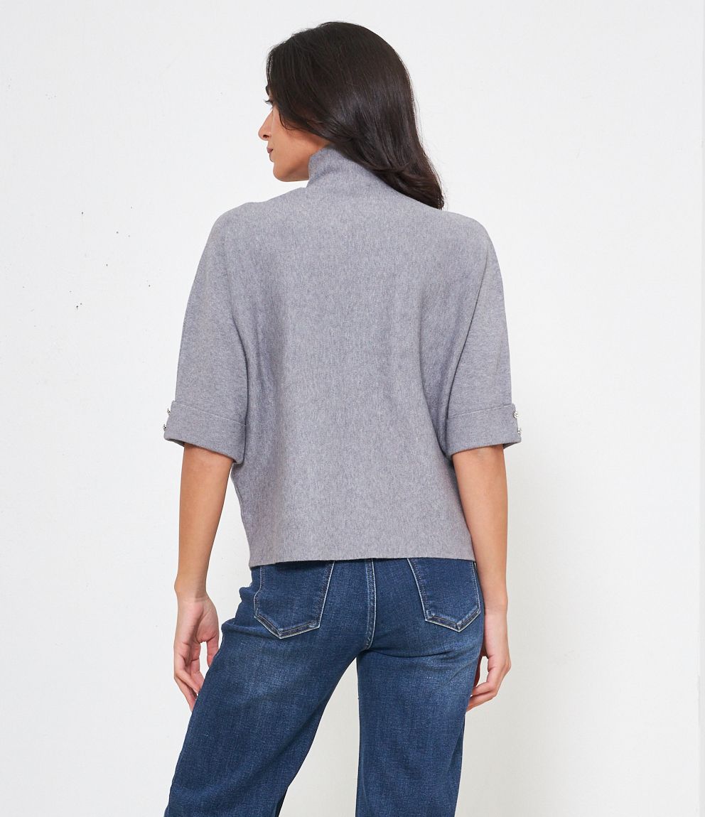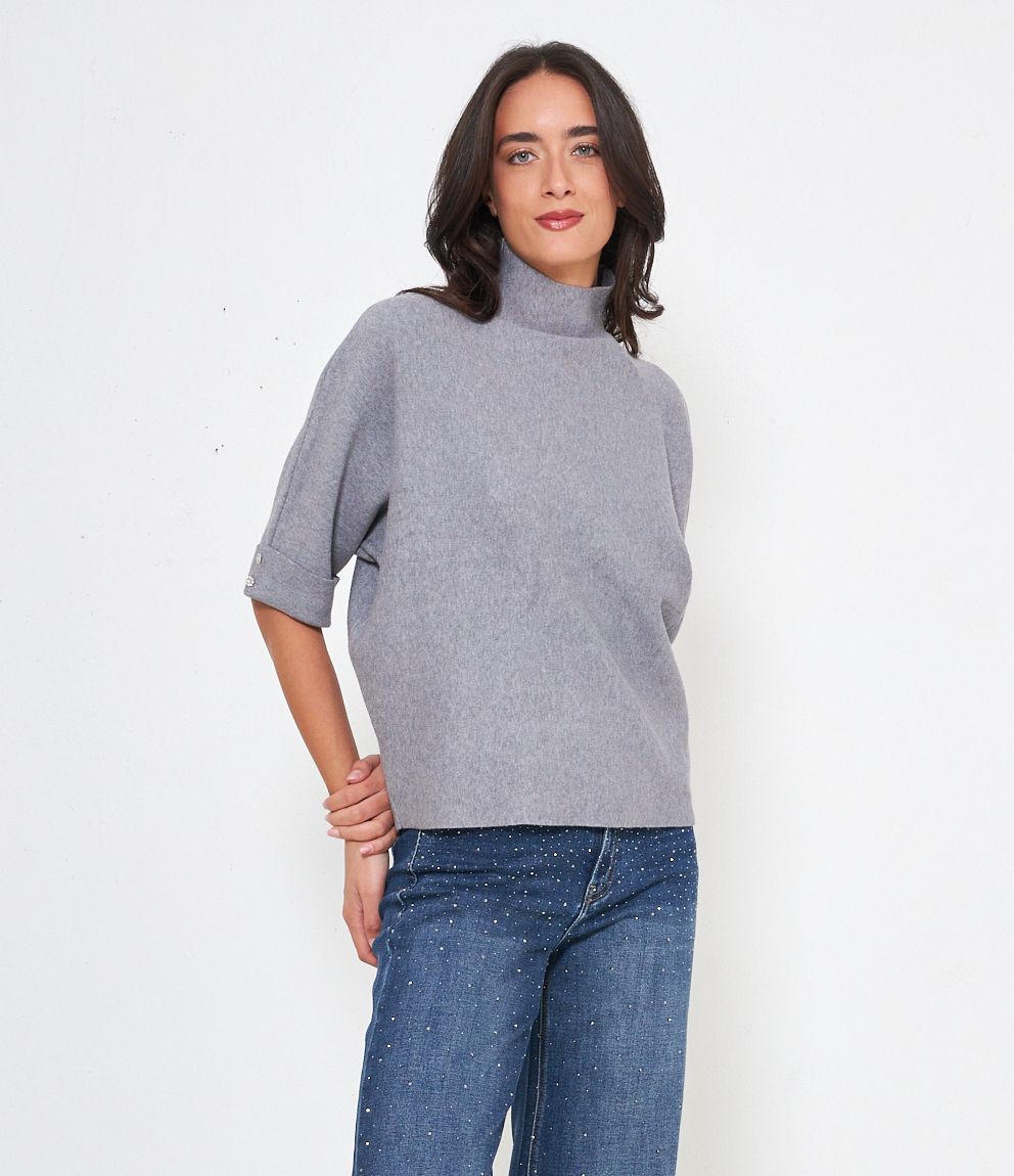 Maglia modello over con maniche a tre quarti e collo alto. Dettaglio bottoni gioiello sulle maniche.