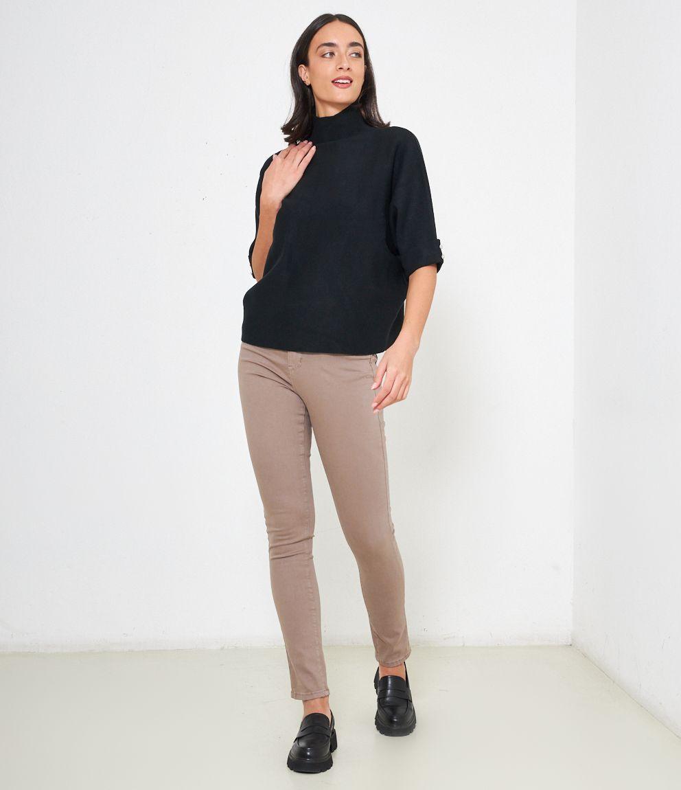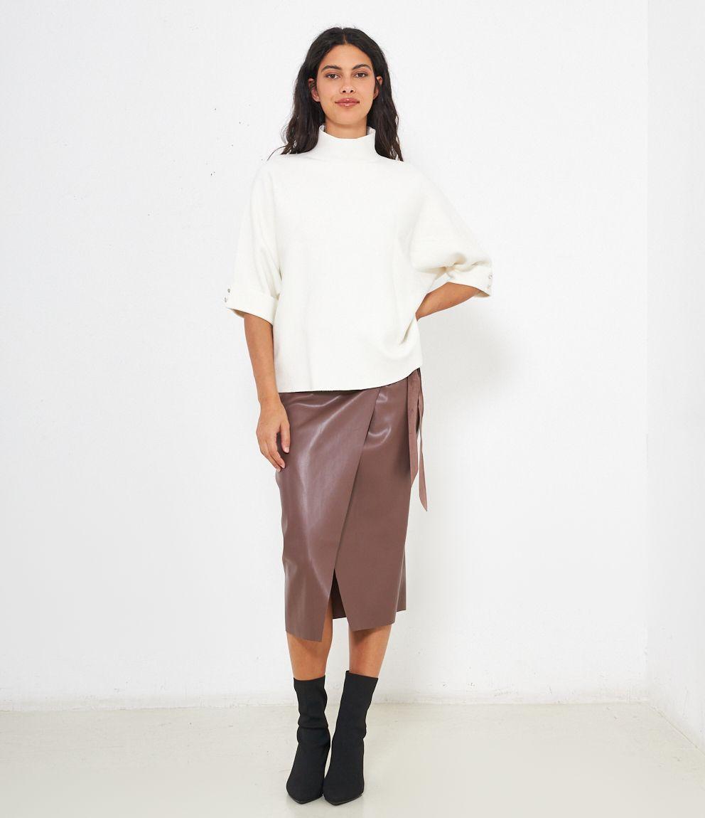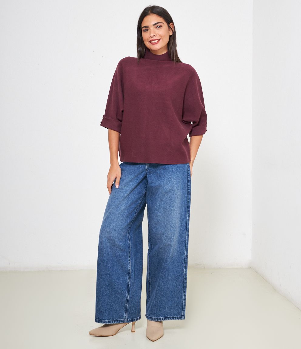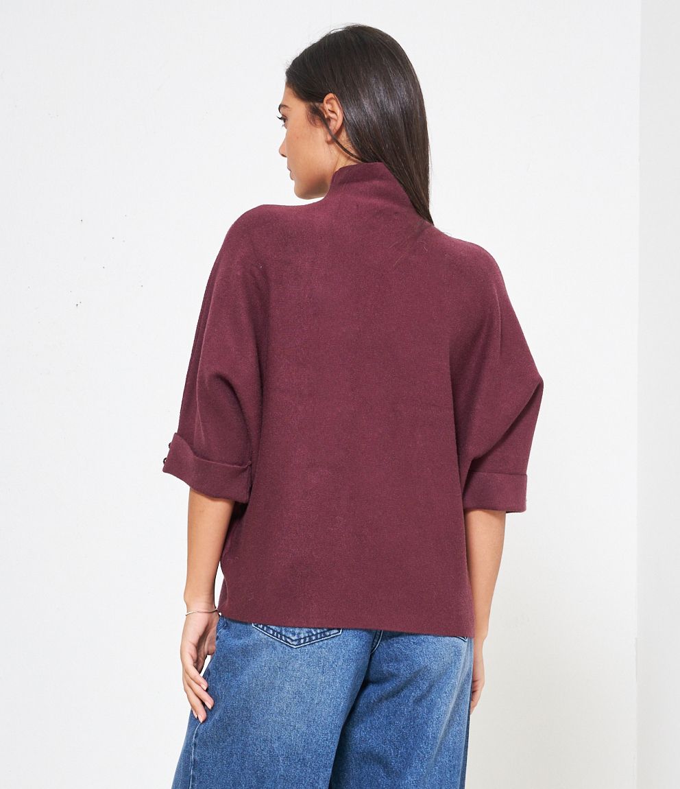 Maglia modello over con maniche a tre quarti e collo alto. Dettaglio bottoni gioiello sulle maniche.