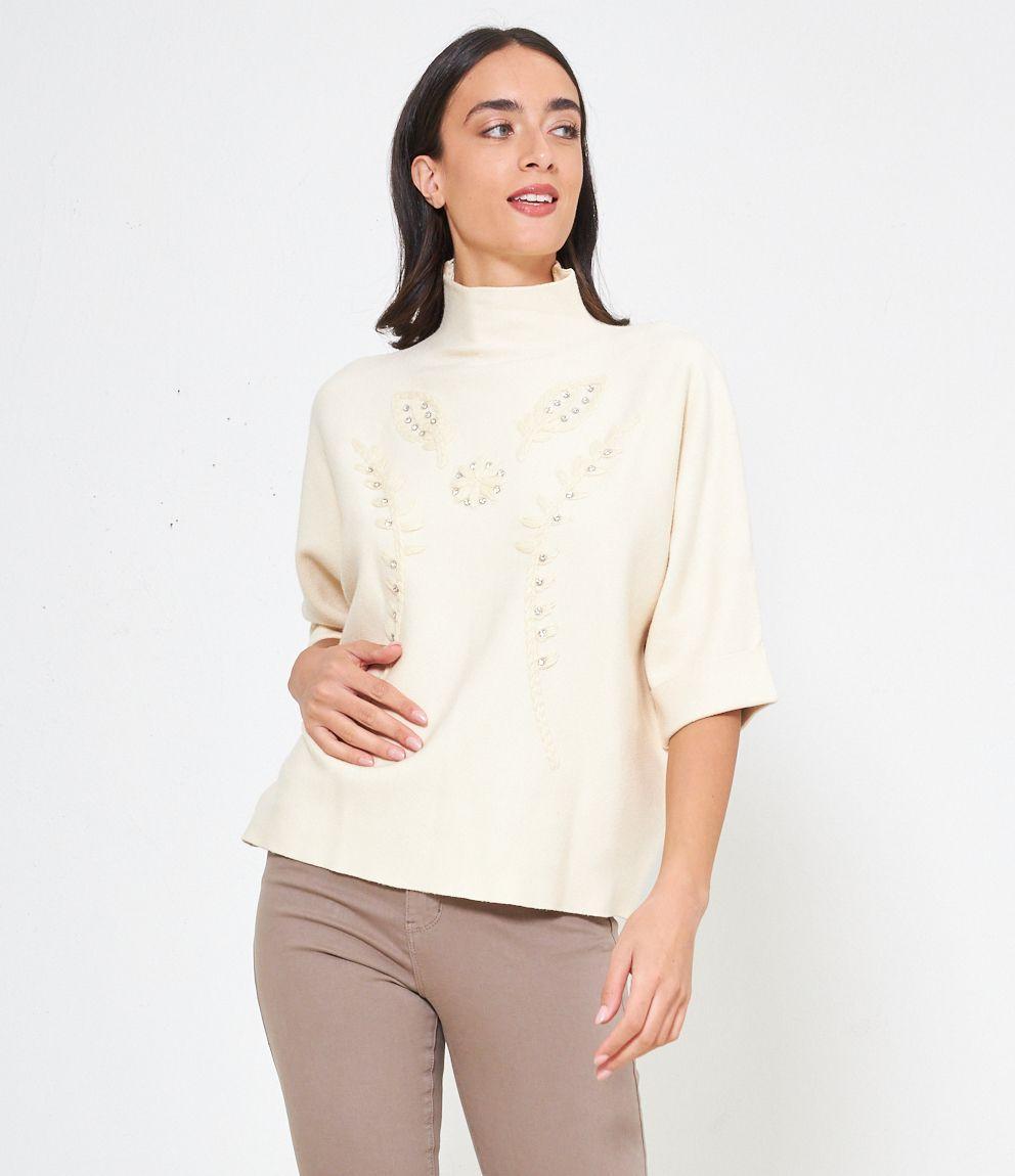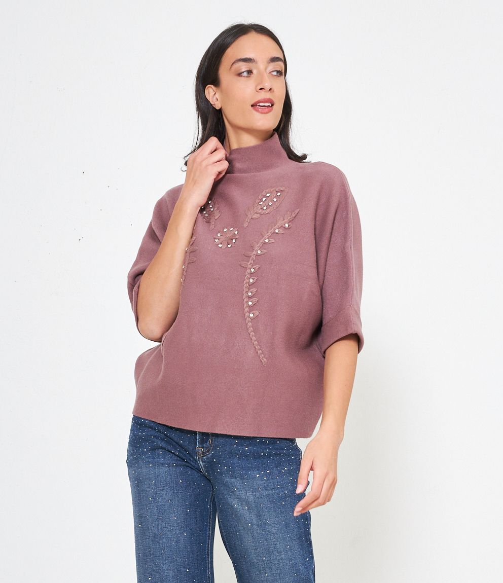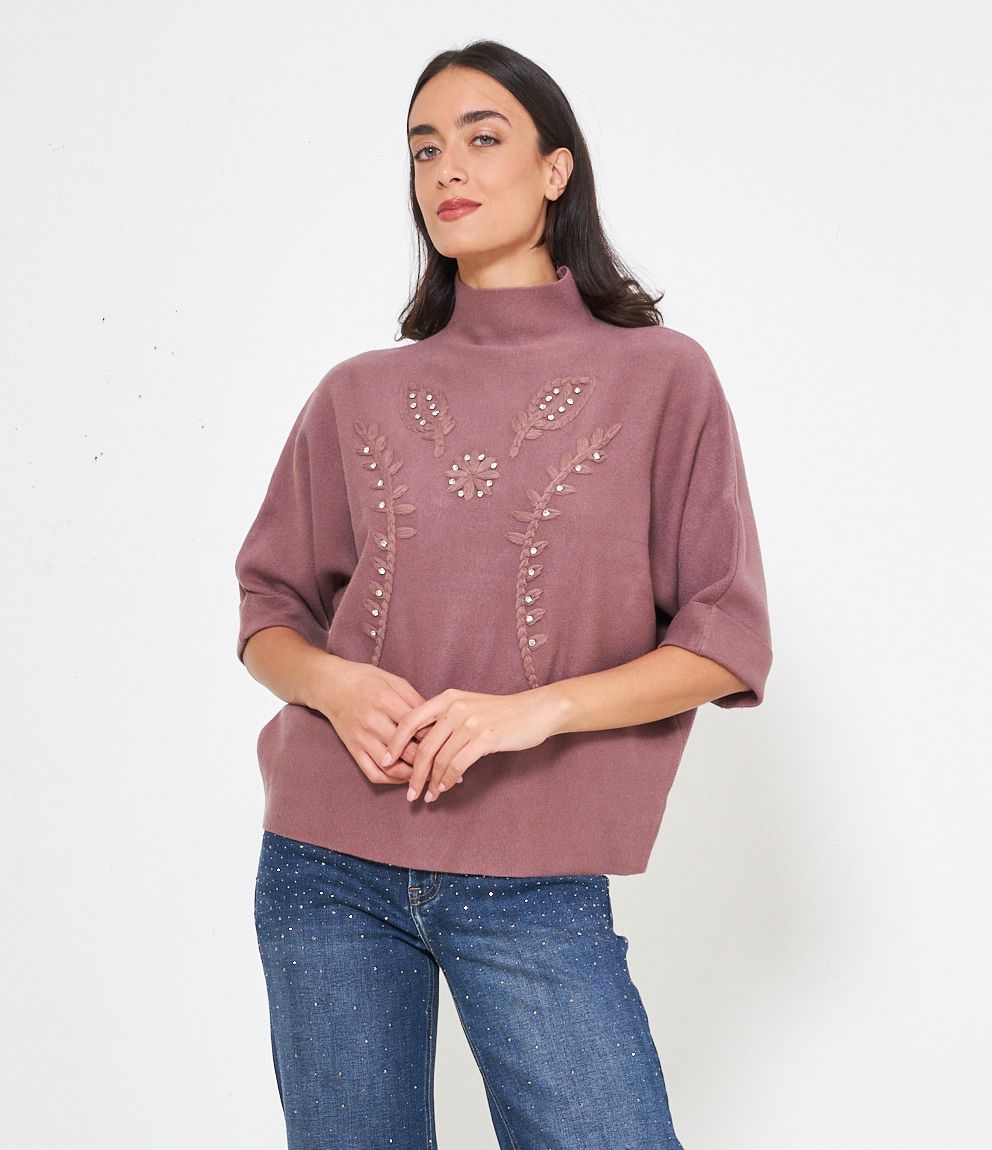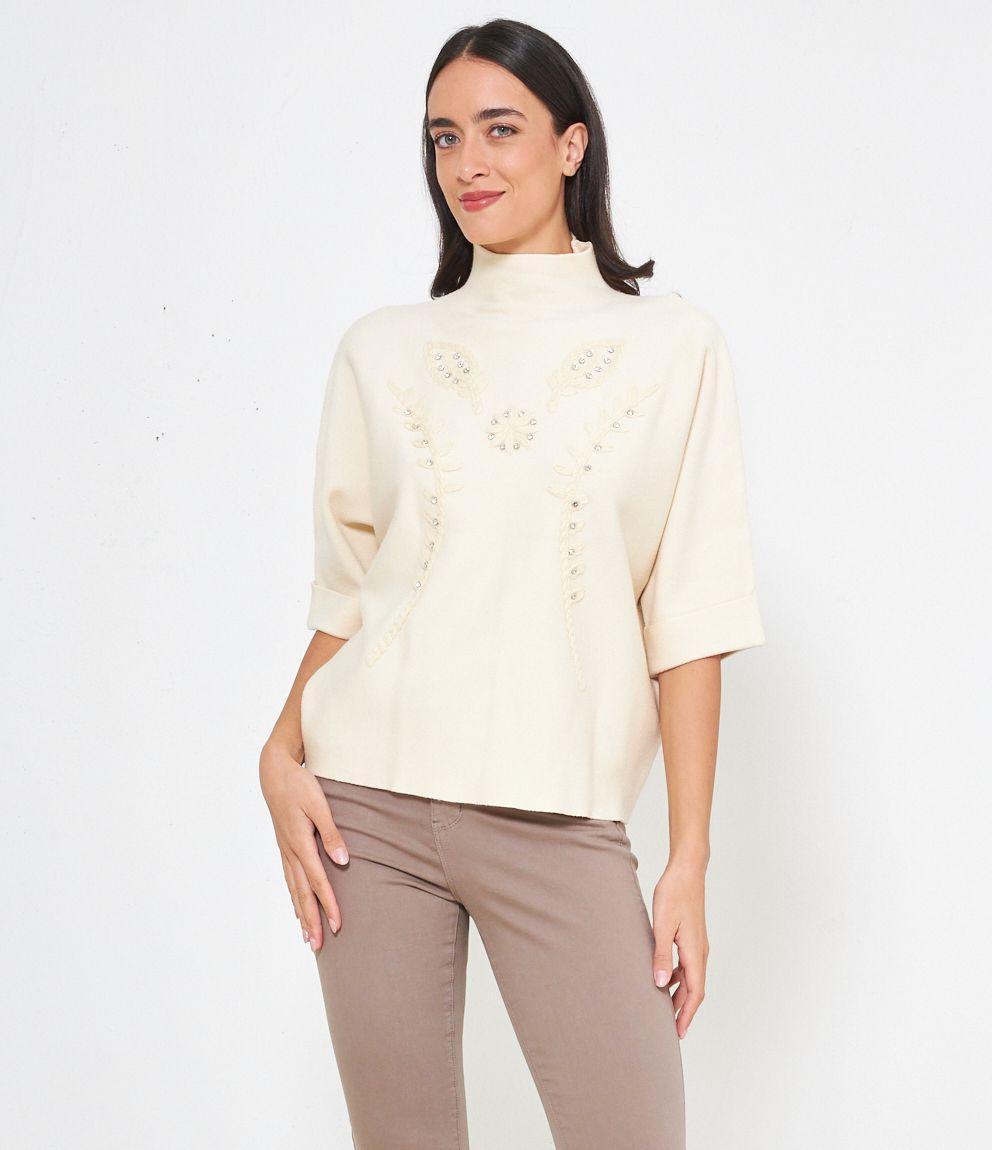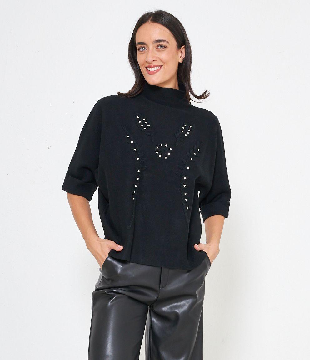 Maglia modello over con ricami a rilievo e strass, mezzo collo e maniche a tre quarti.