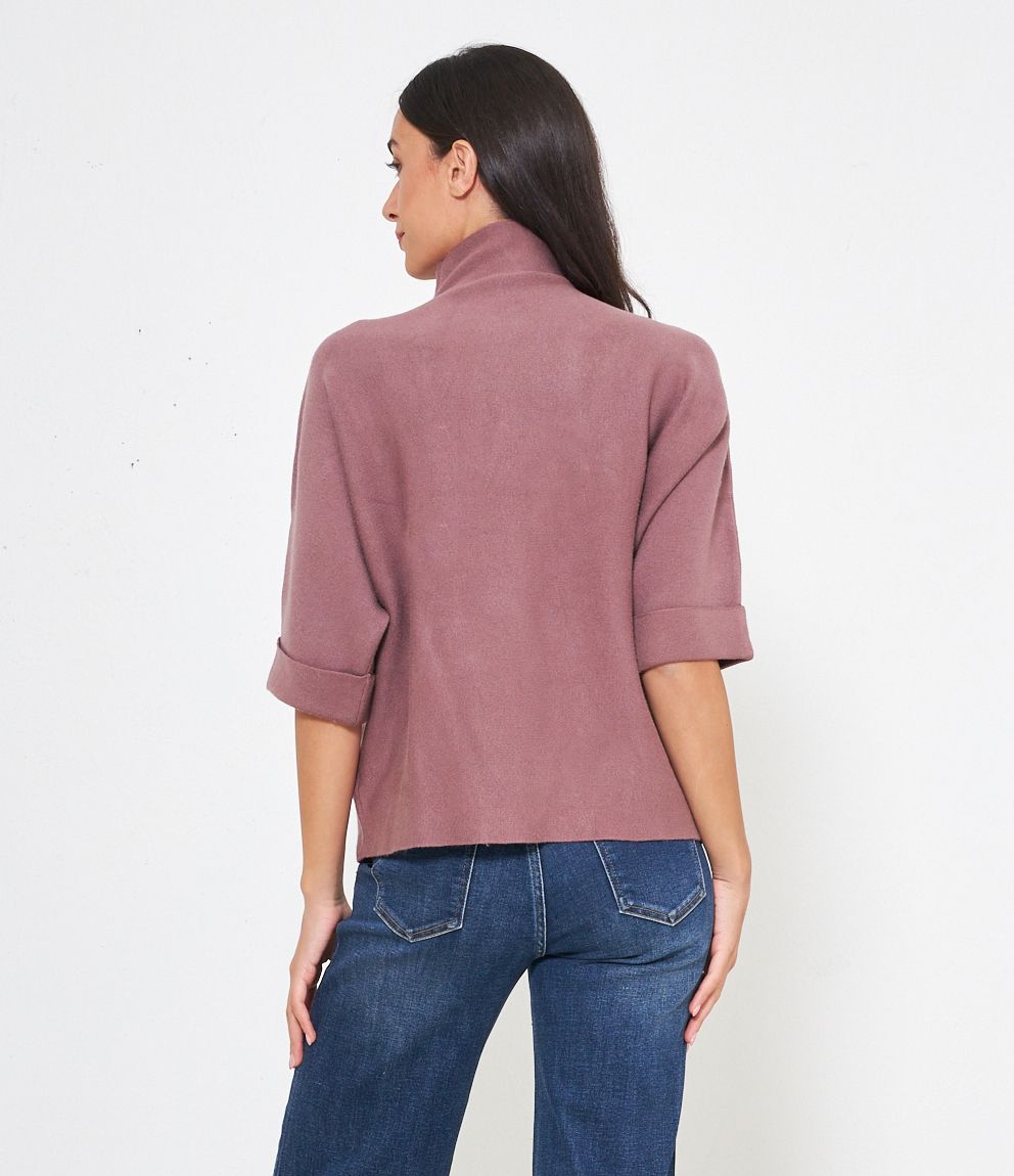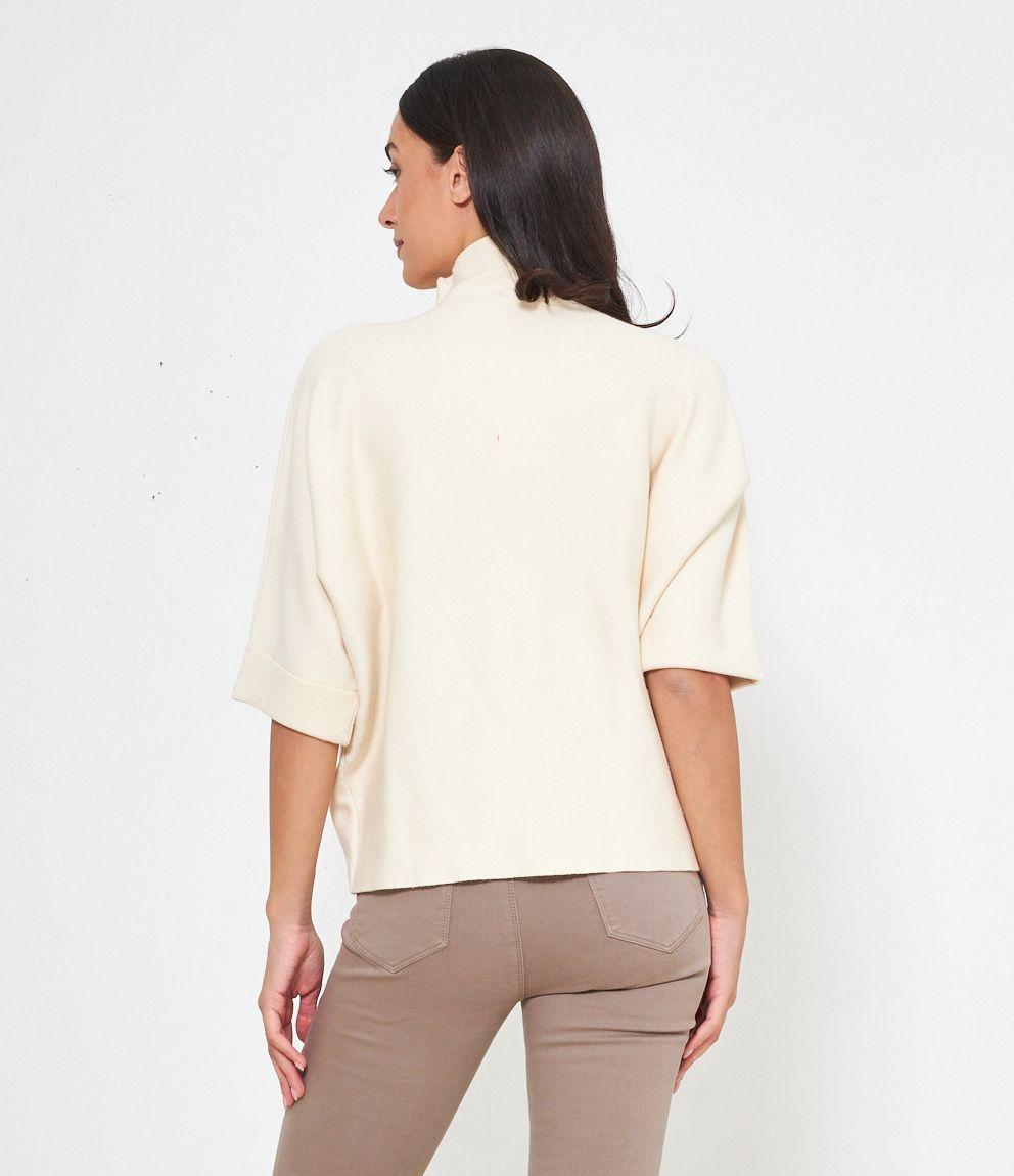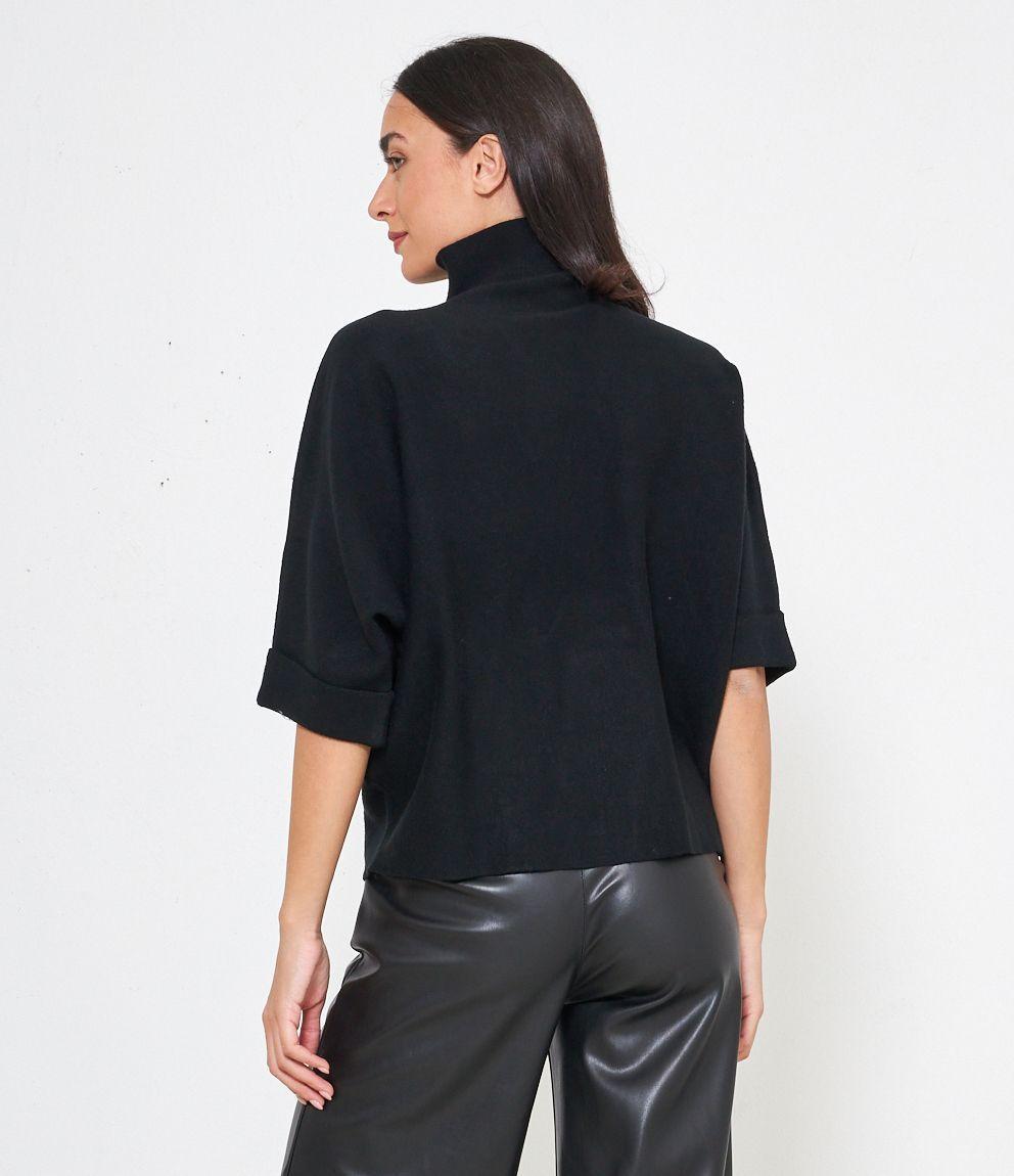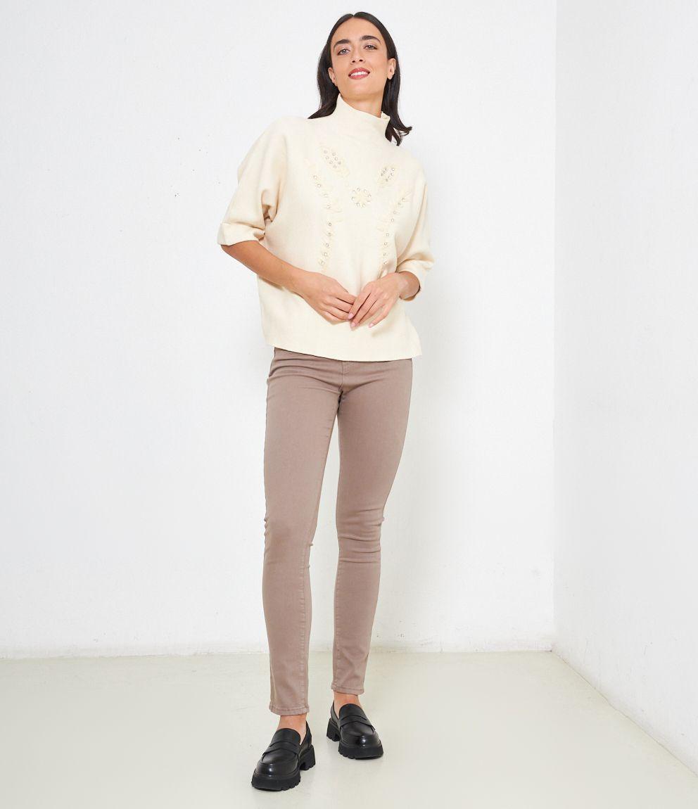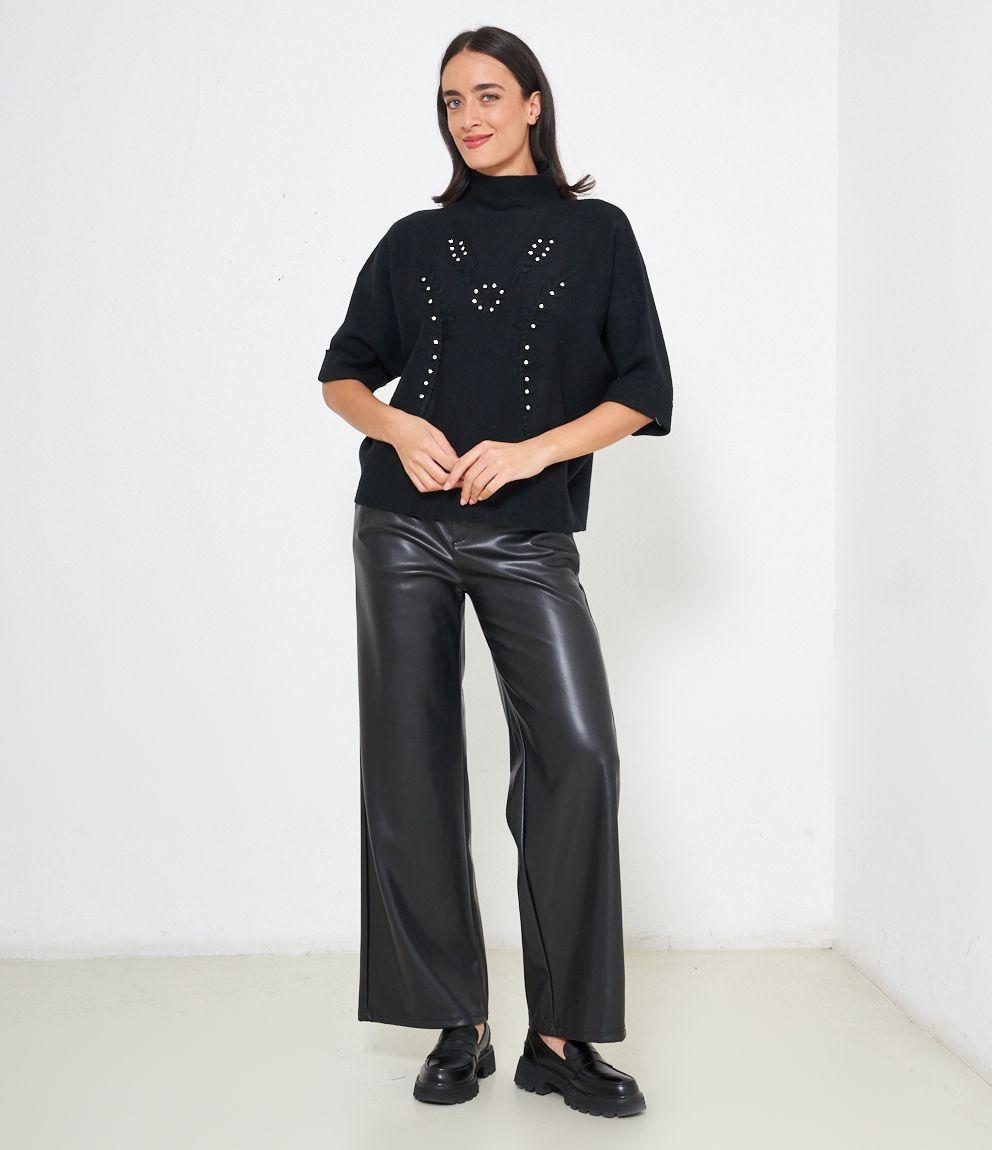 Maglia modello over con ricami a rilievo e strass, mezzo collo e maniche a tre quarti.