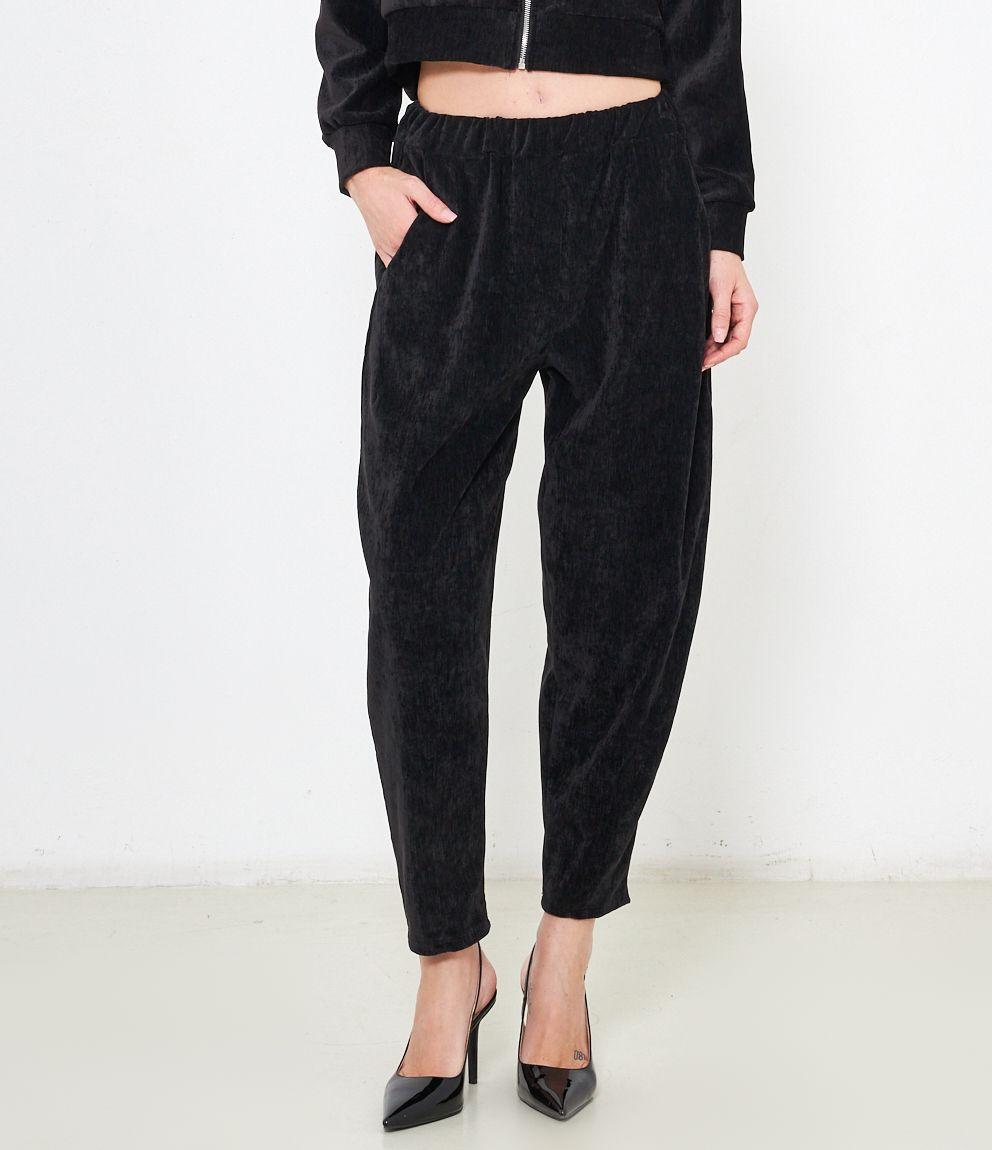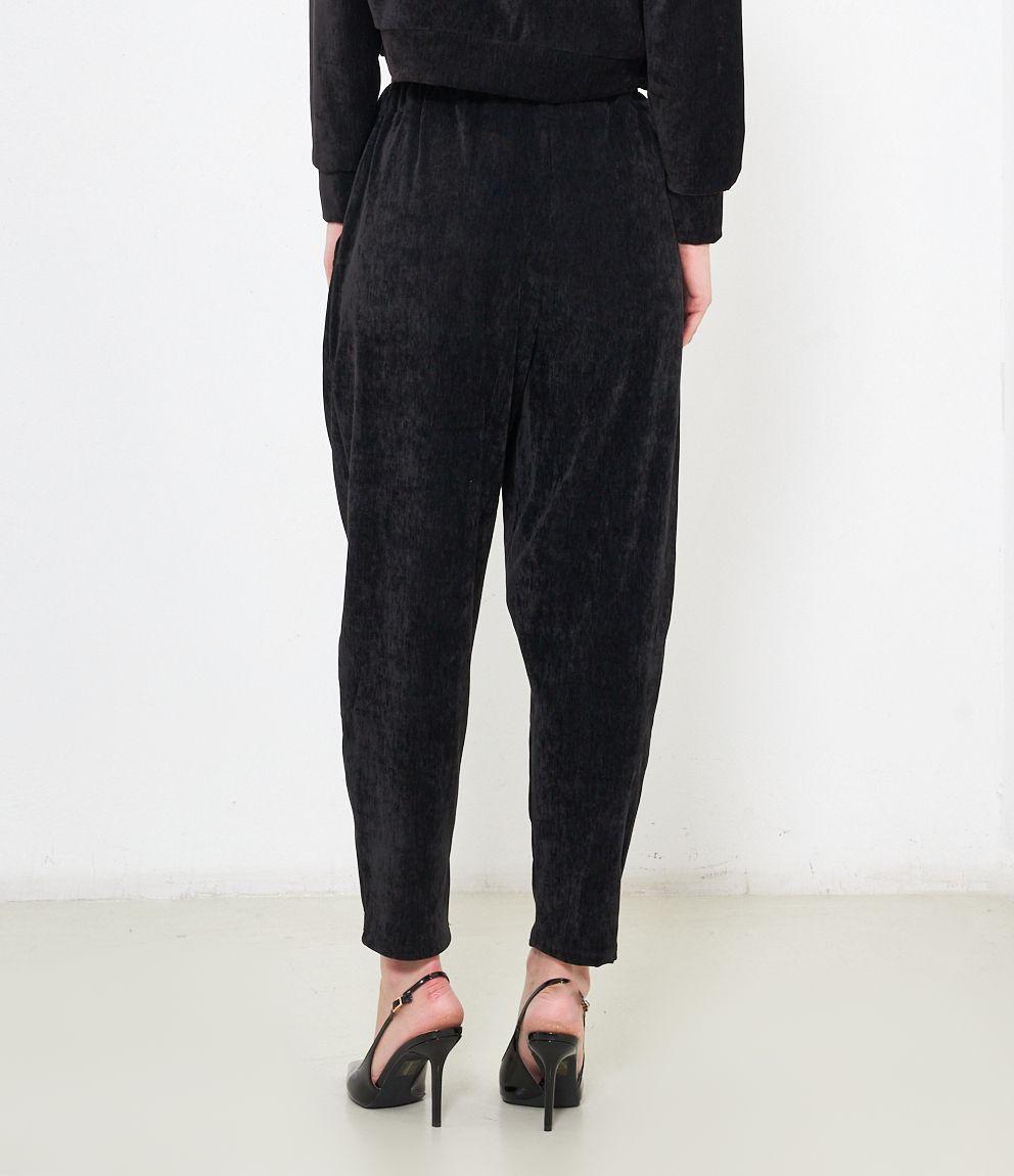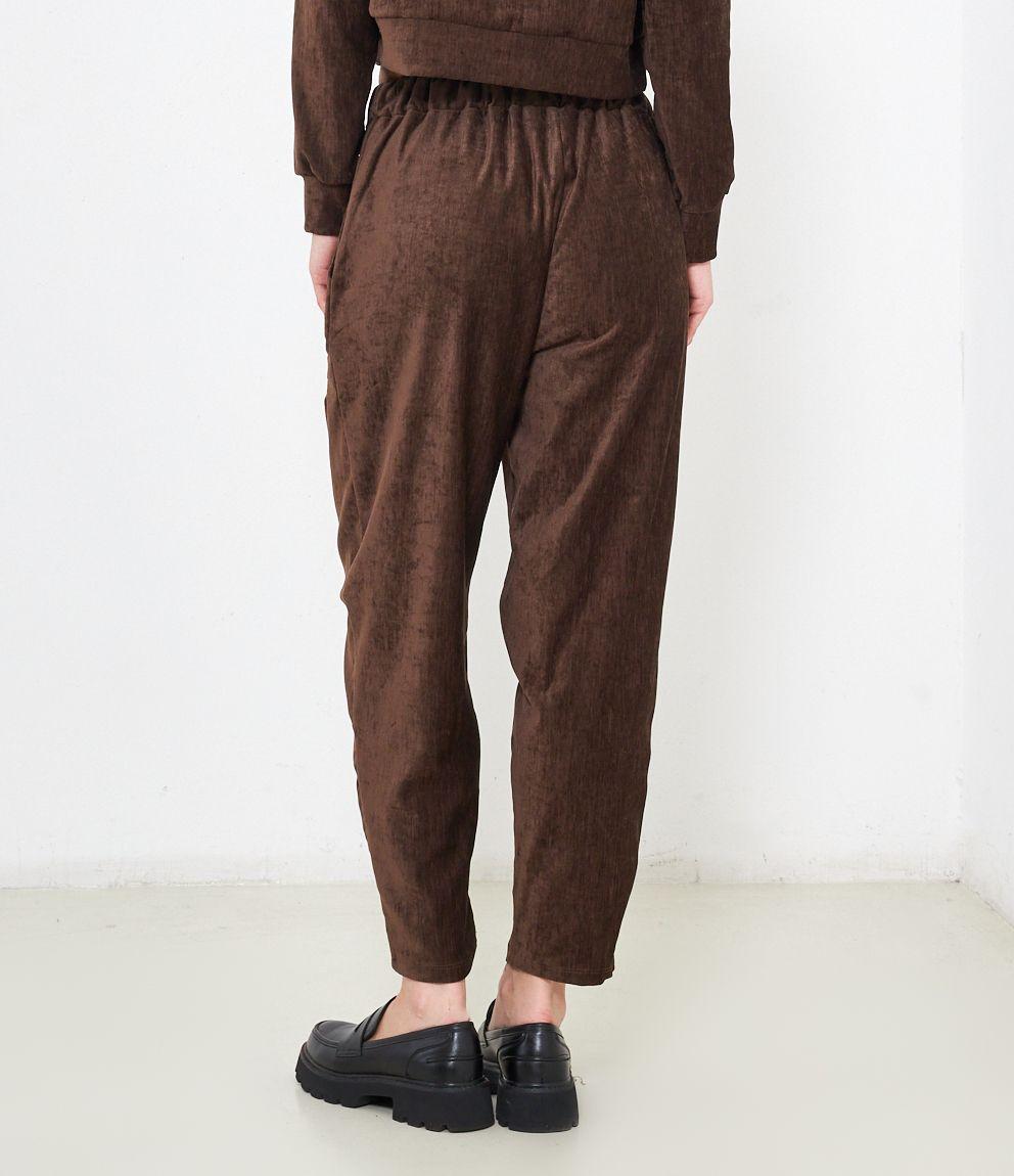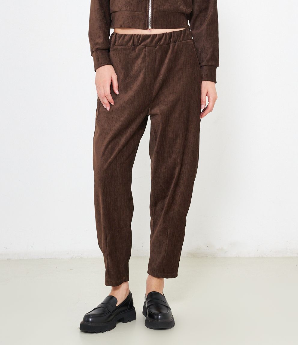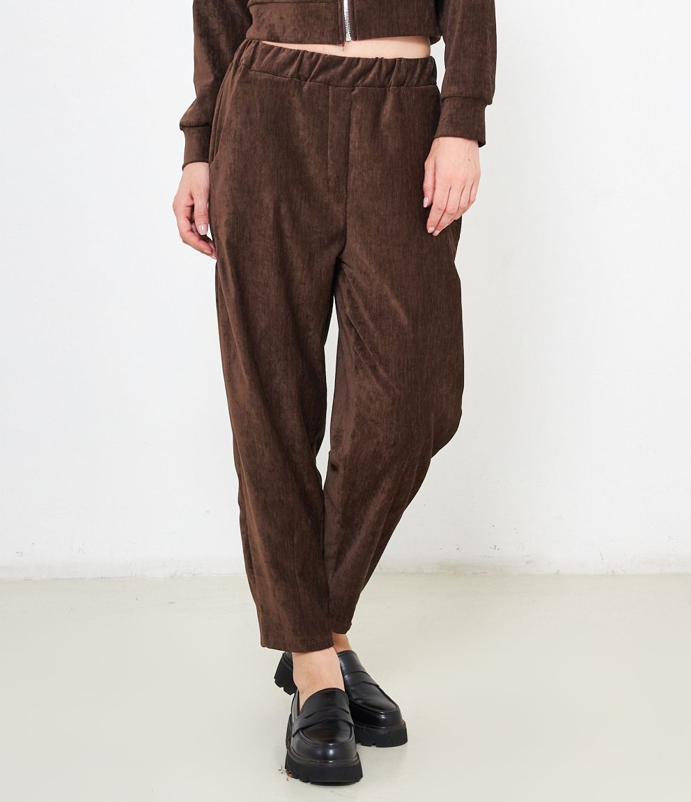 Pantaloni effetto camoscio con elastico in vita e tasche laterali.