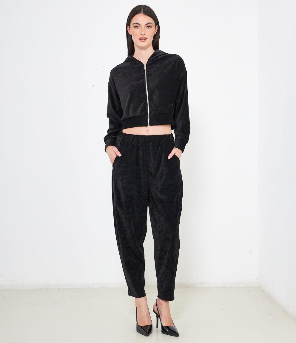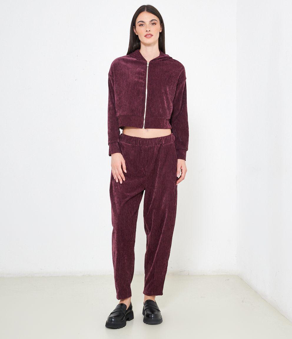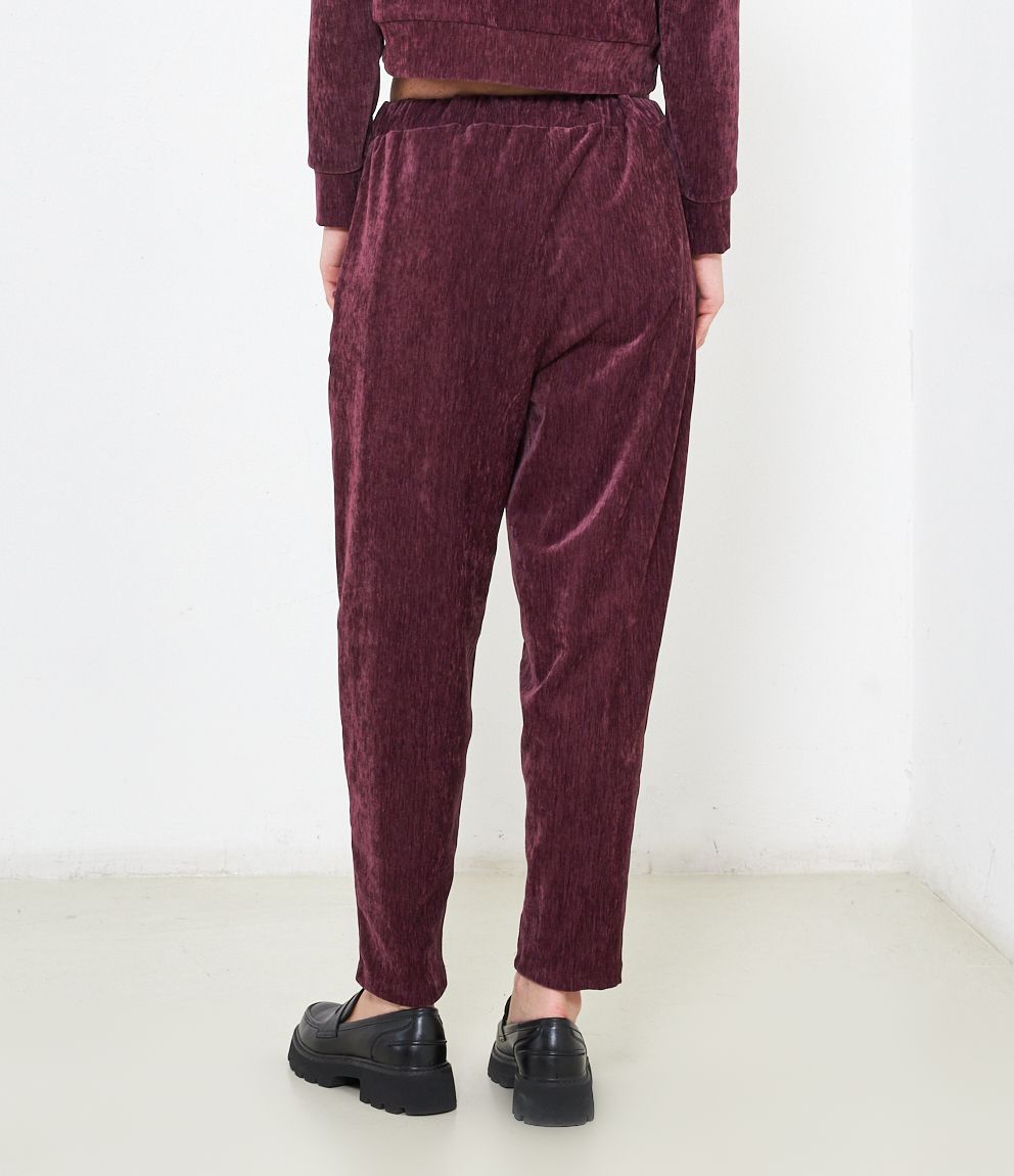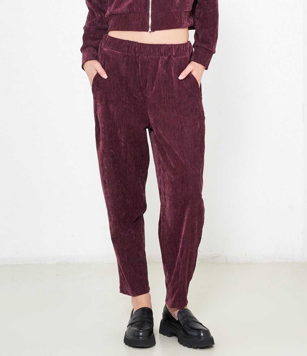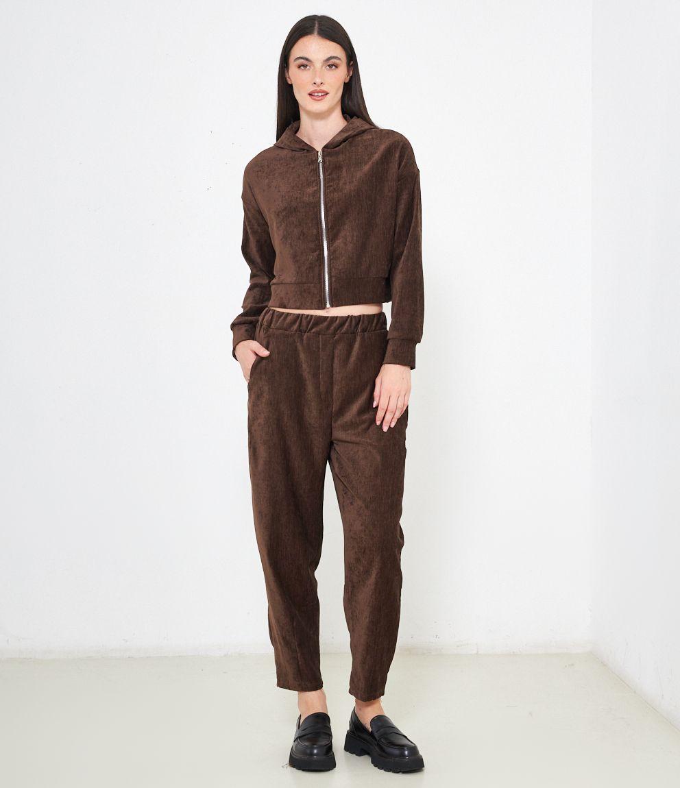 Pantaloni effetto camoscio con elastico in vita e tasche laterali.