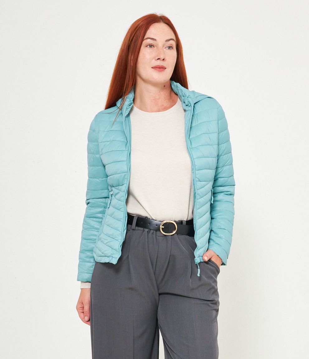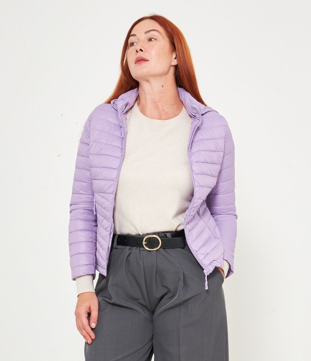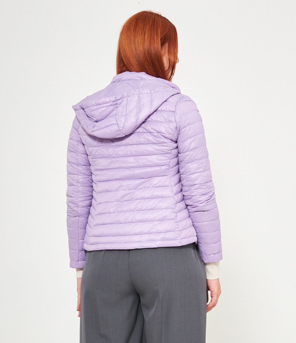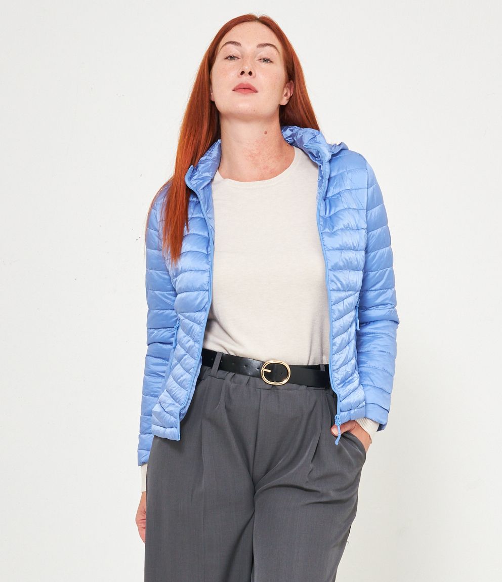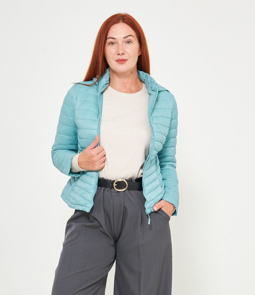Piumino basic con cappuccio rimovibile e chiusura con zip.