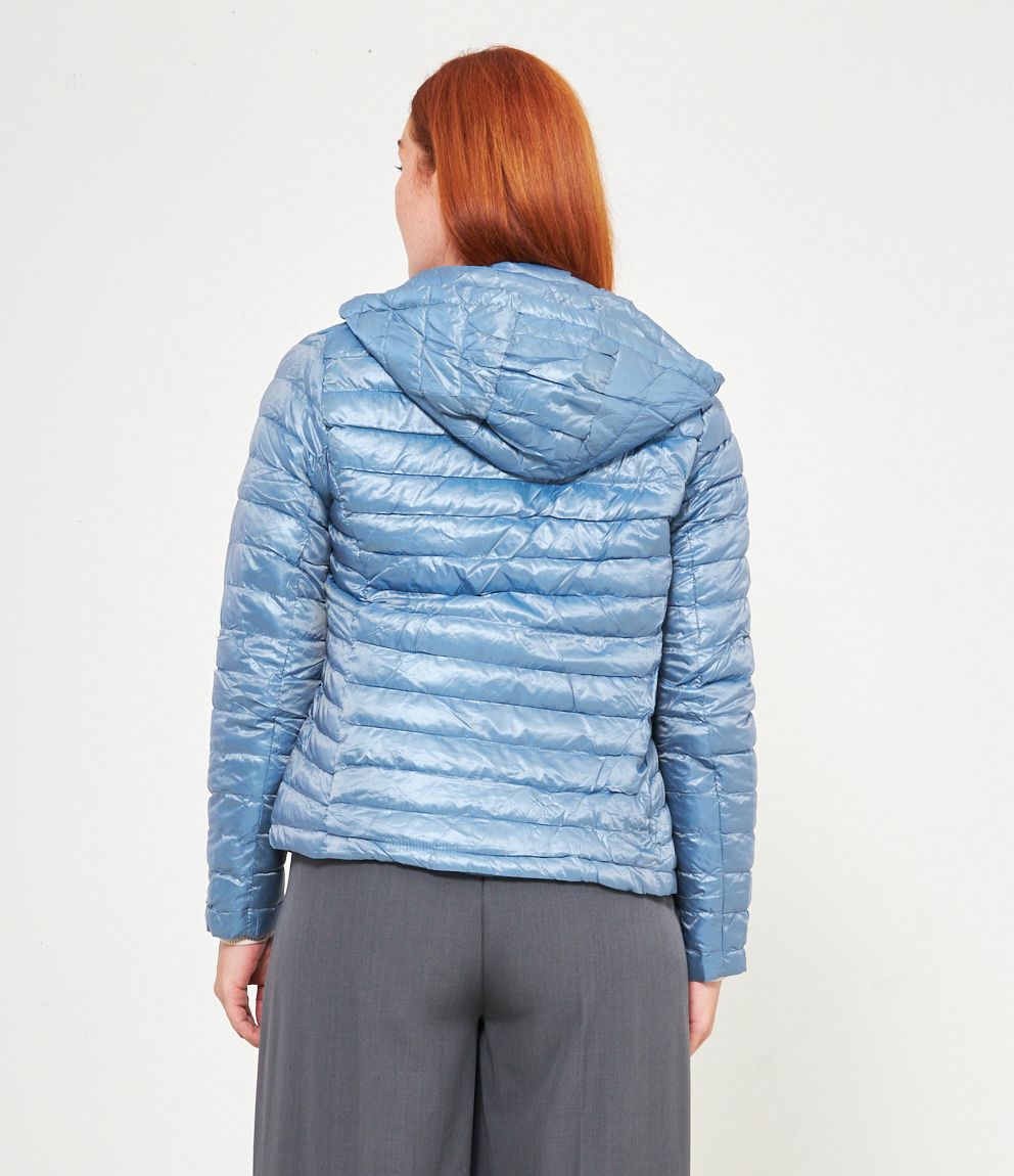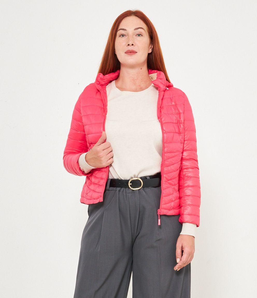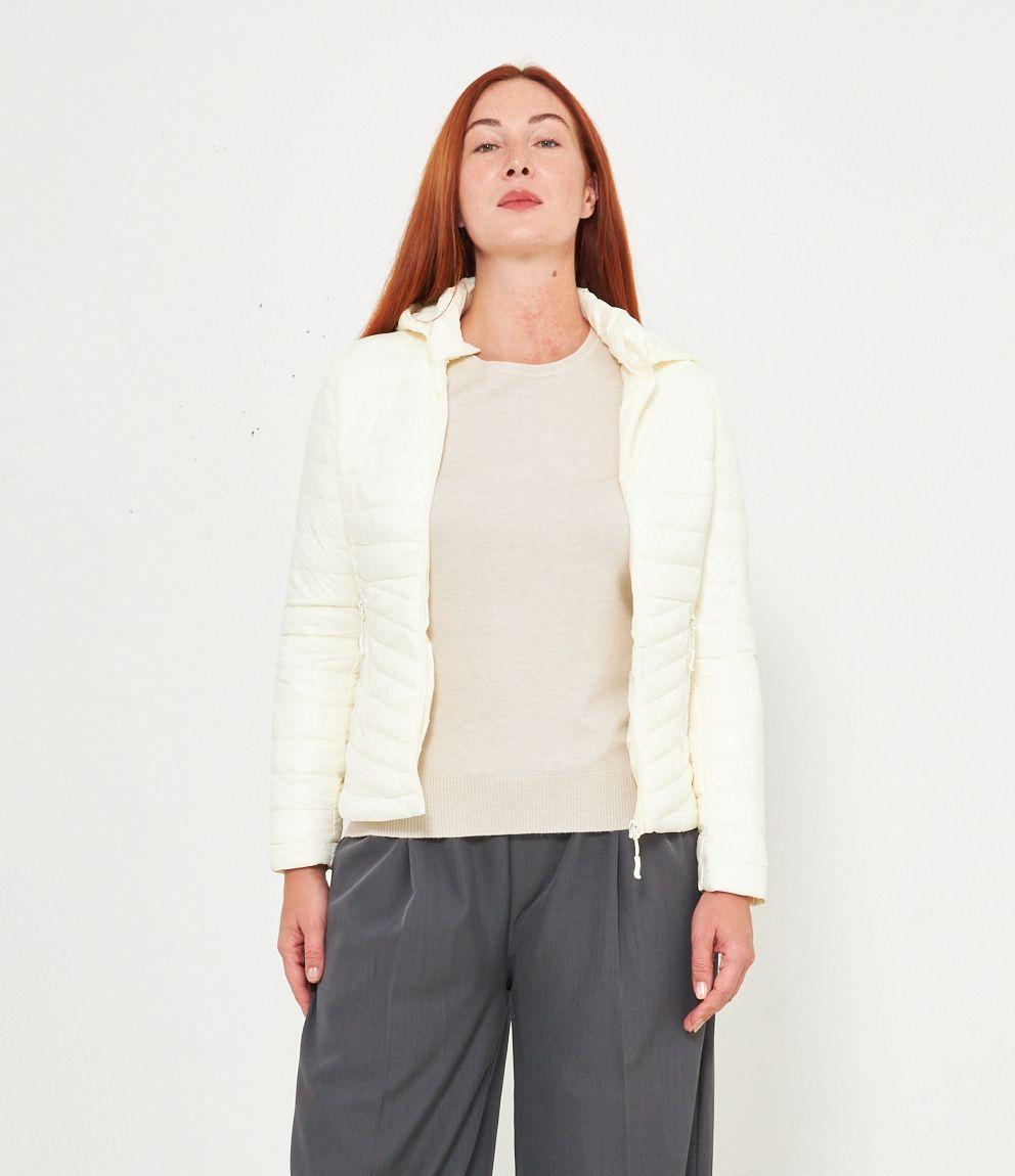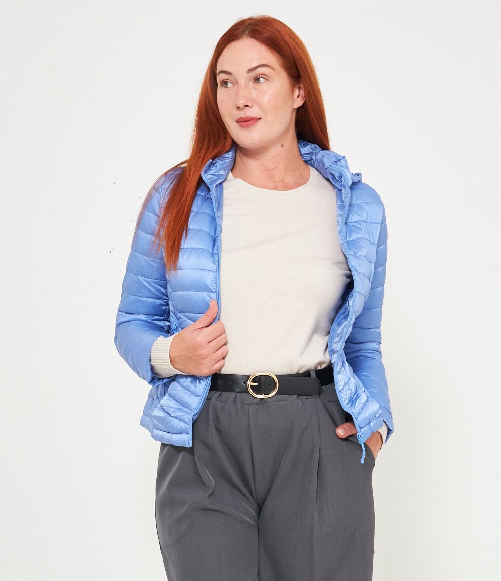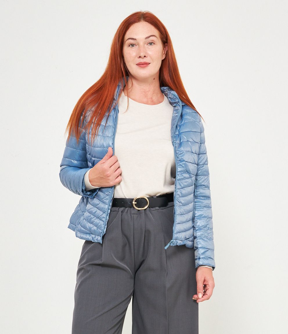 Piumino basic con cappuccio rimovibile e chiusura con zip.