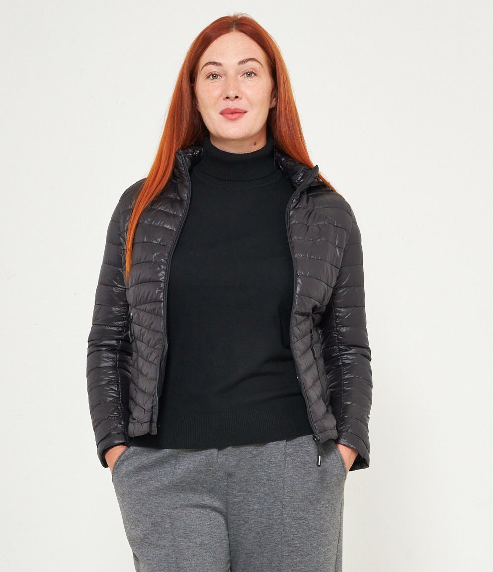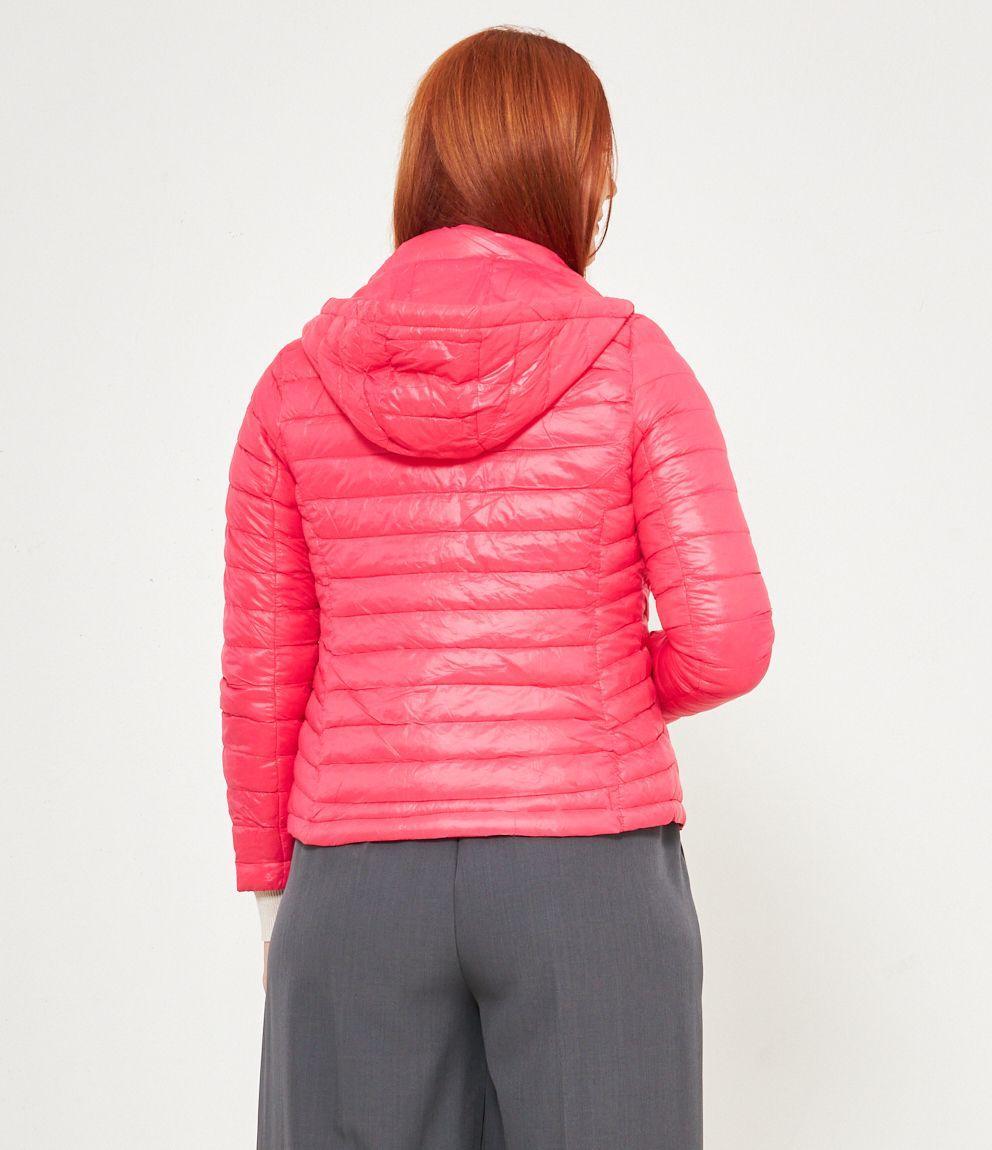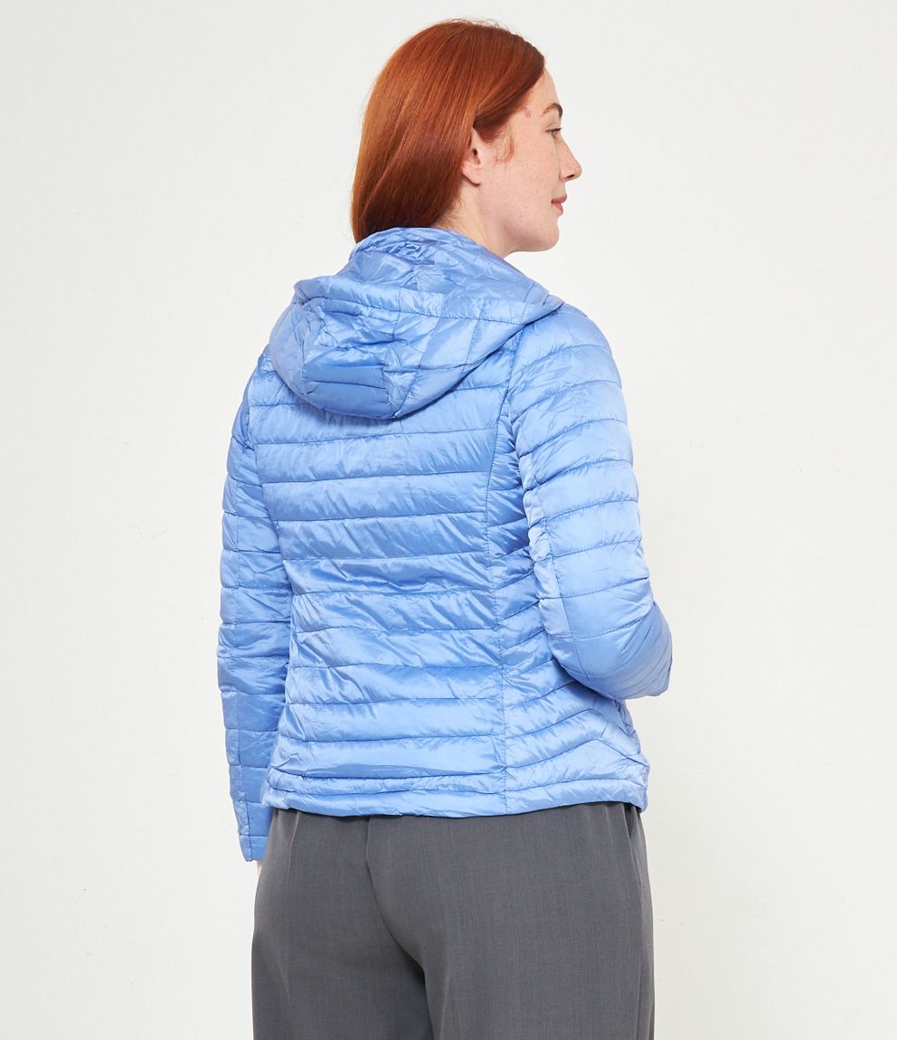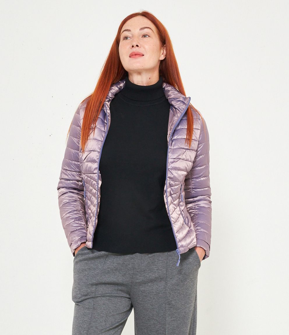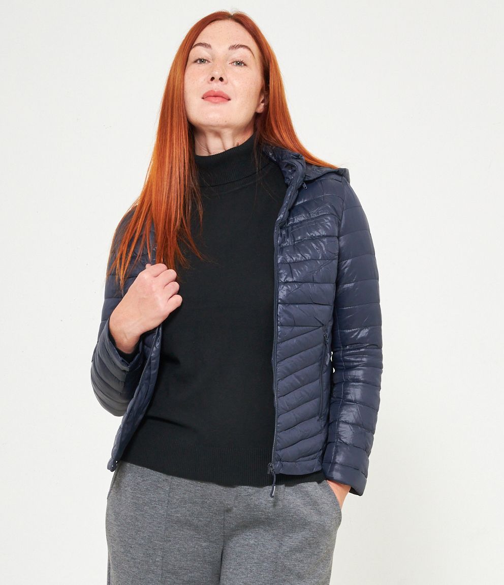 Piumino basic con cappuccio rimovibile e chiusura con zip.