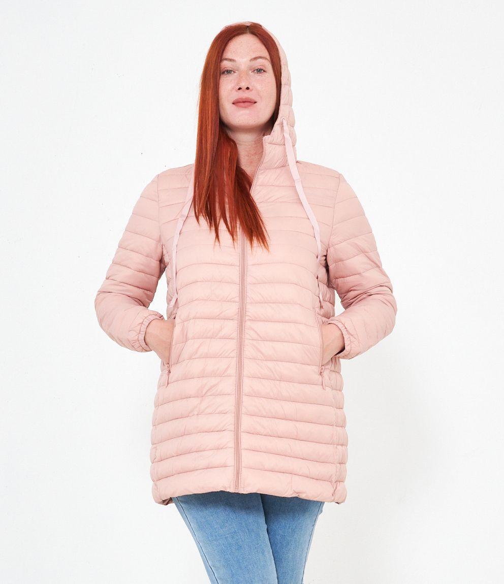 Piumino midi con cappuccio, tasche con zip e chiusura centrale con zip.