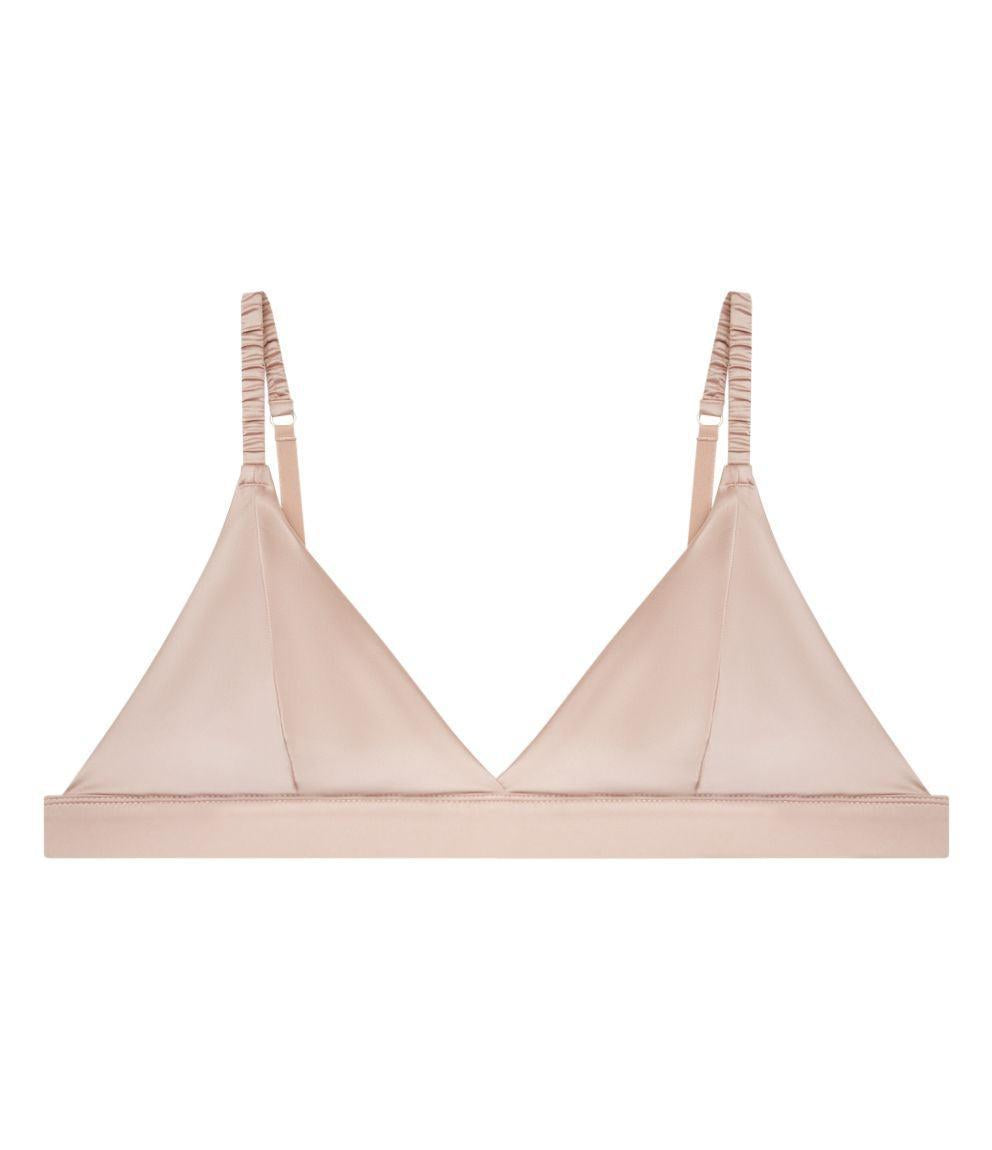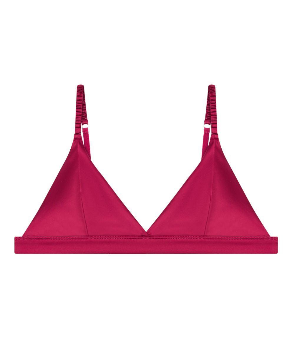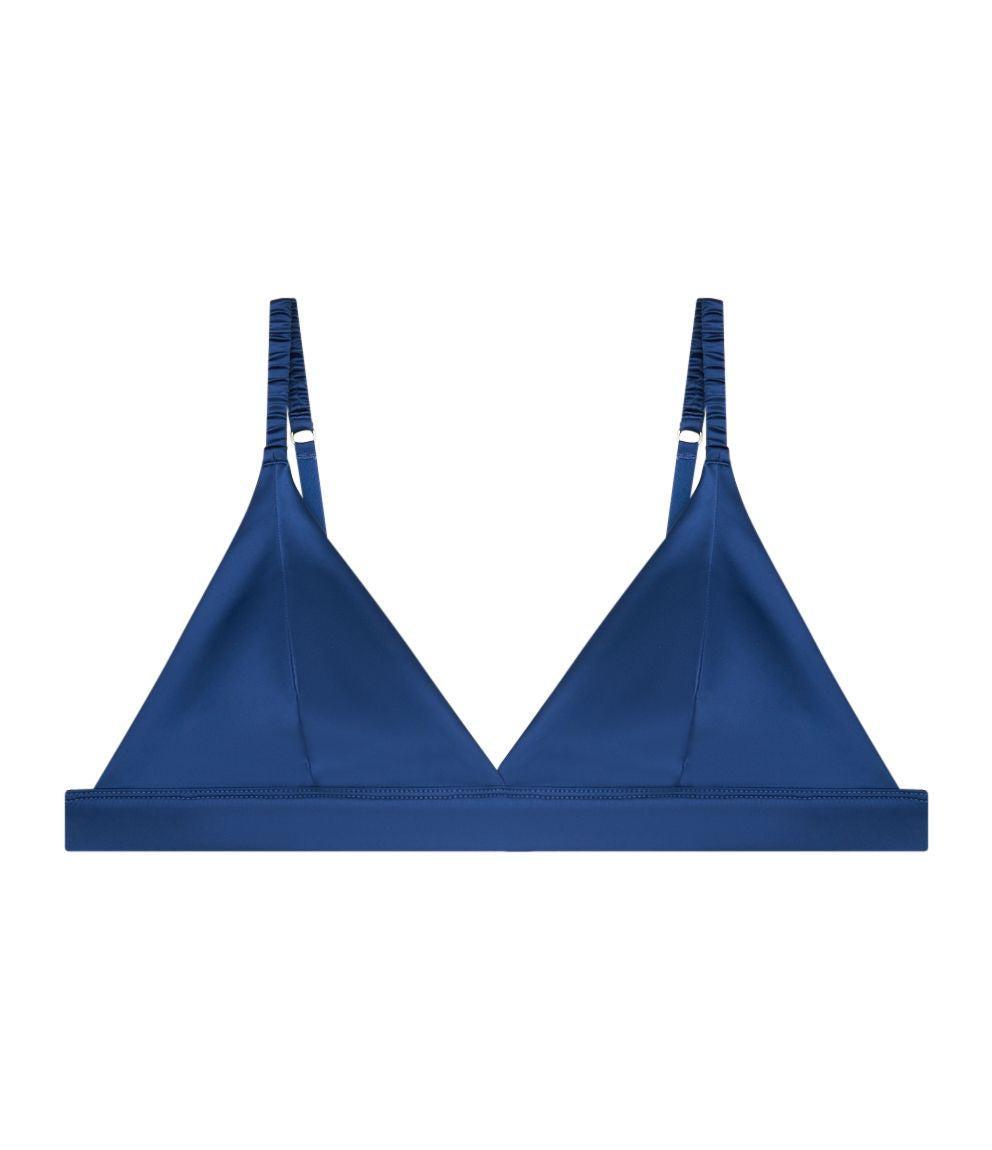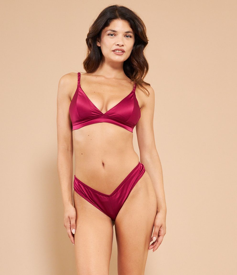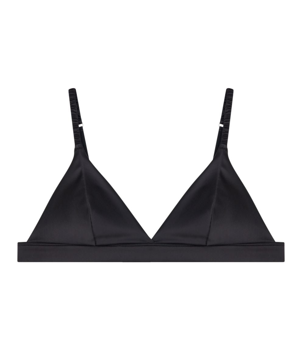 Reggiseno a triangolo in ras, con coppette interne, senza ferretto. Spalline regolabili e chiusura con due gancetti regolabili su tre larghezze.