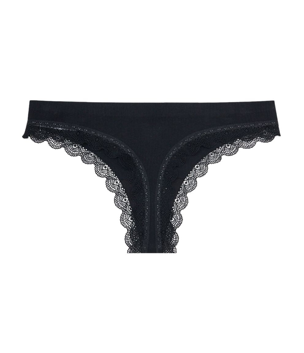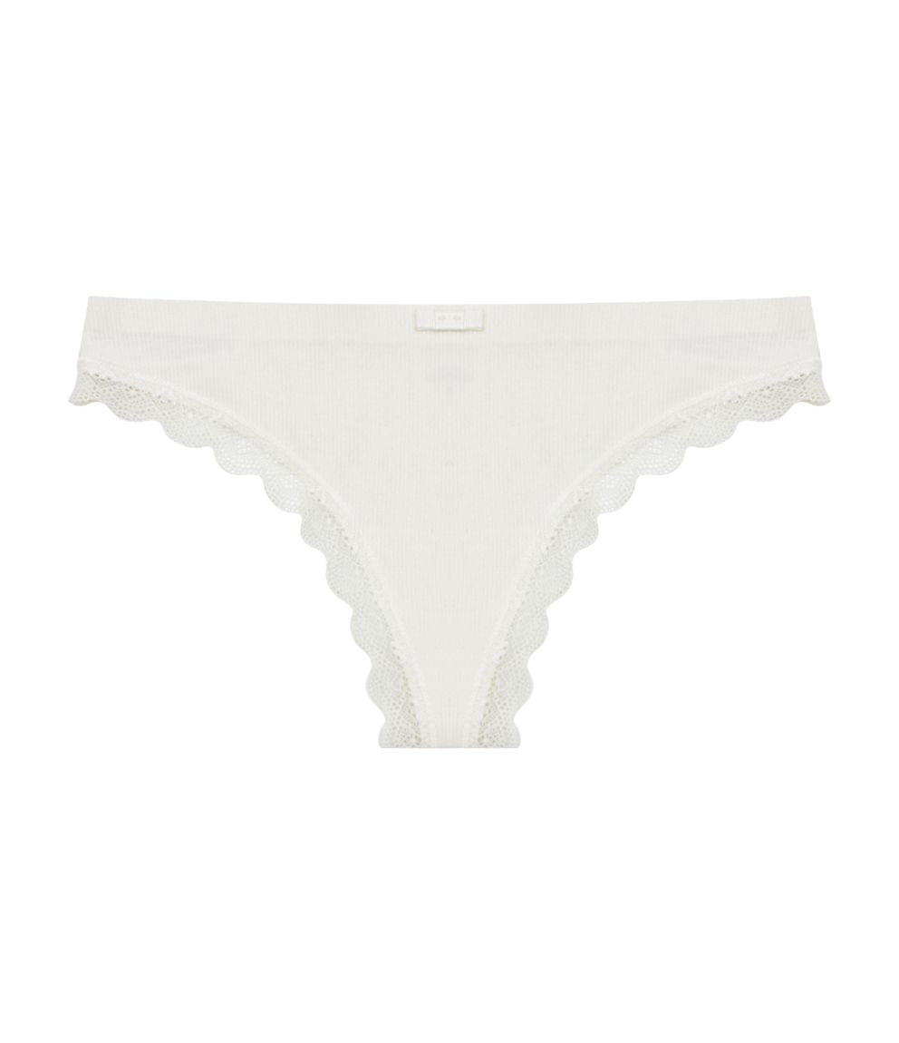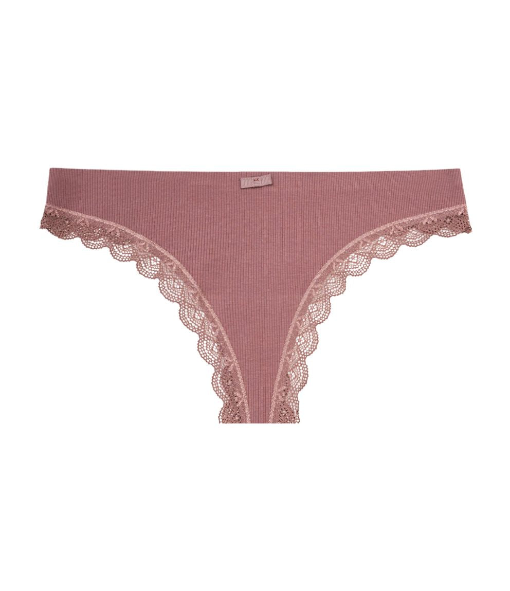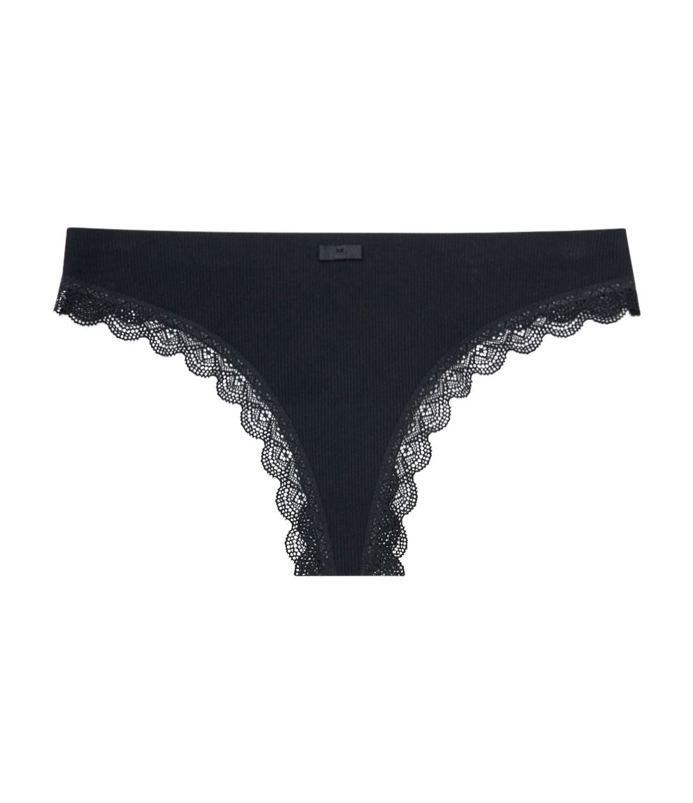 Slip modello tanga in cotone a costine con bordi in pizzo.