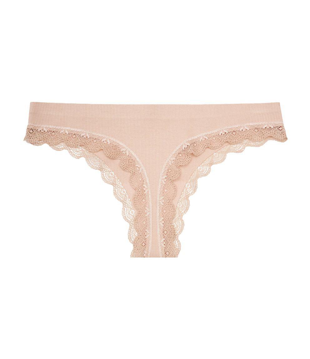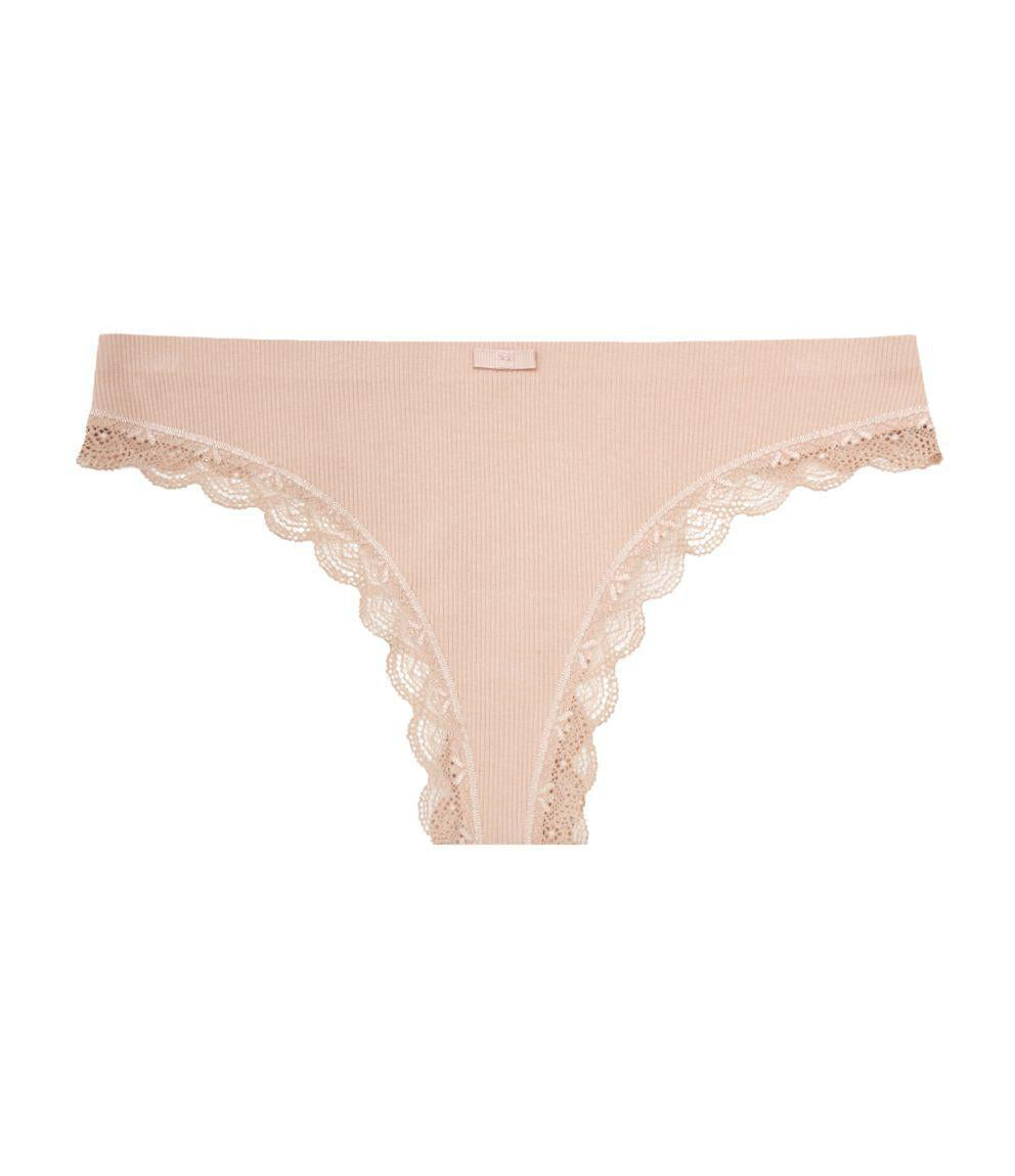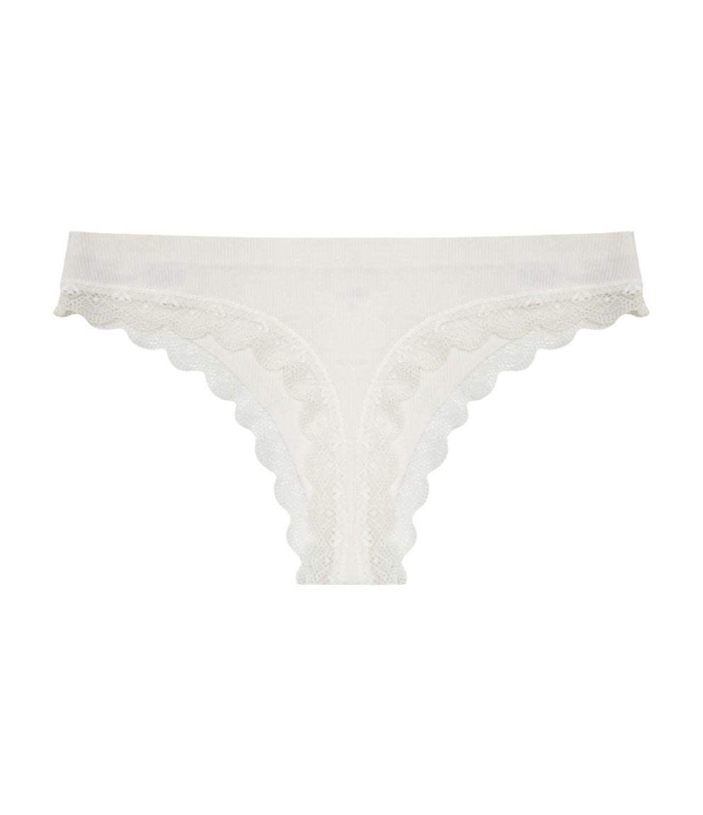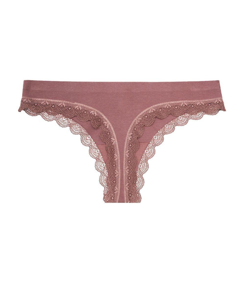 Slip modello tanga in cotone a costine con bordi in pizzo.