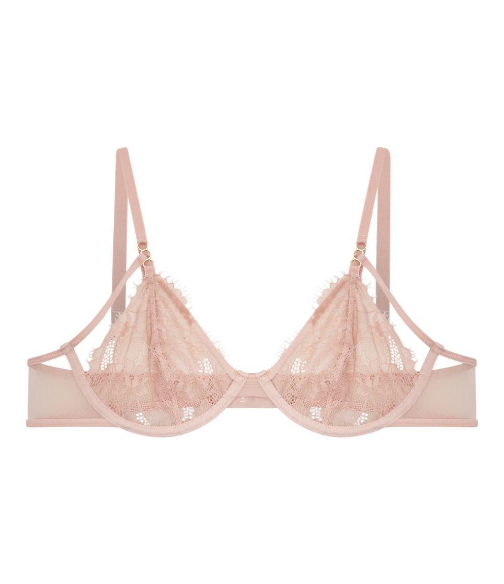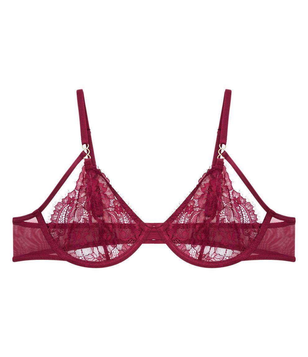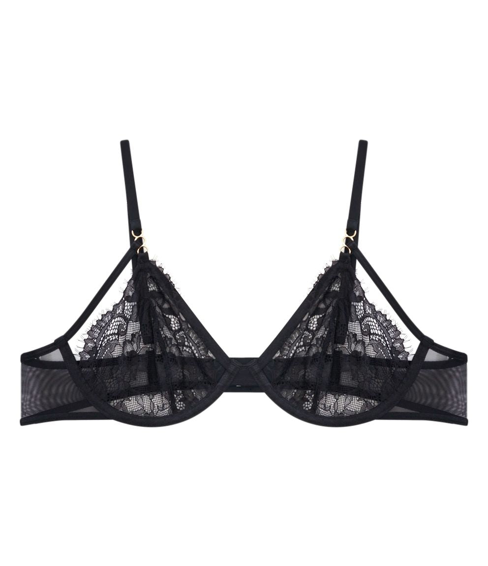 Balconcino in pizzo trasparente senza coppe e fasce frontali e laterali. Spalline regolabili e chiusura con gancetti regolabili su tre larghezze.