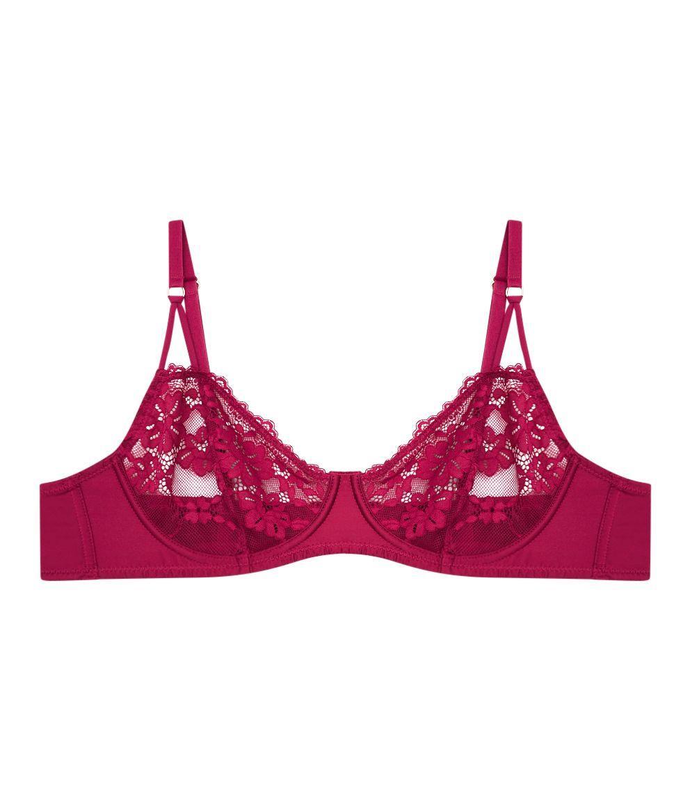 Balconcino in pizzo con ferretto senza coppe, fascia in raso. Spalline regolabili e chiusura con due gancetti regolabili in tra larghezze.