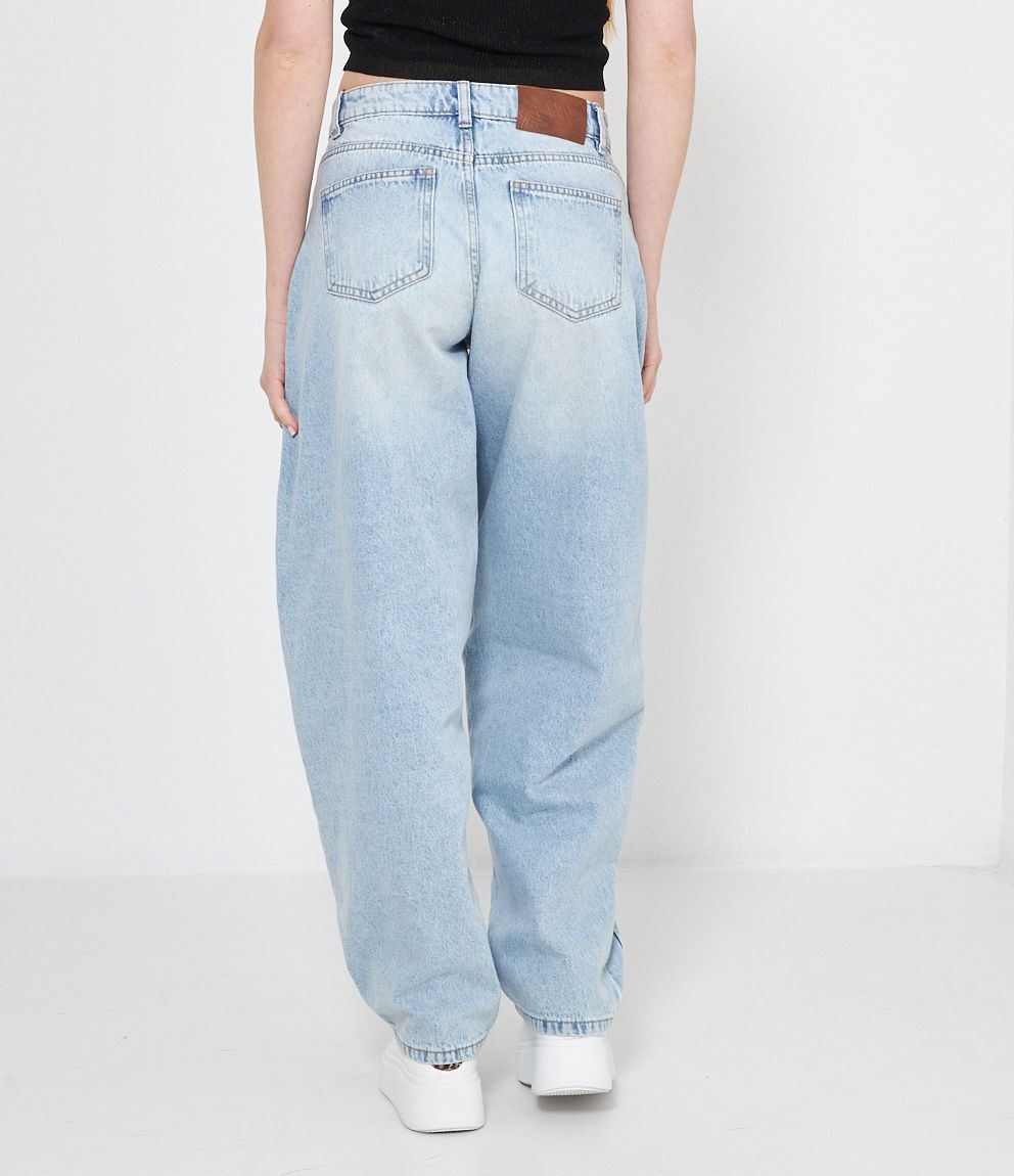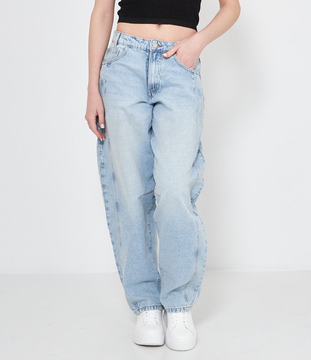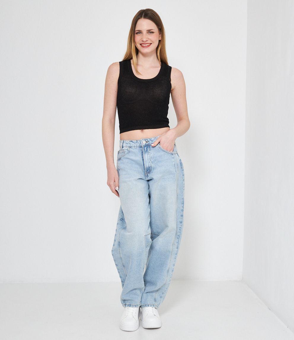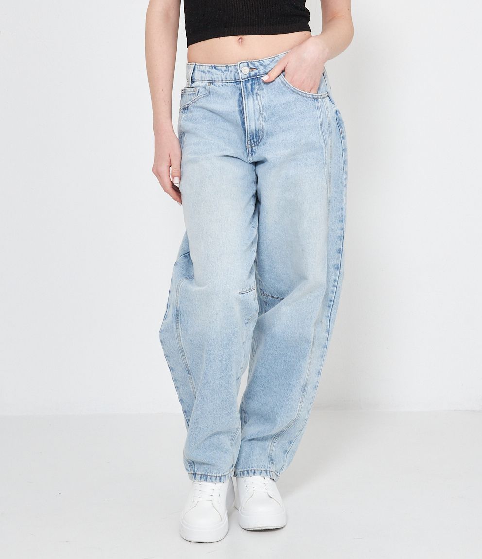 Jeans modello barrel con dettaglio cuciture laretali, cinque tasche e chiusura con zip e bottone.