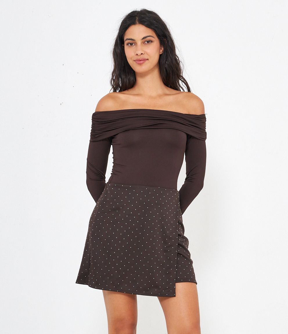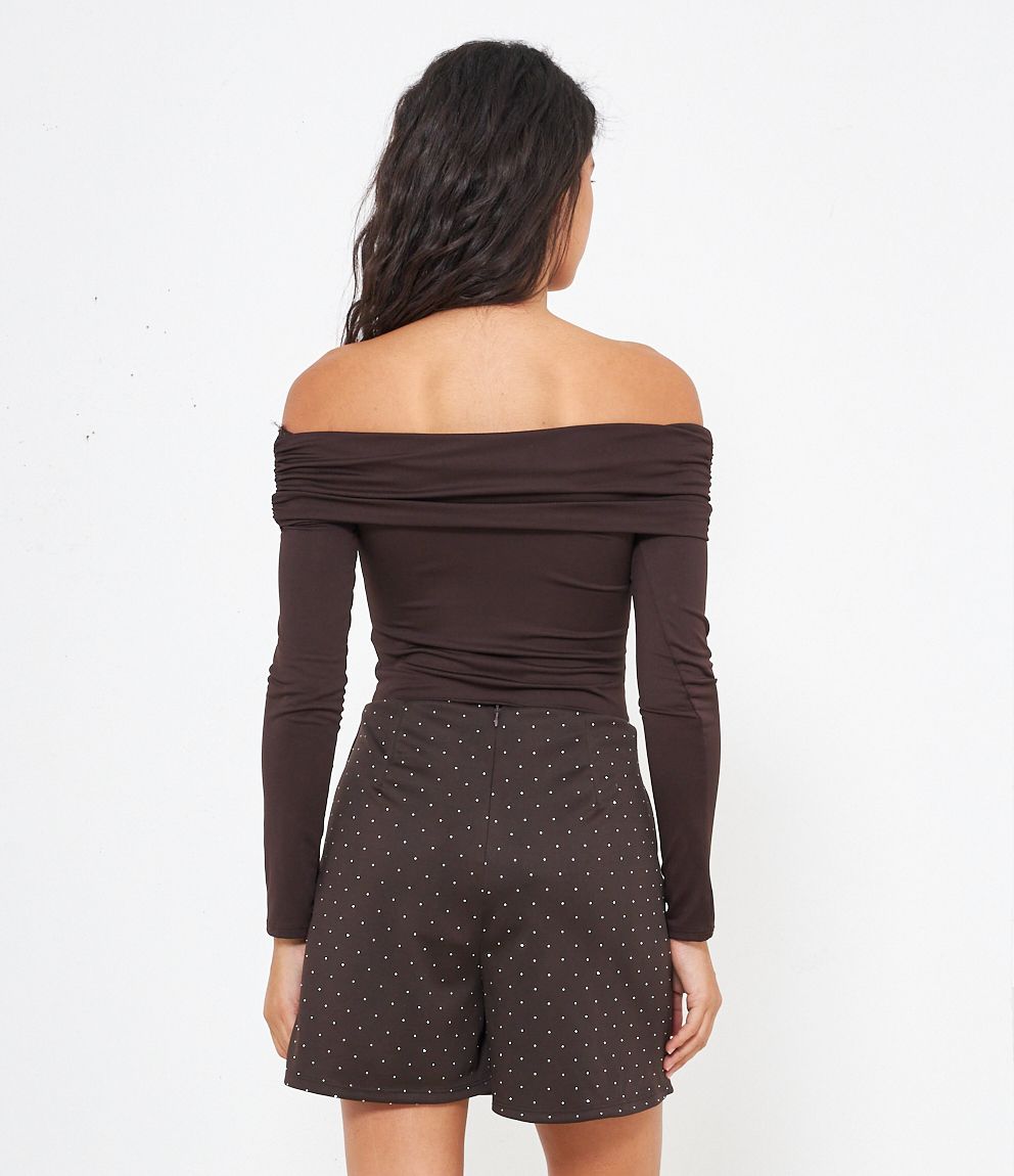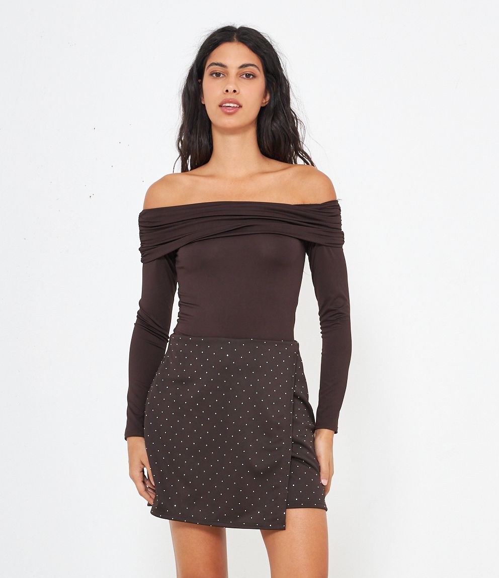 Body con scollo ampio e spalle scoperte, tessuto elastico.