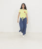 Cotton striped T-shirt with front graphic print. Knot at the bottom, round neckline and half sleeves.