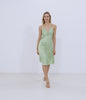 Satin midi dress with jeweled chain straps. Deep V-neck and front knot.
