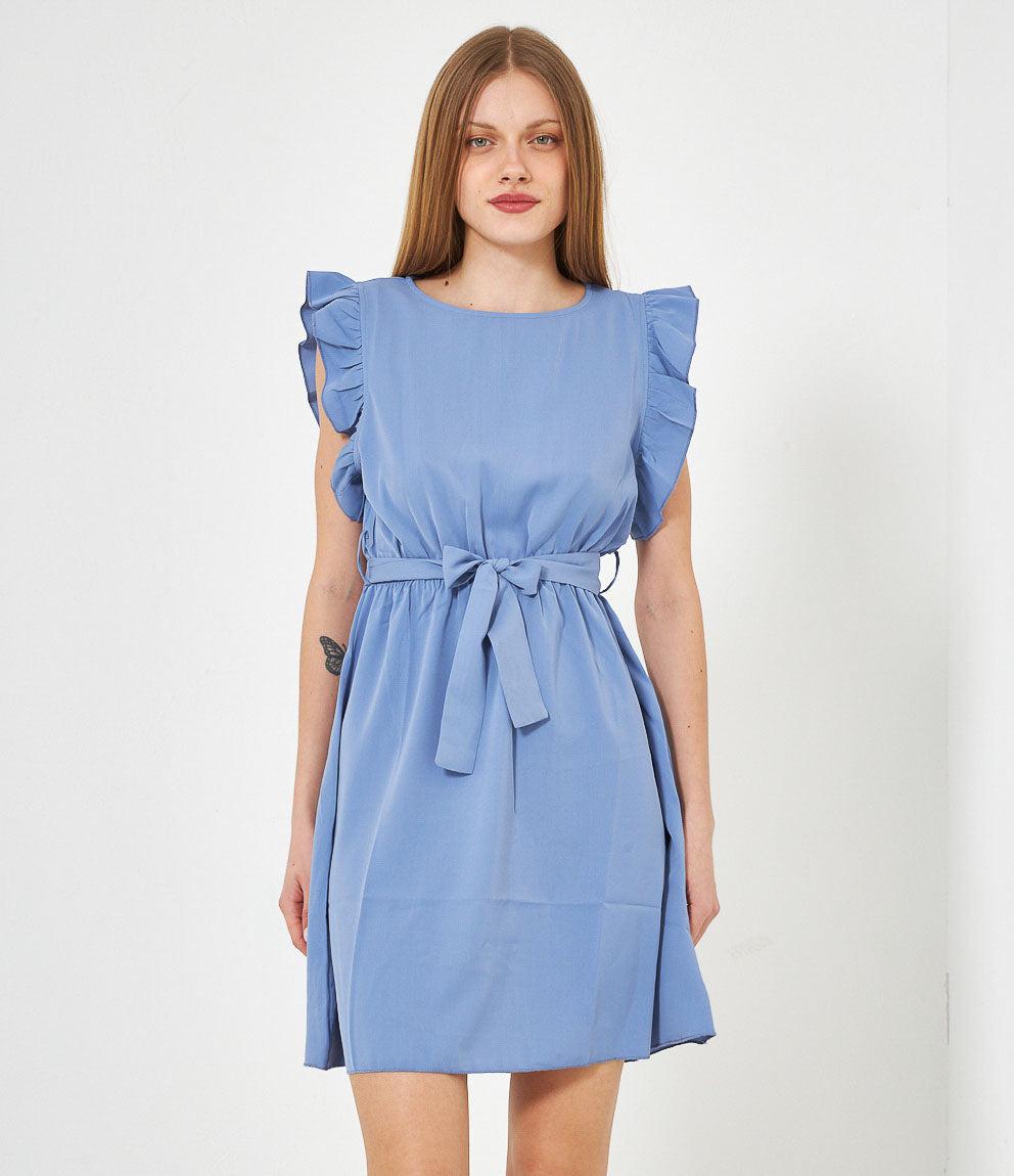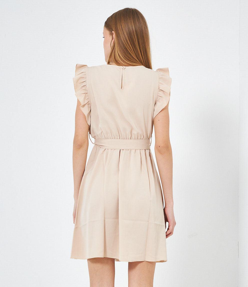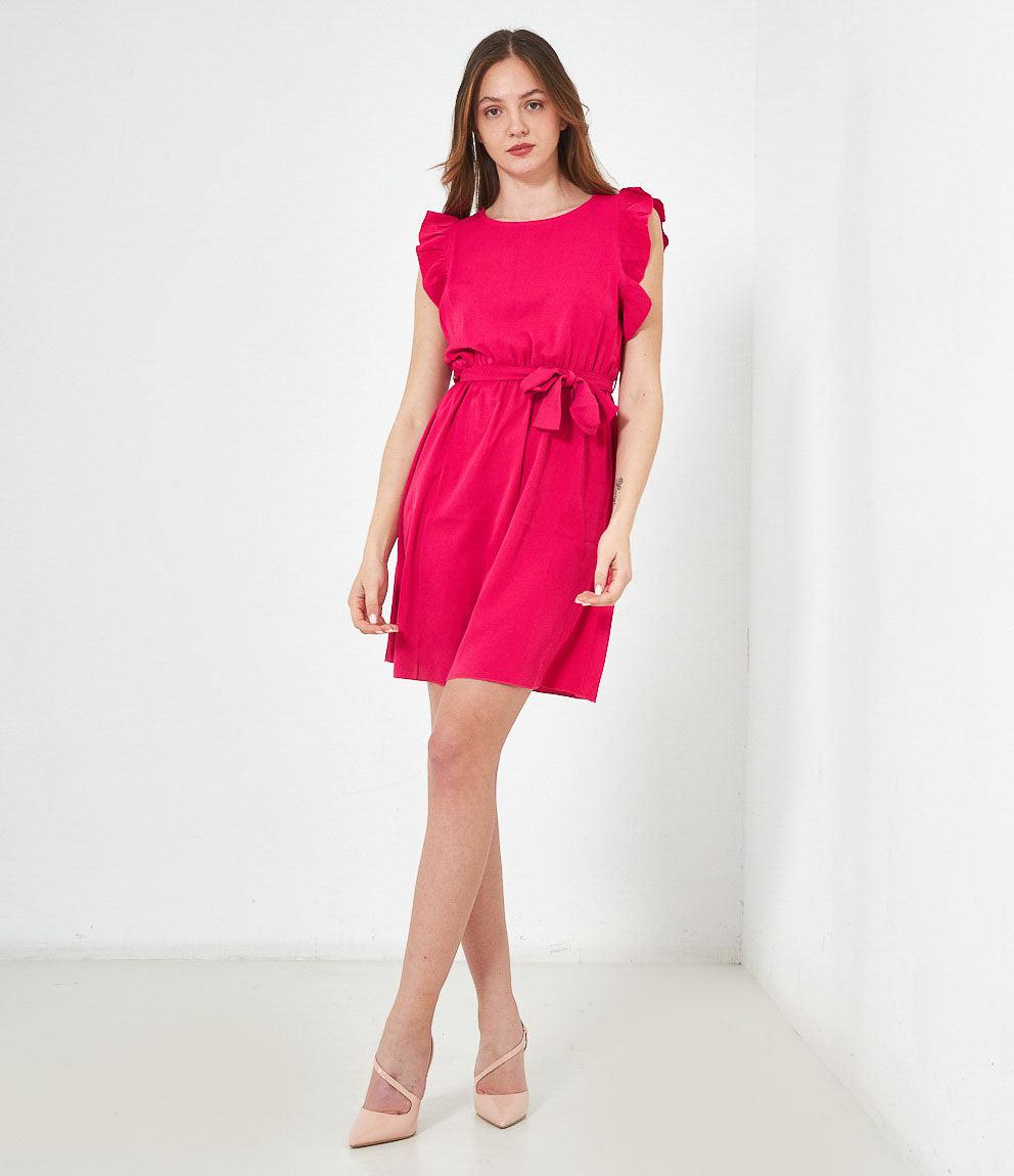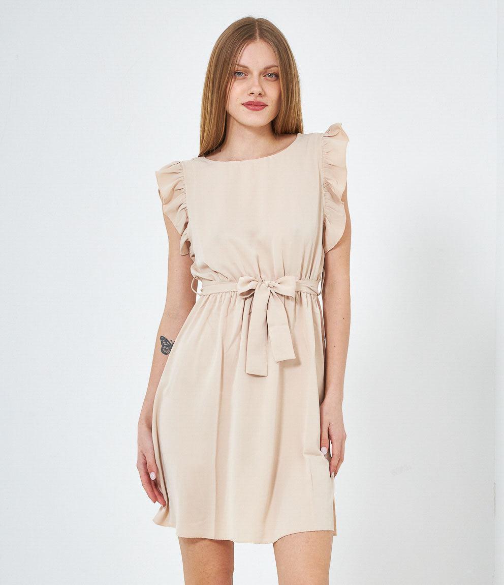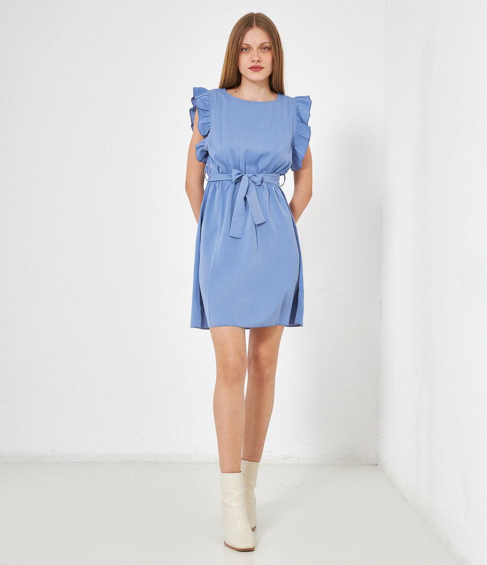 Dress with round neckline, ruffled armholes and adjustable waist belt. Back button closure.