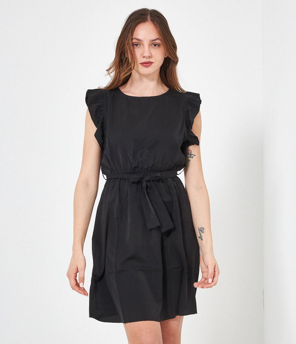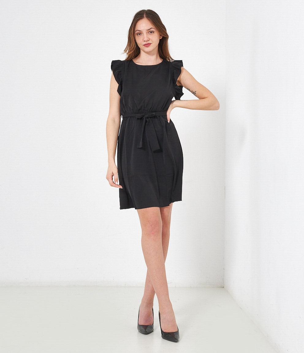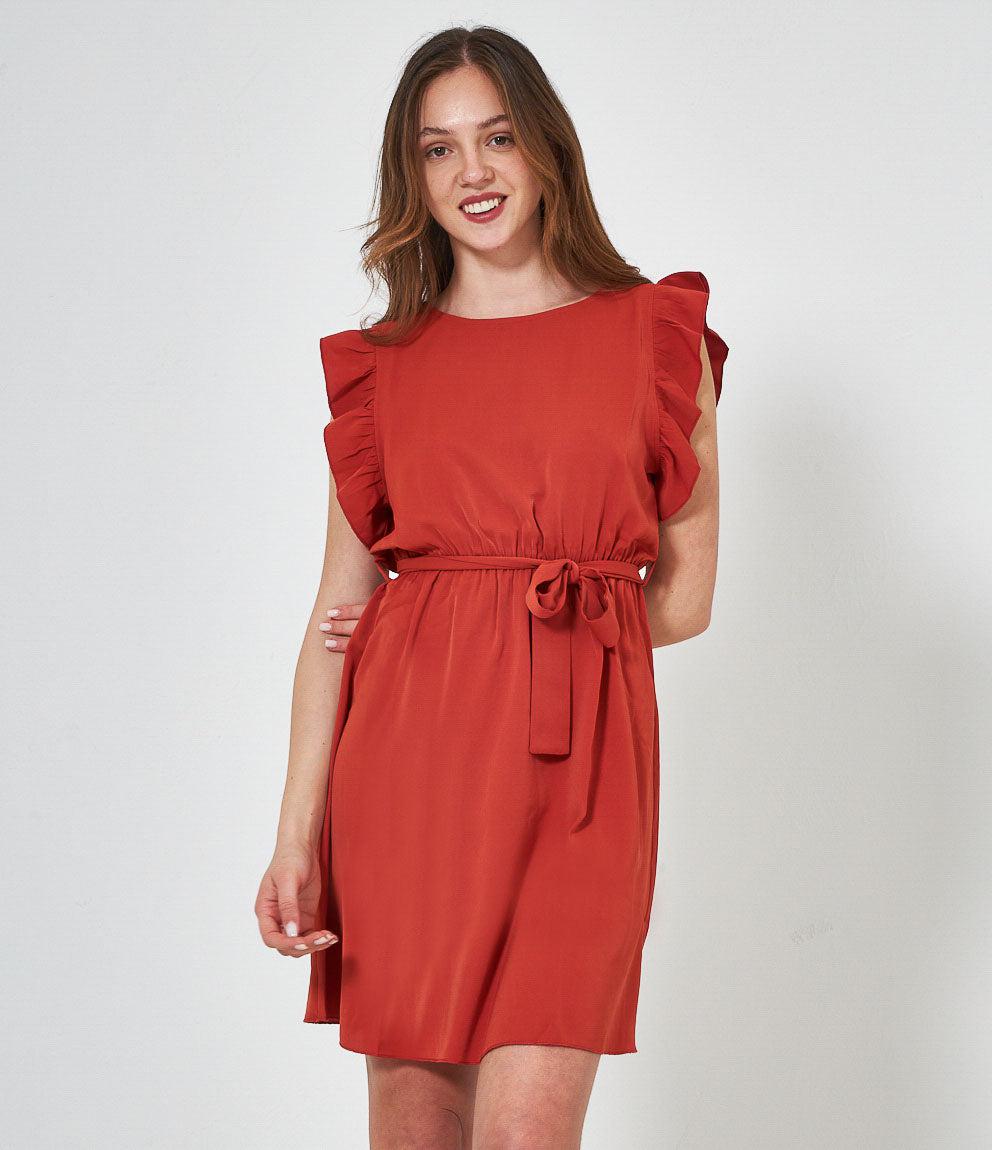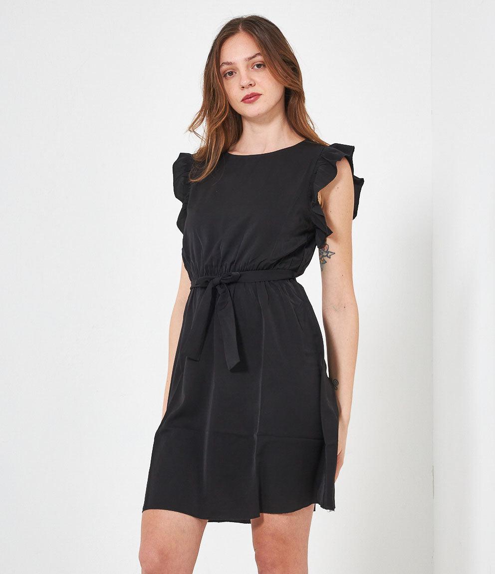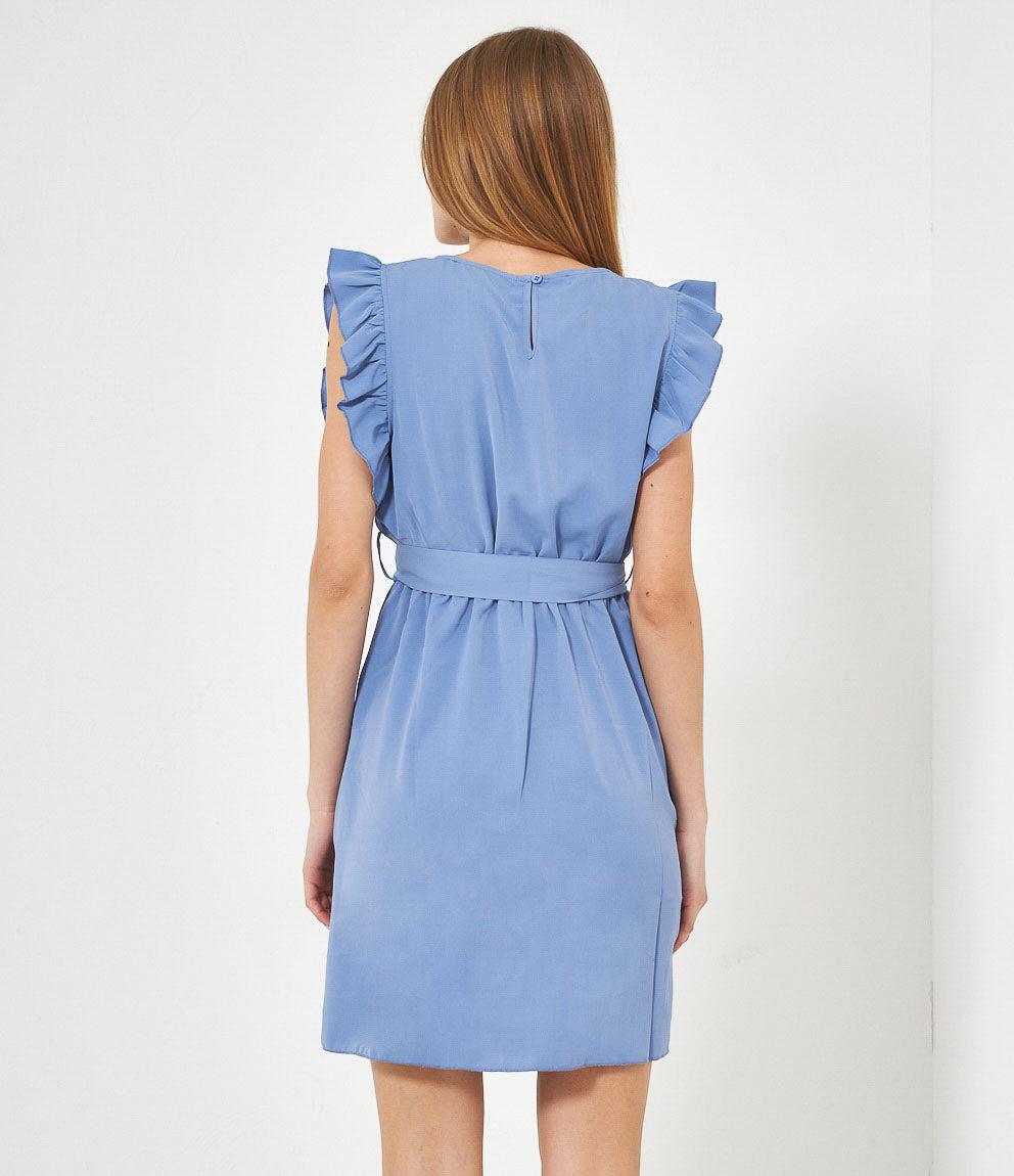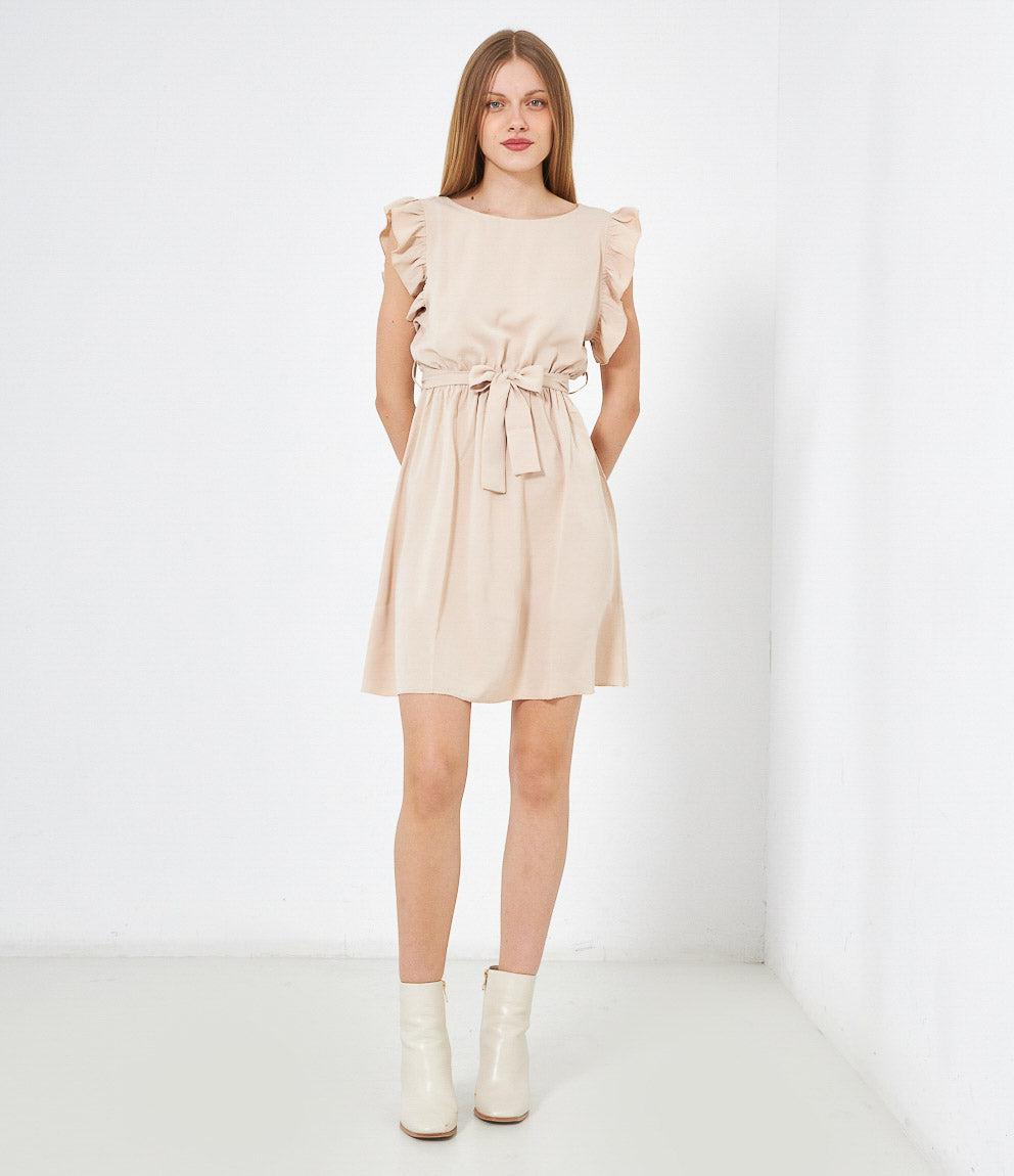 Dress with round neckline, ruffled armholes and adjustable waist belt. Back button closure.