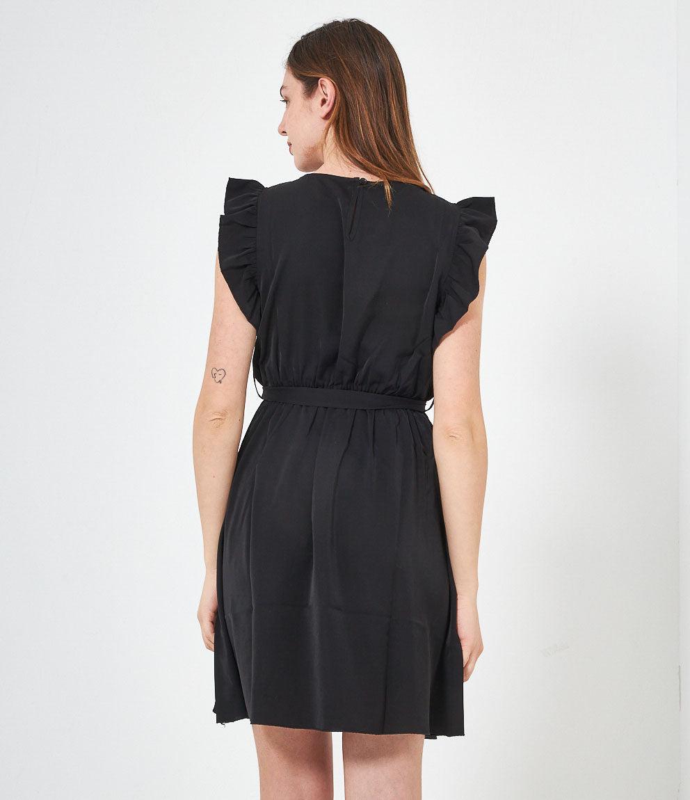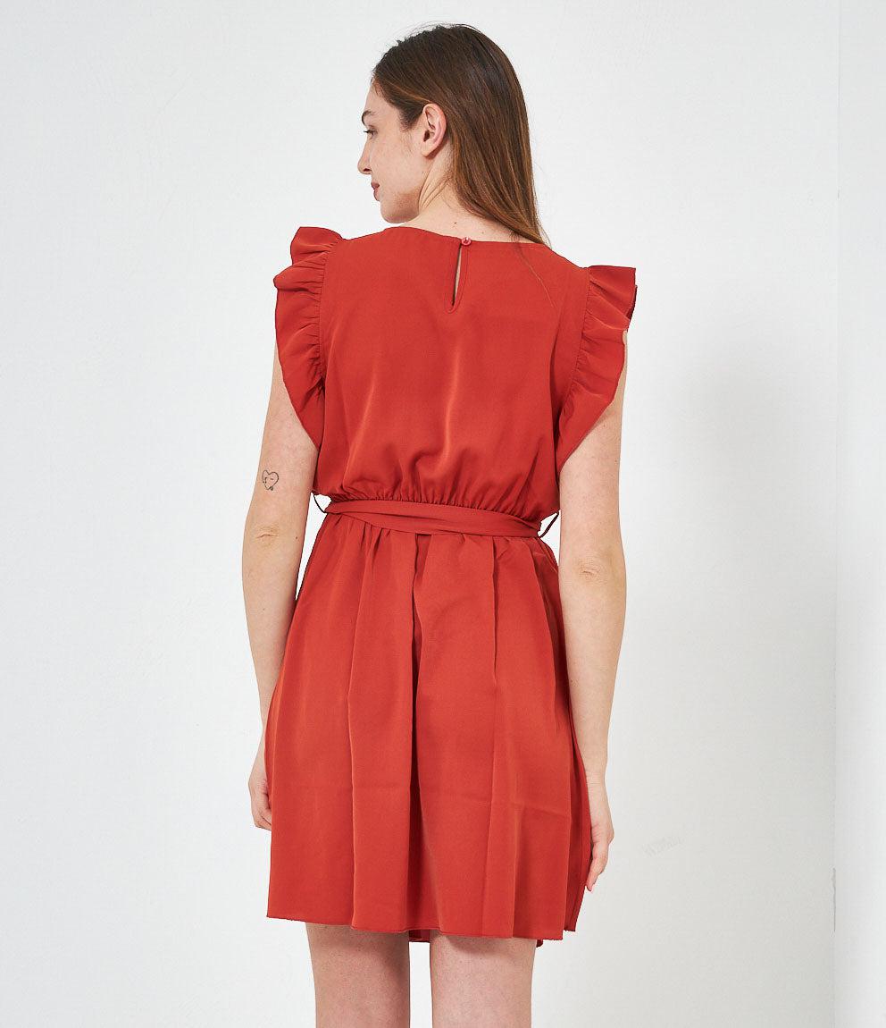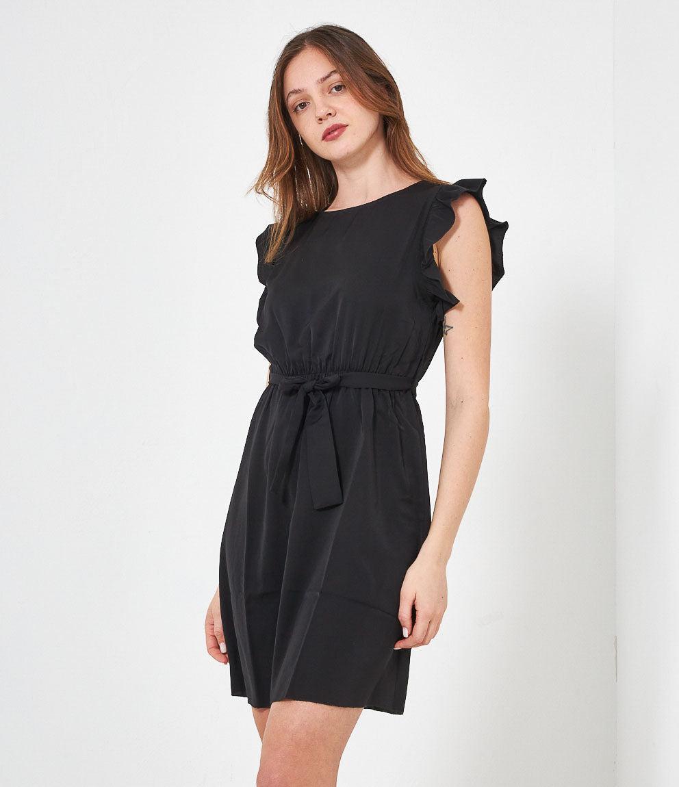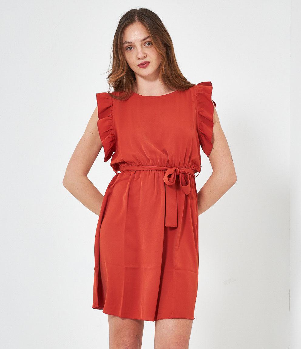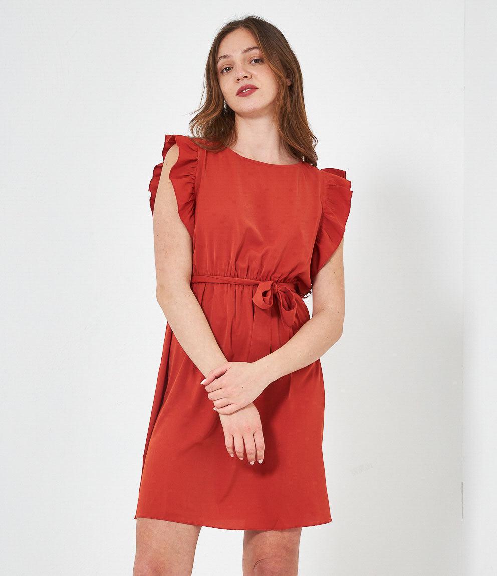 Dress with round neckline, ruffled armholes and adjustable waist belt. Back button closure.