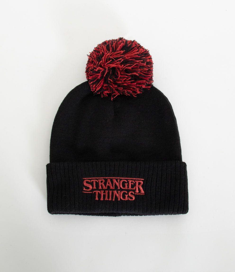 Cappello in maglia con pon pon e risvolto con ricamo.