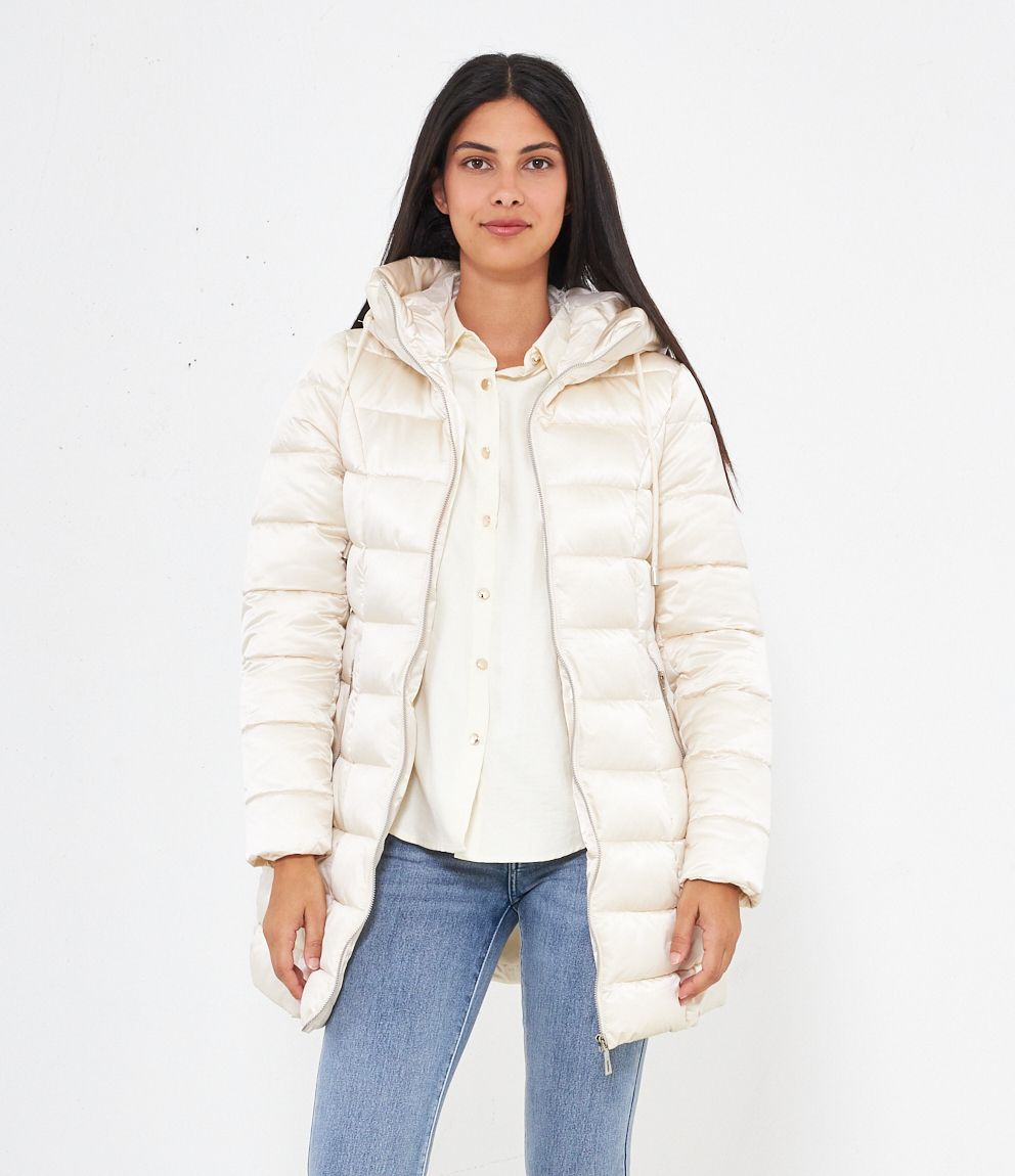 Piumino modello midi con impunture a vista, cappuccio con coulisse e tasche laterali. Chiusura con zip.