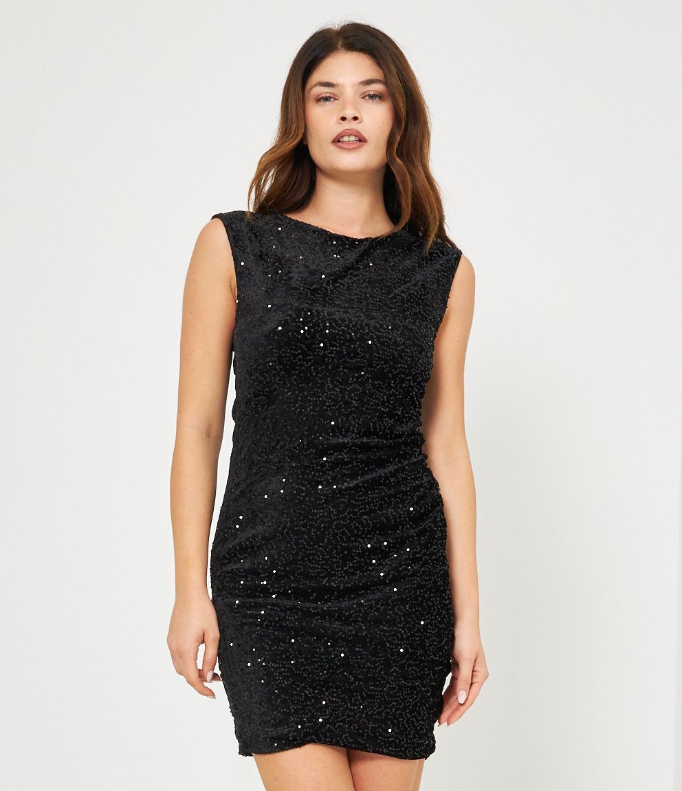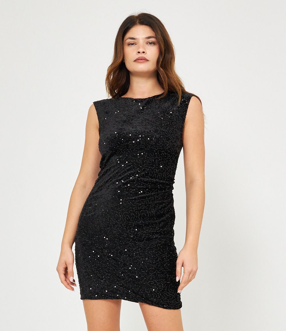 Abito mini in paillettes con scollo tondo a giro maniche.