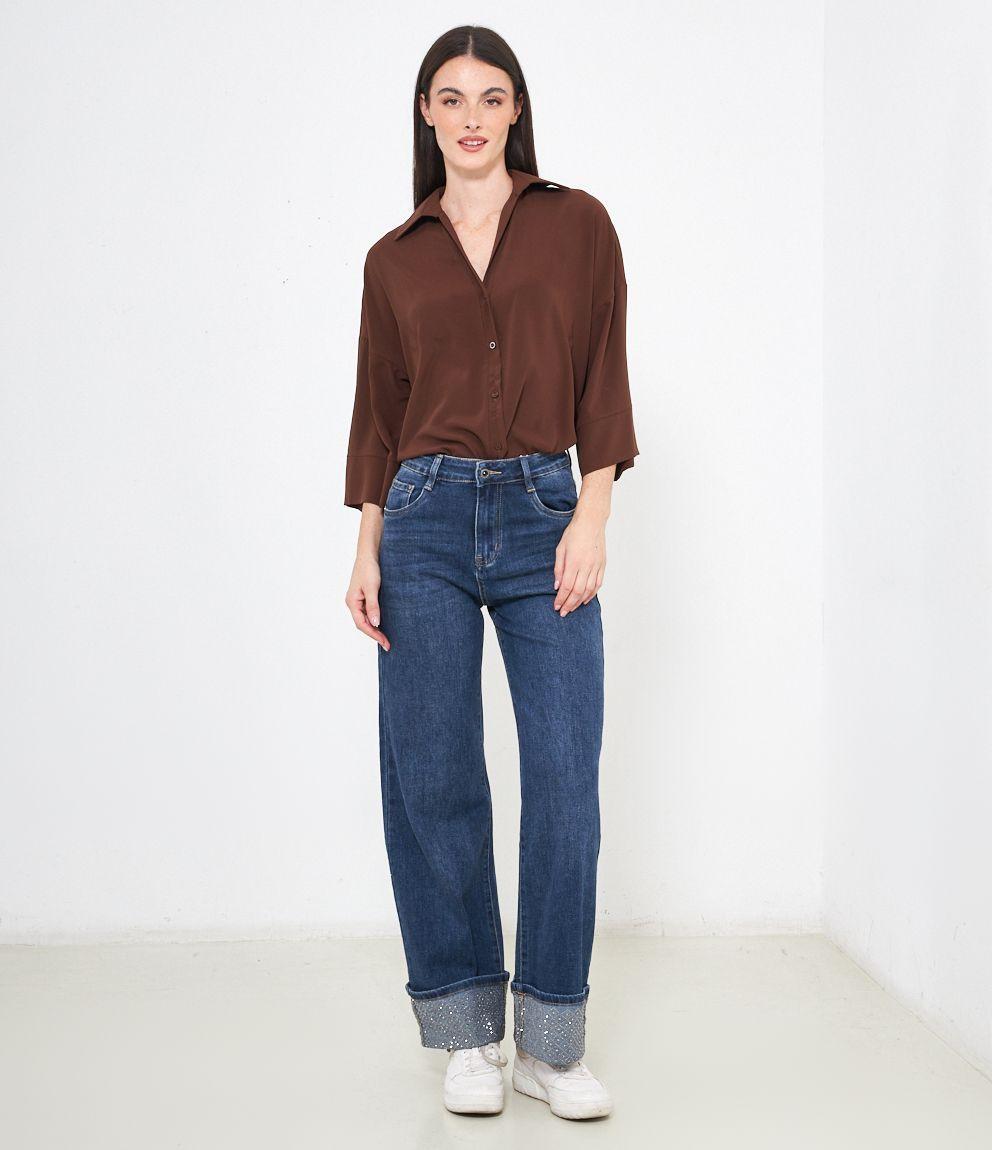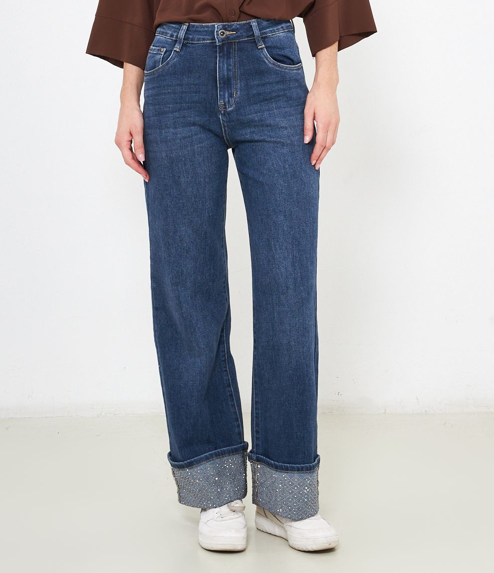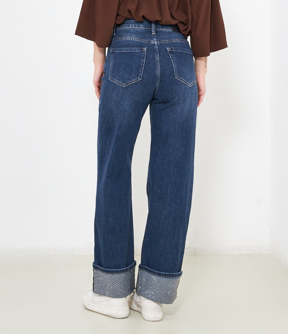 Jeans modello palazzo, particolarità del fondo con risvolti strass. Tasche laterali e chiusura con zip e bottone.
