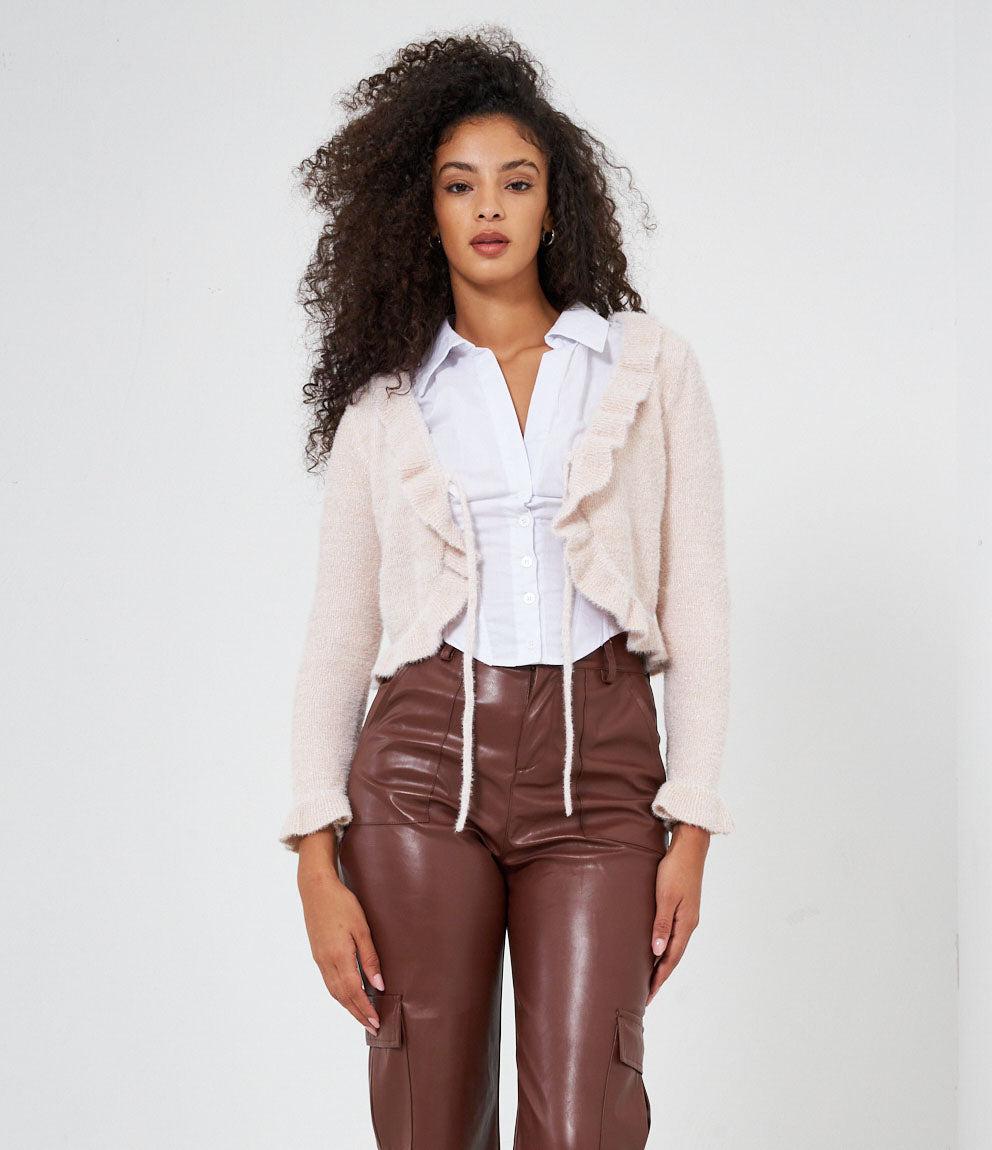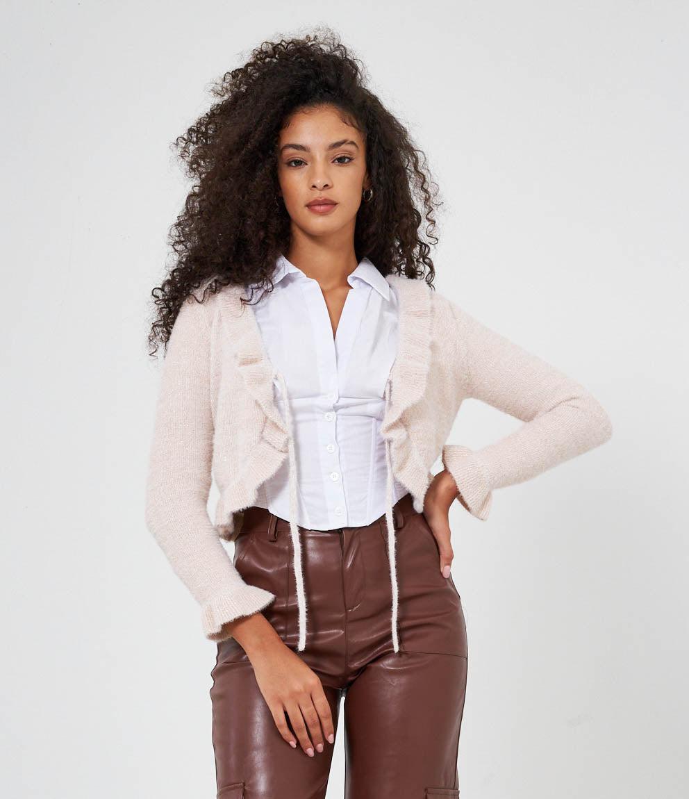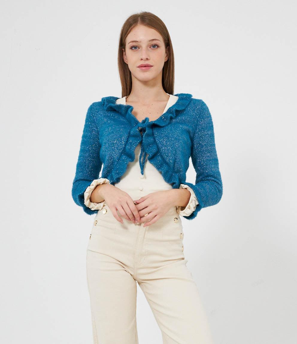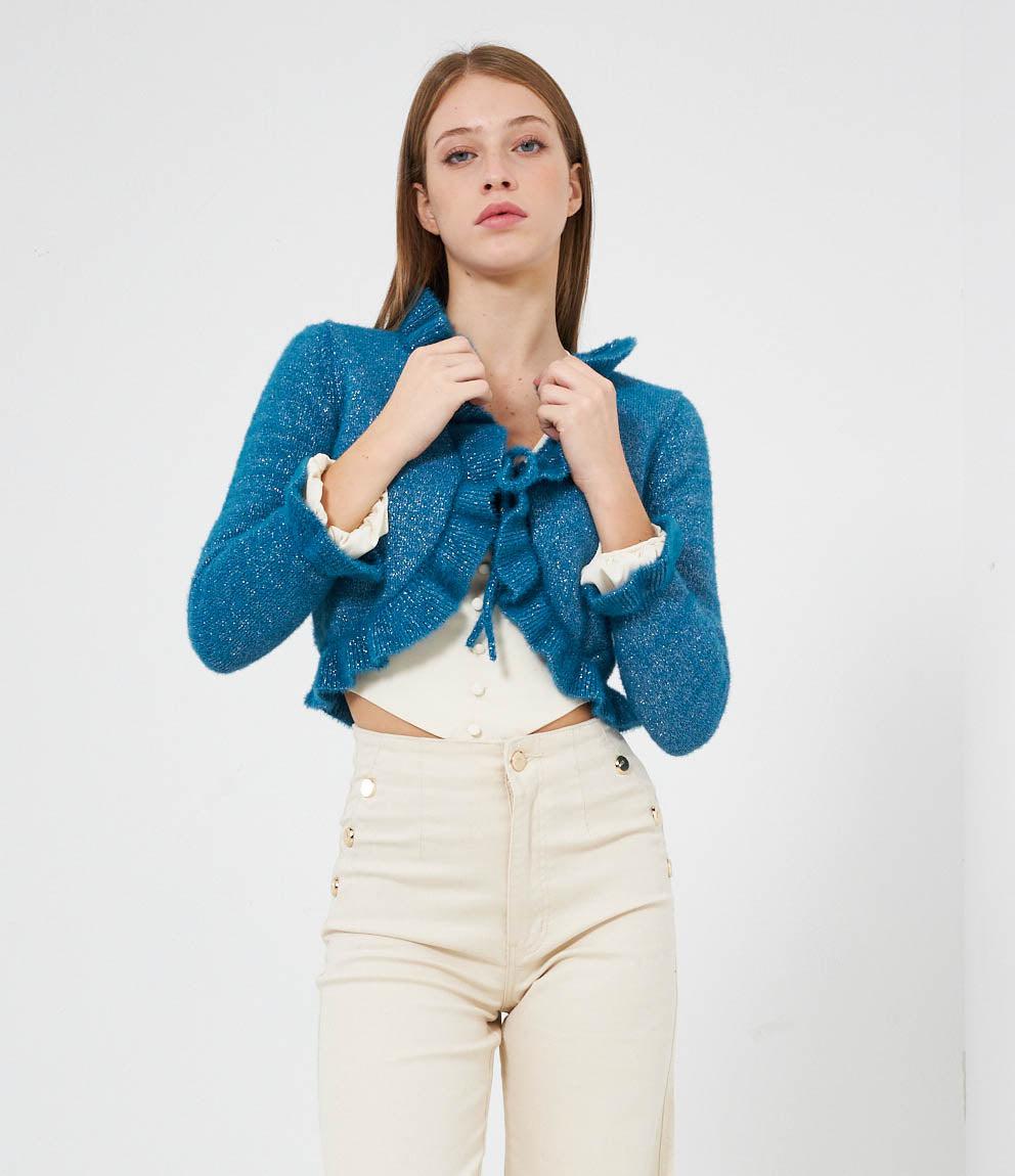 Coprispalle modello crop, bordi con rouches e chiusura con lacci centrale.