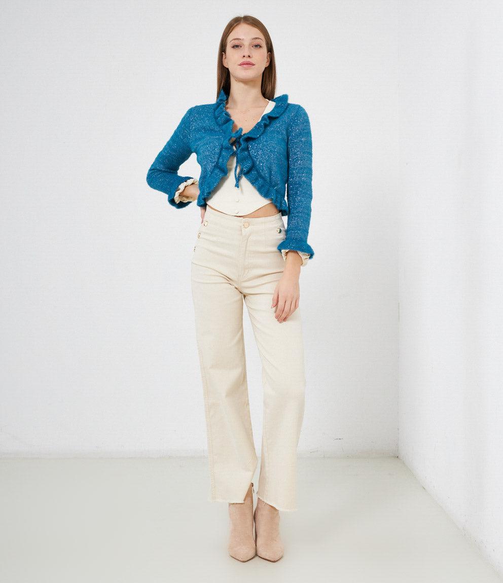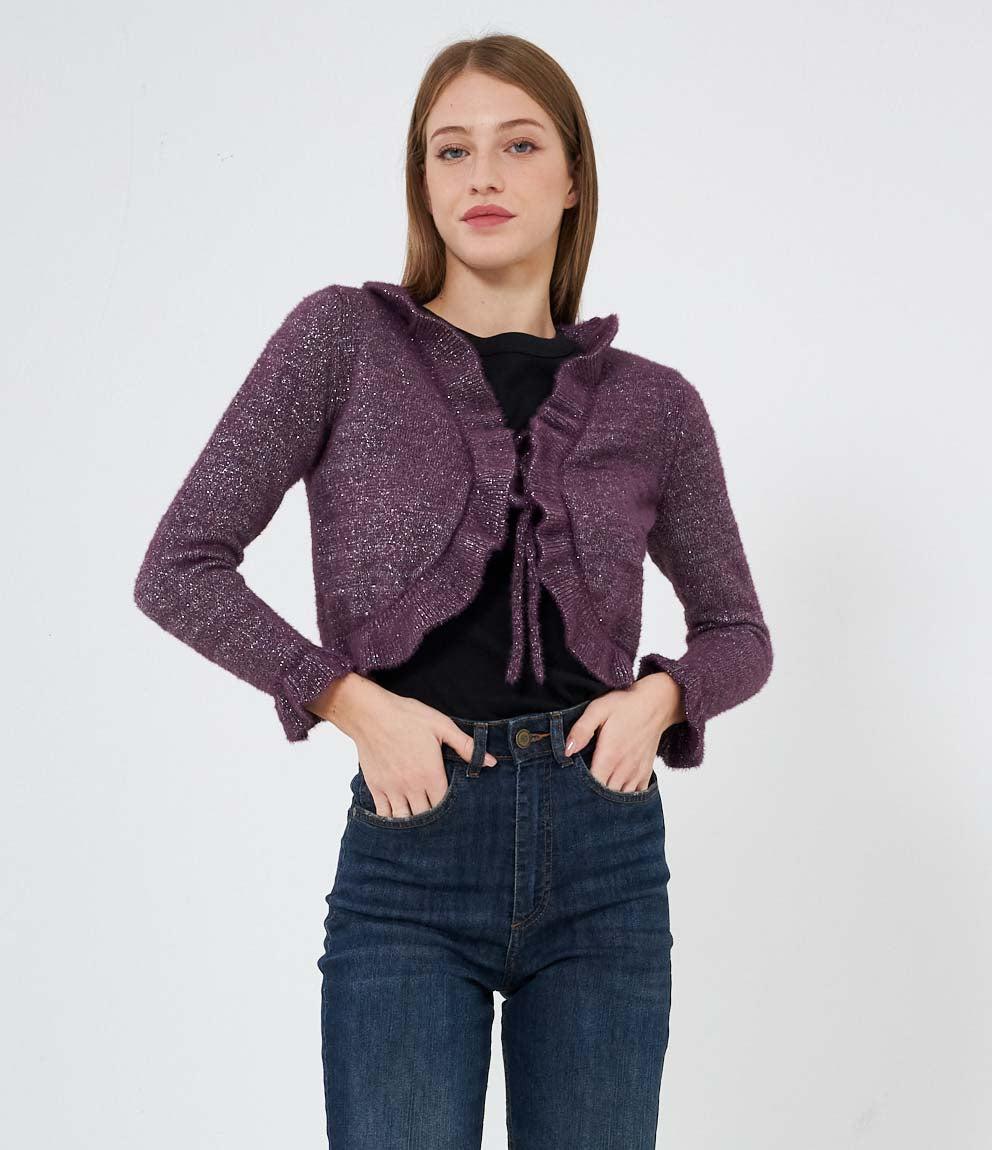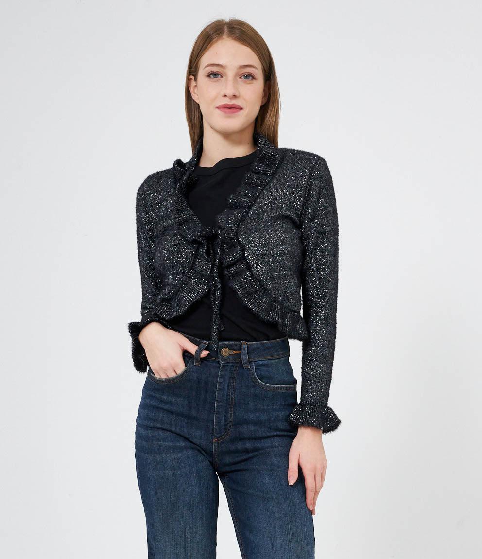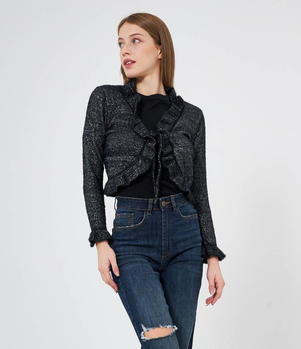 Coprispalle modello crop, bordi con rouches e chiusura con lacci centrale.
