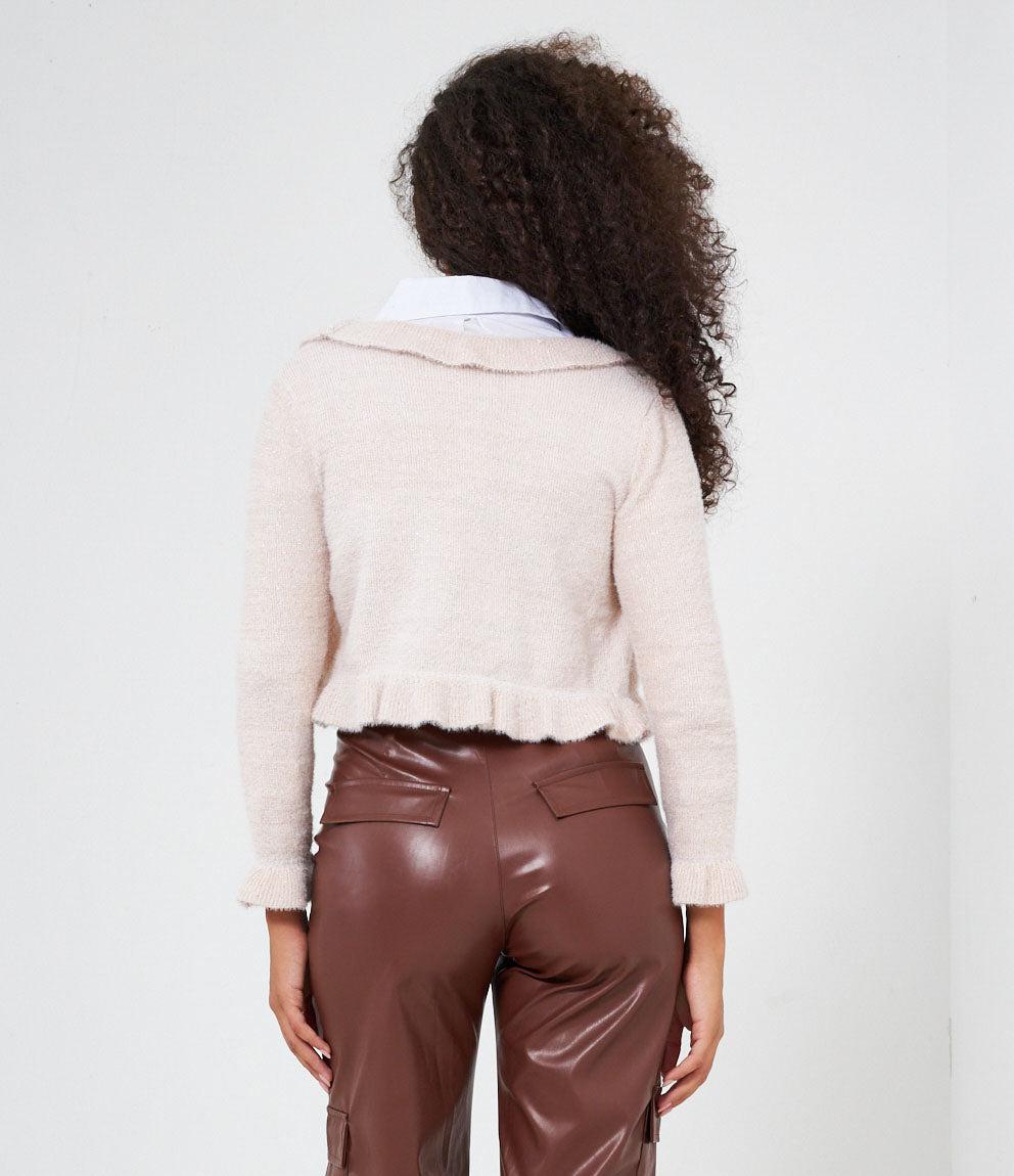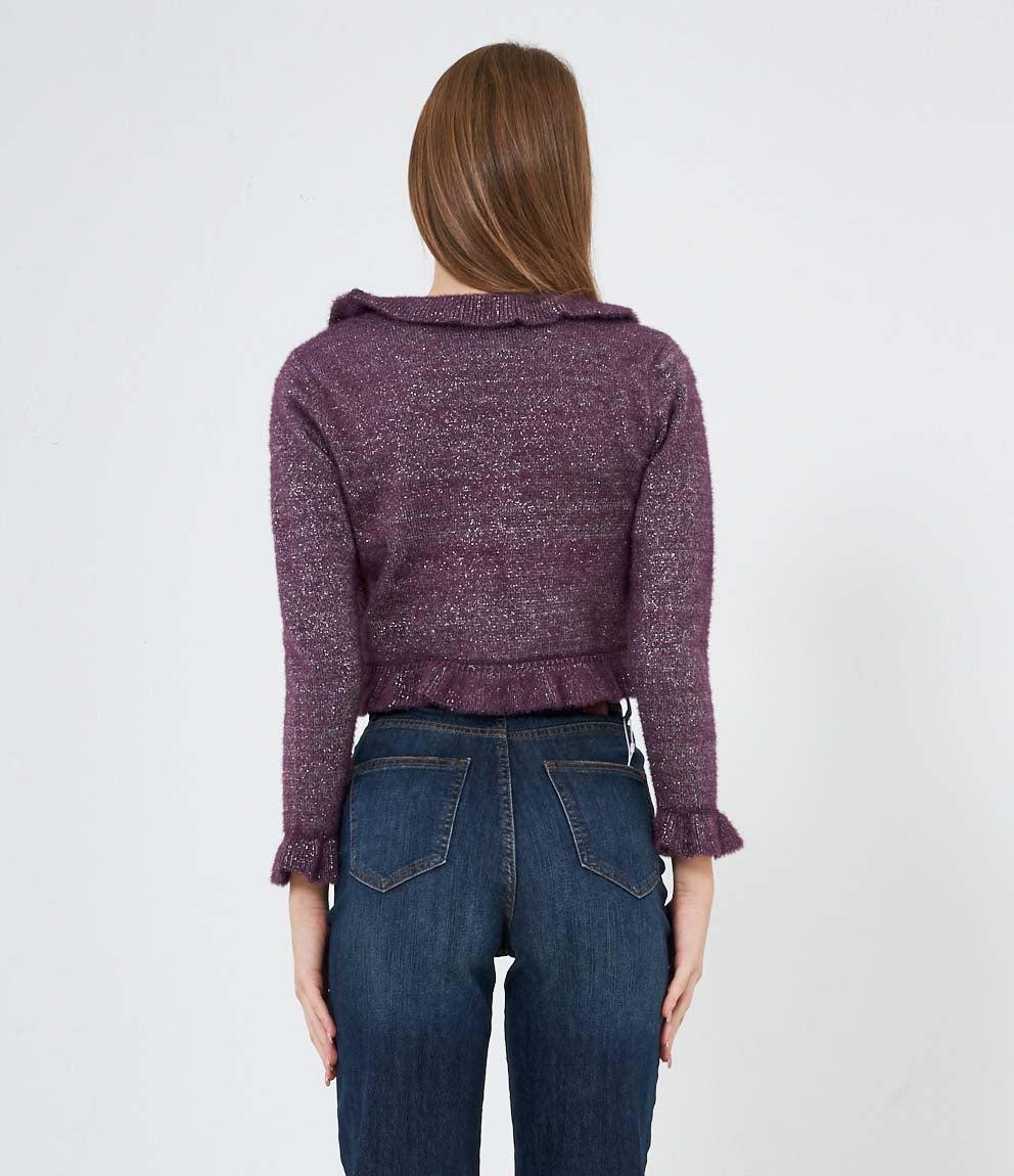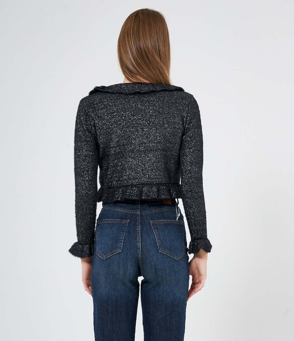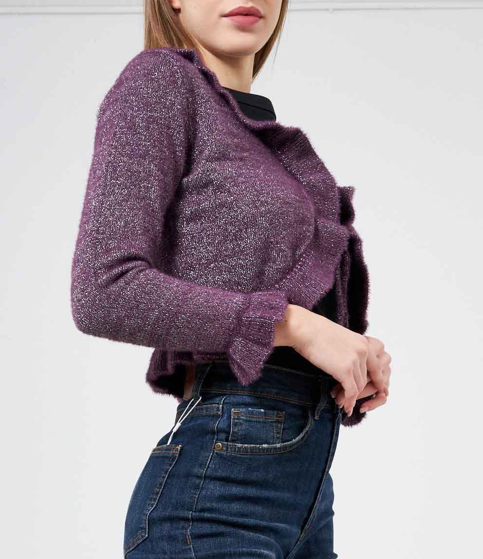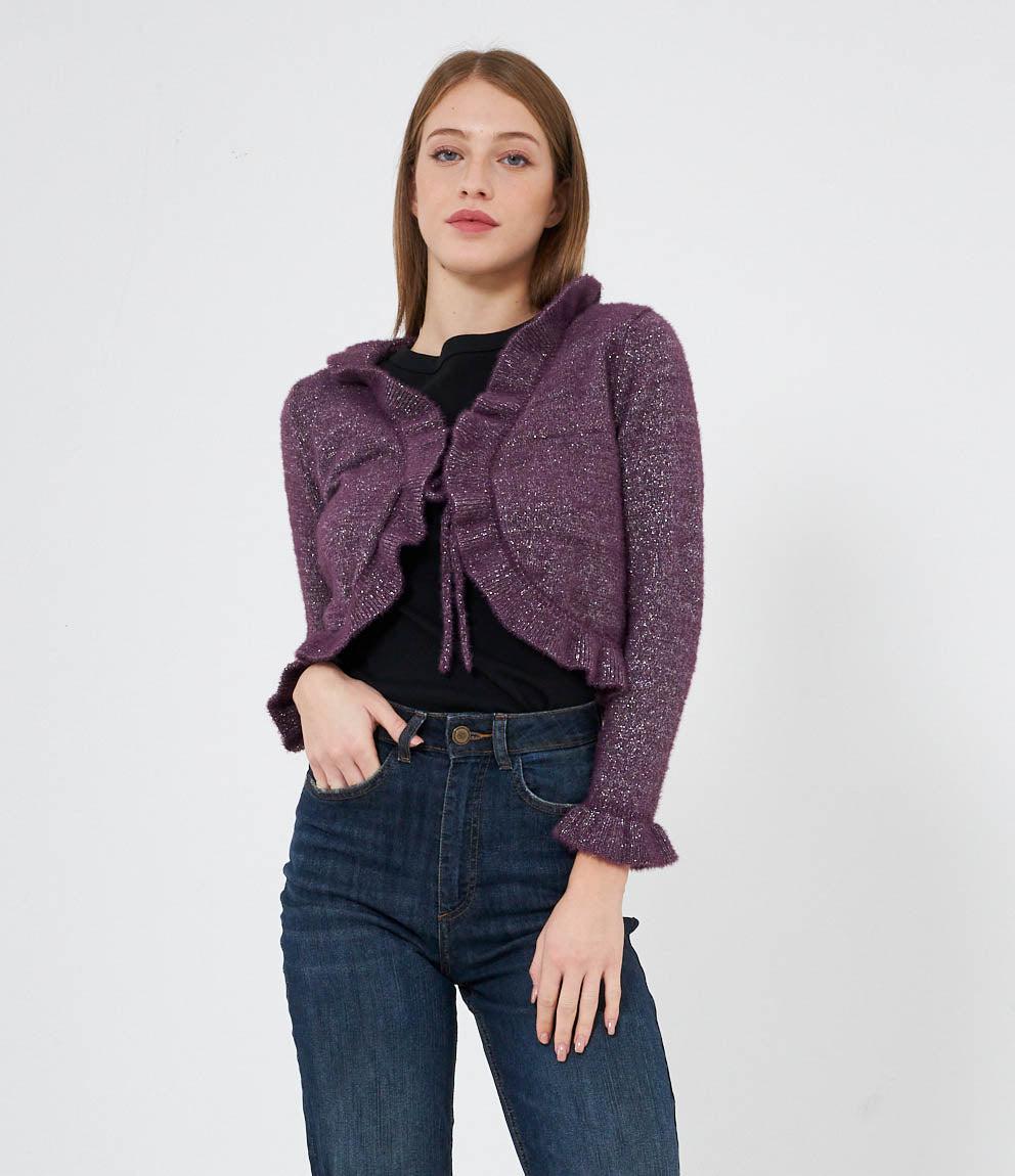 Coprispalle modello crop, bordi con rouches e chiusura con lacci centrale.