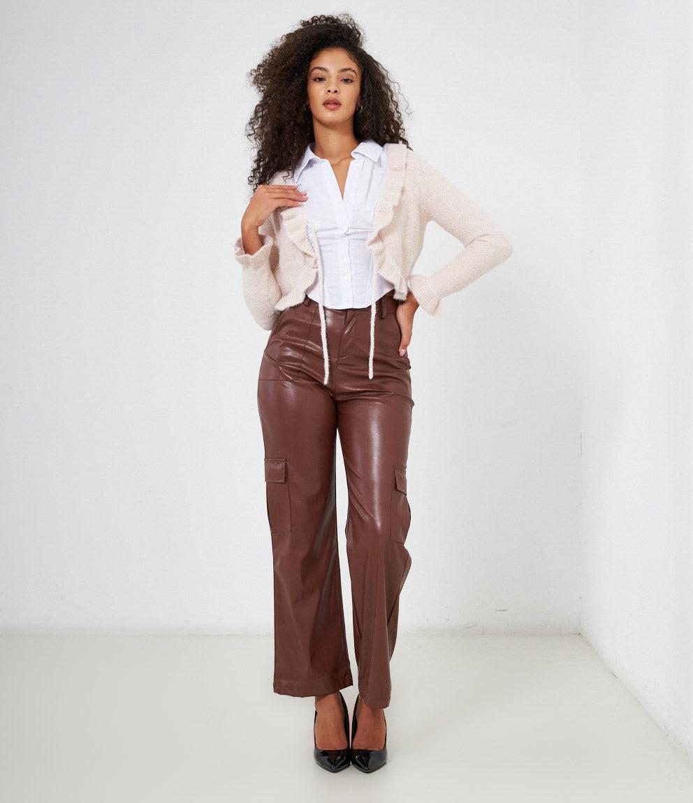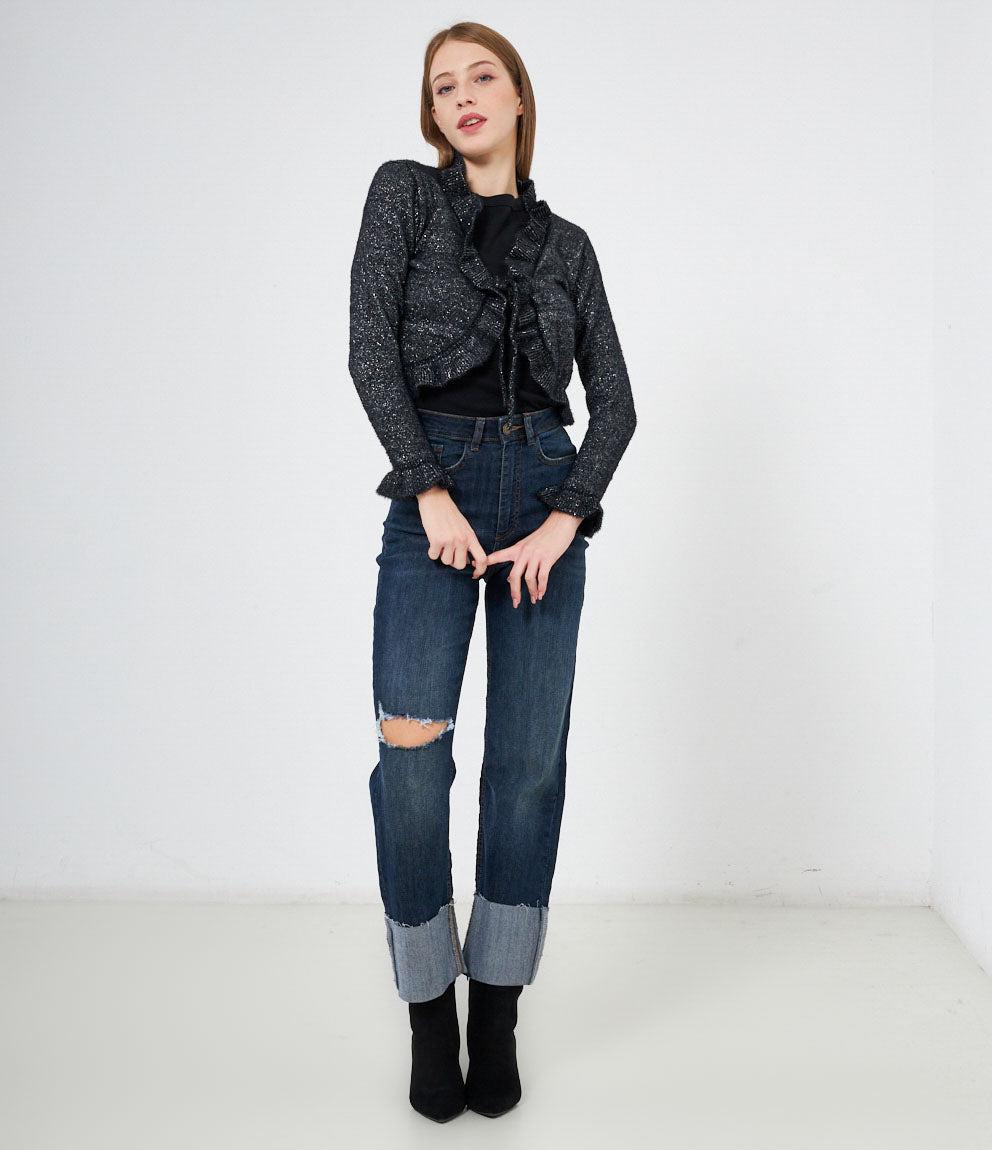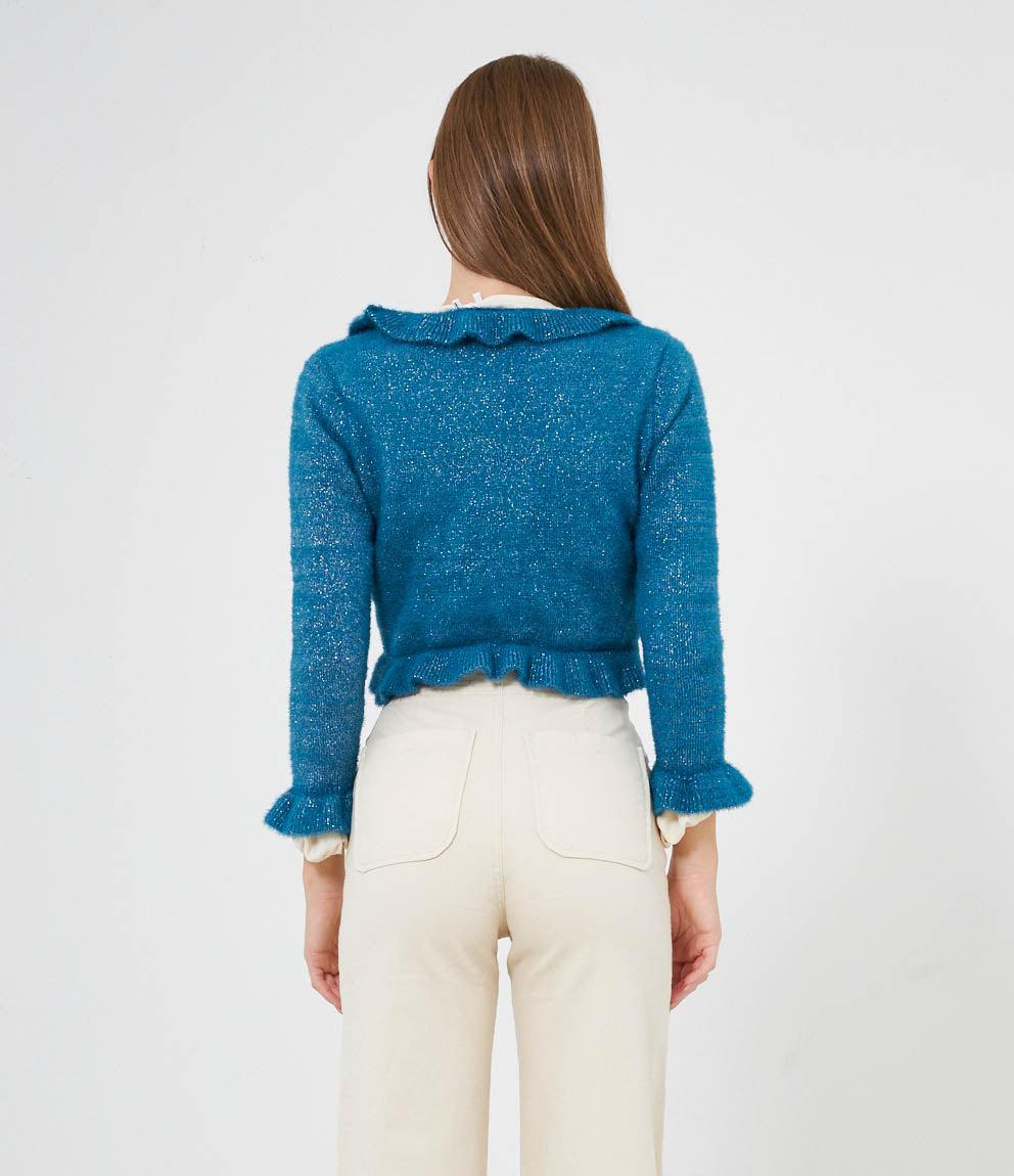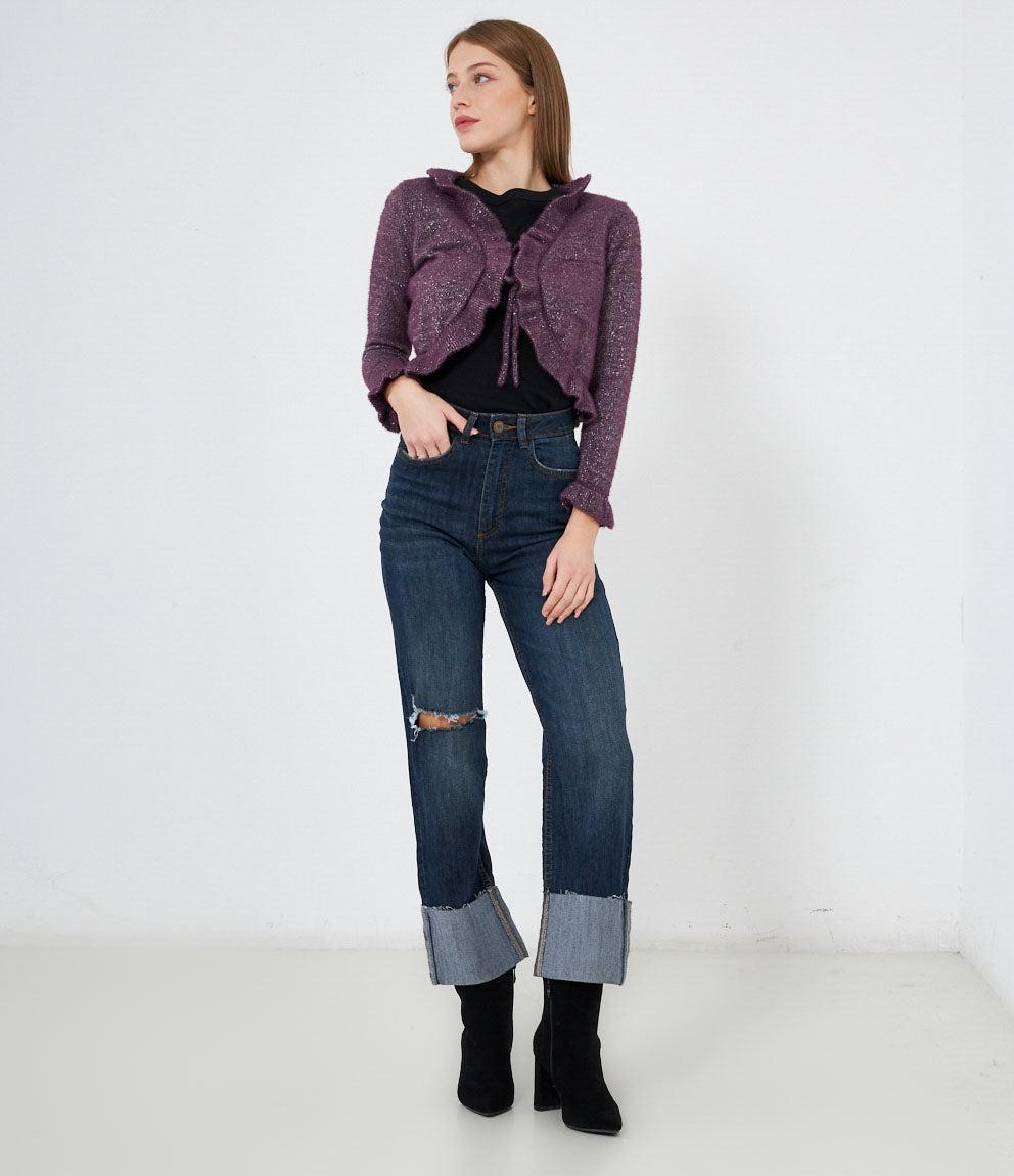Coprispalle modello crop, bordi con rouches e chiusura con lacci centrale.