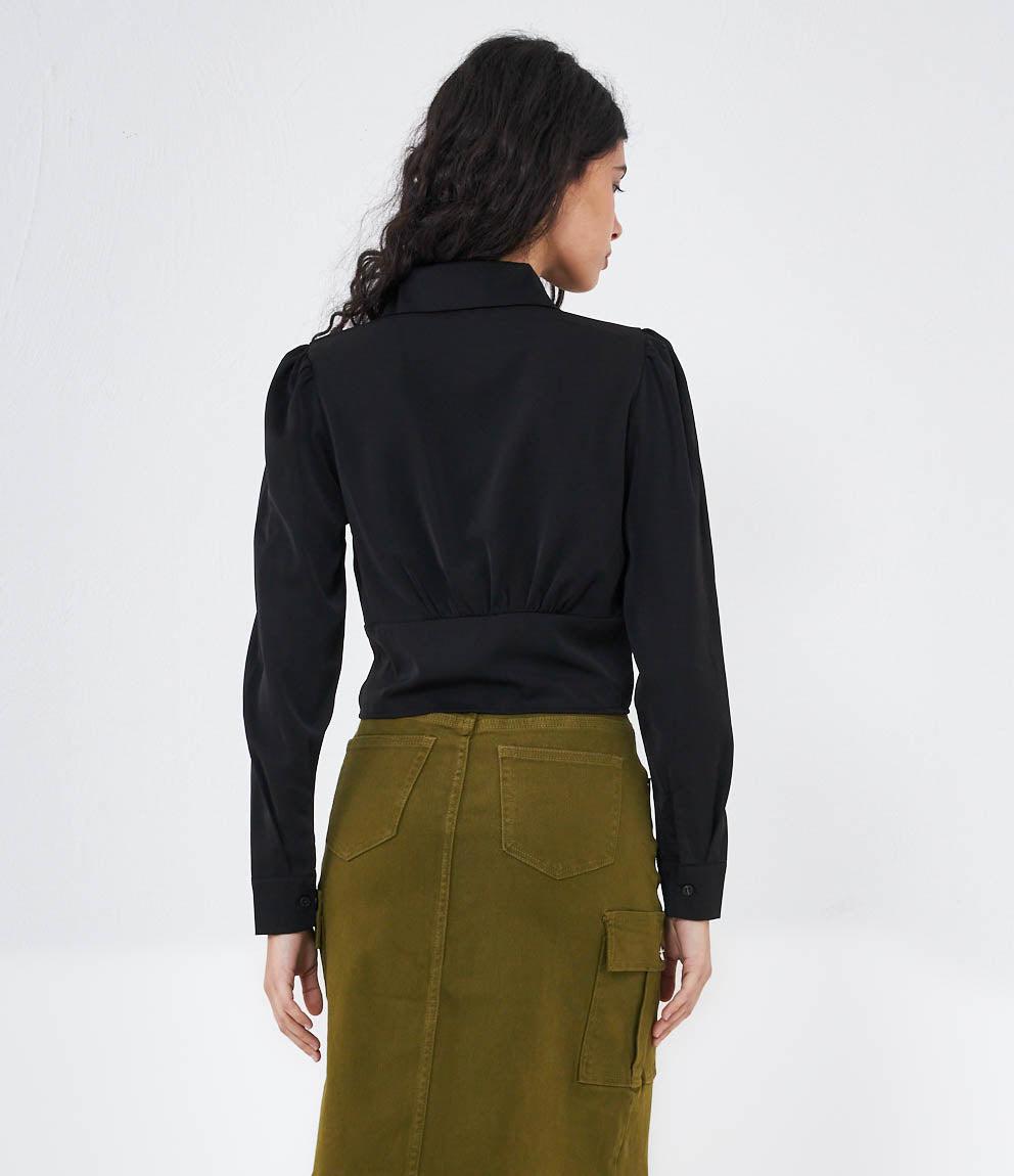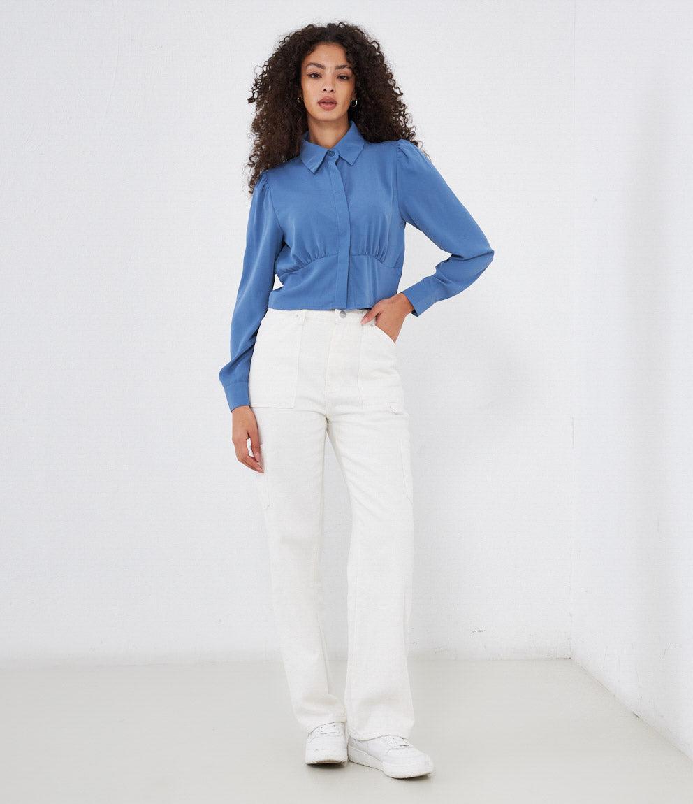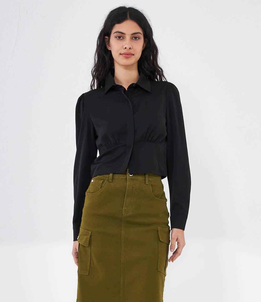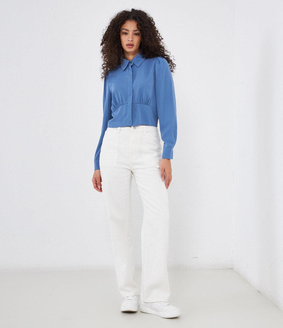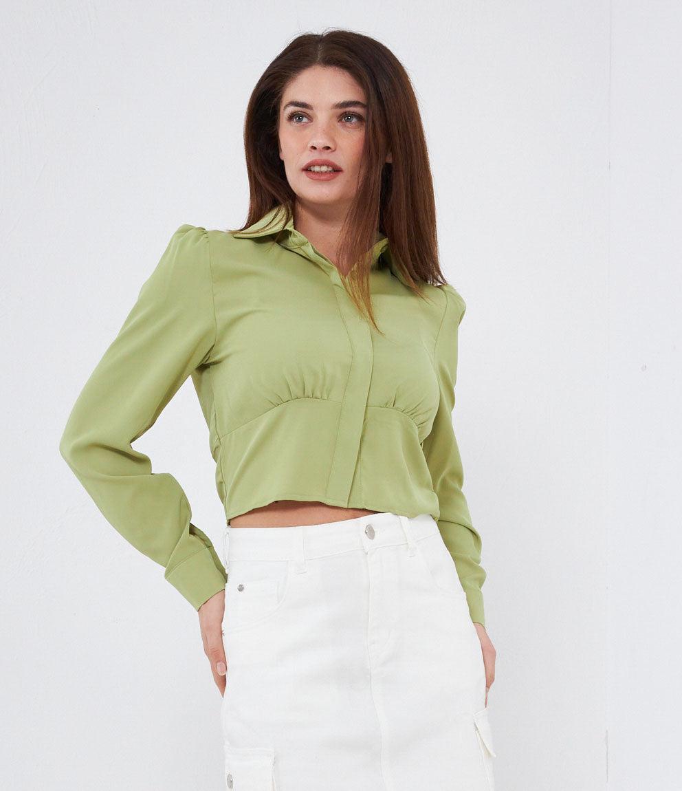 Cropped shirt with hidden buttons, long sleeves and cuffs with button.