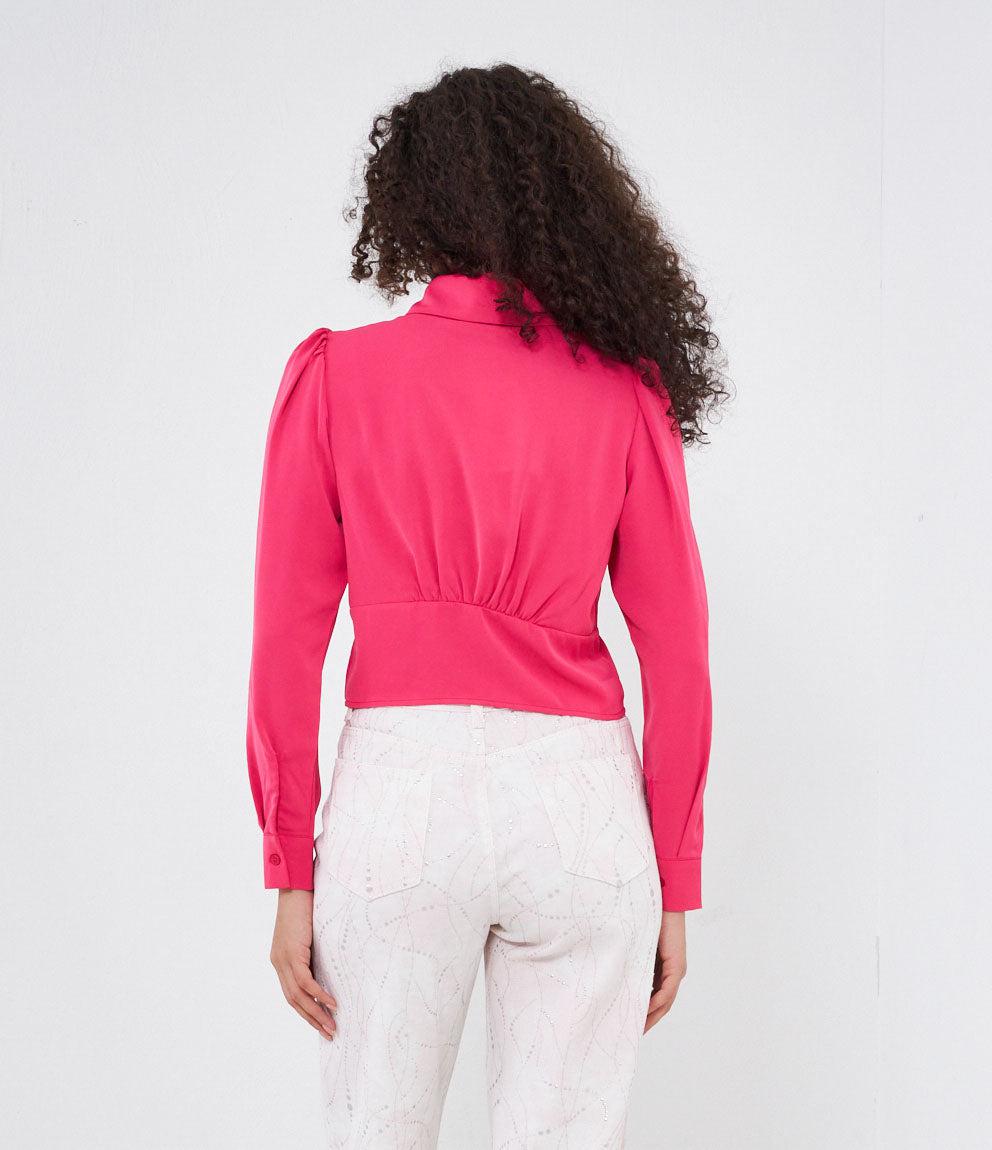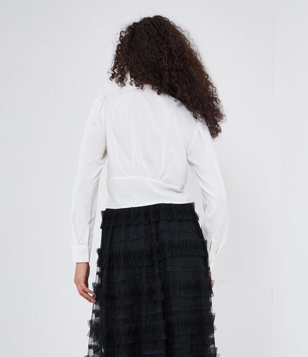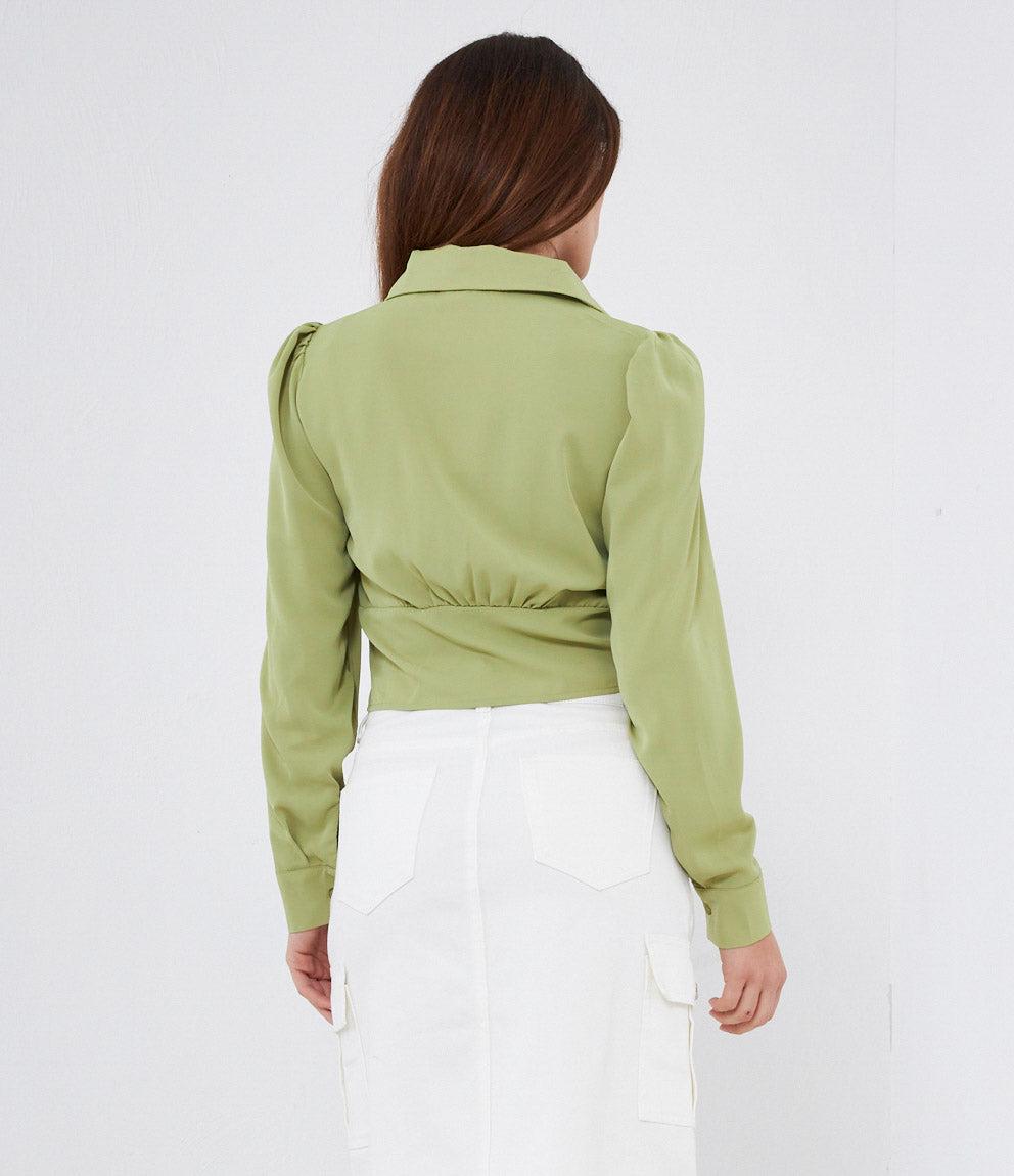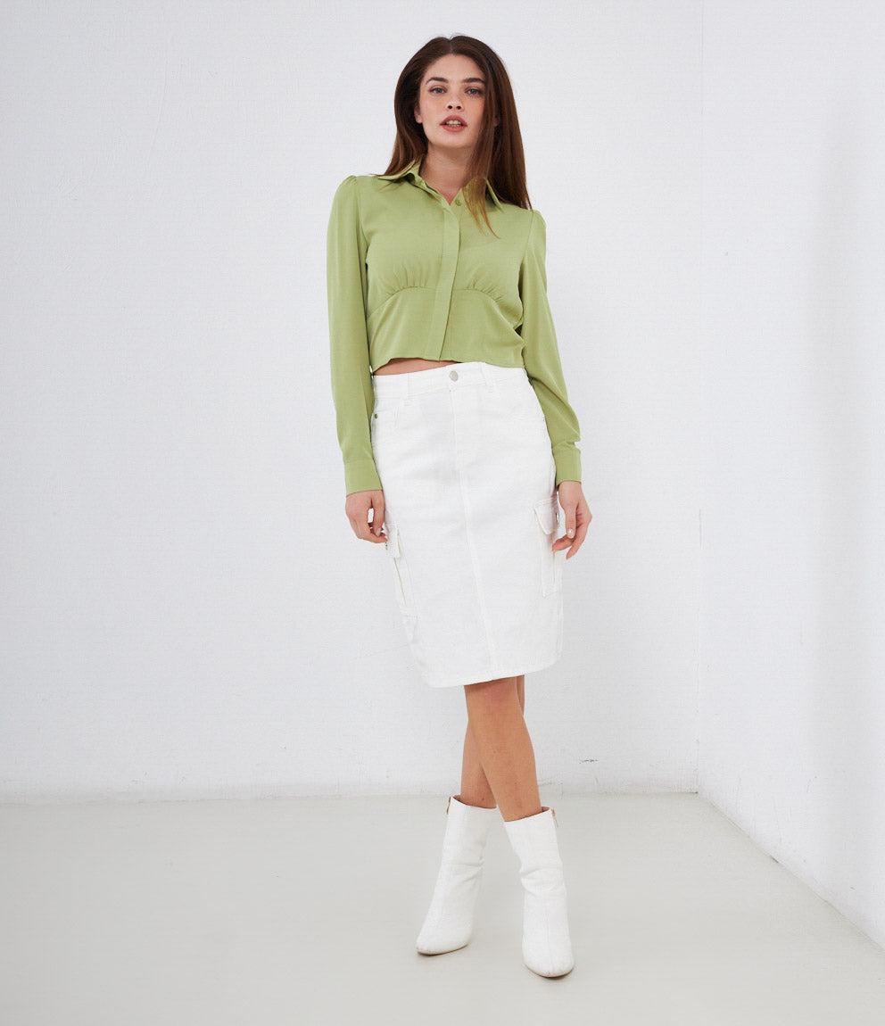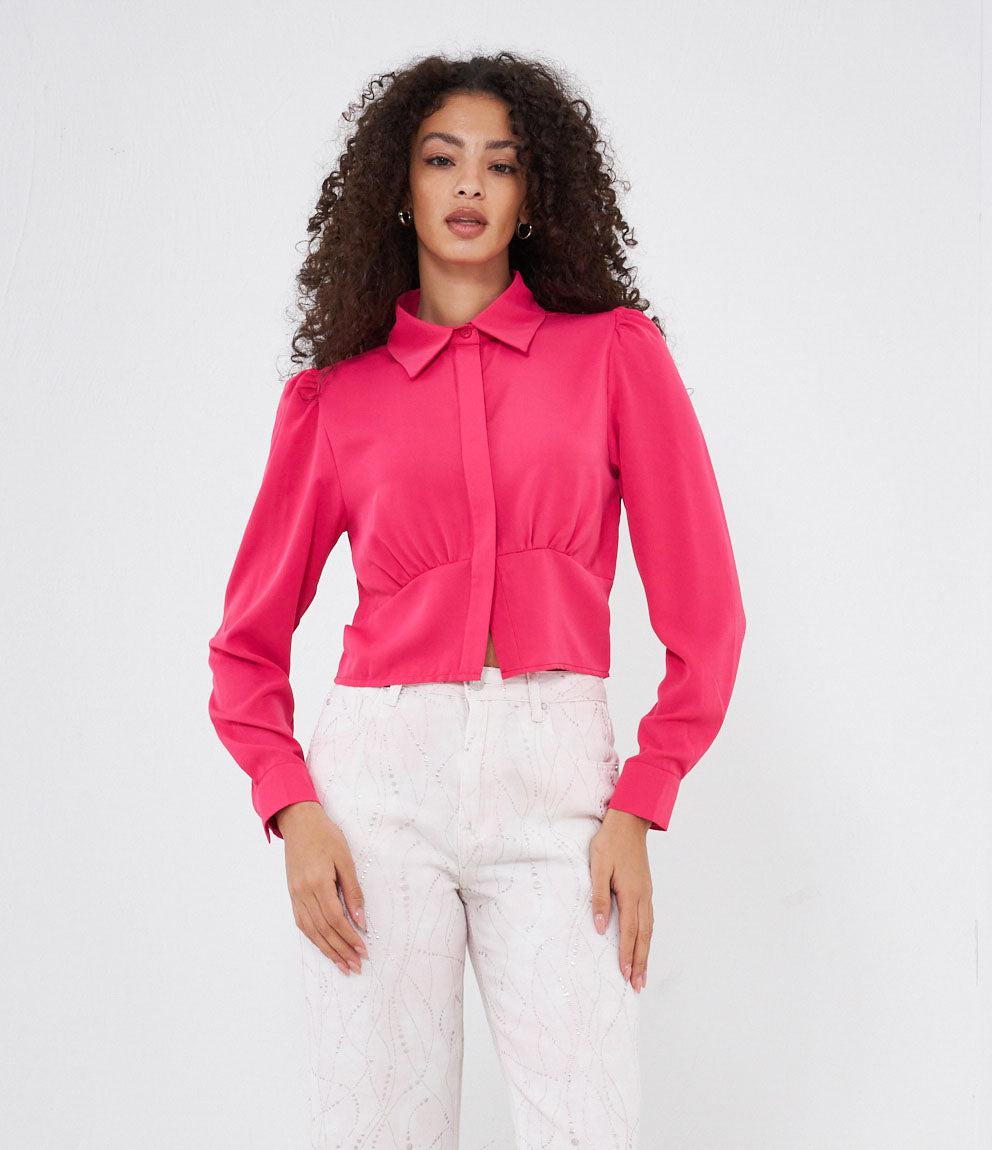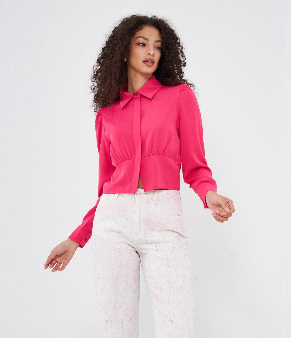Cropped shirt with hidden buttons, long sleeves and cuffs with button.