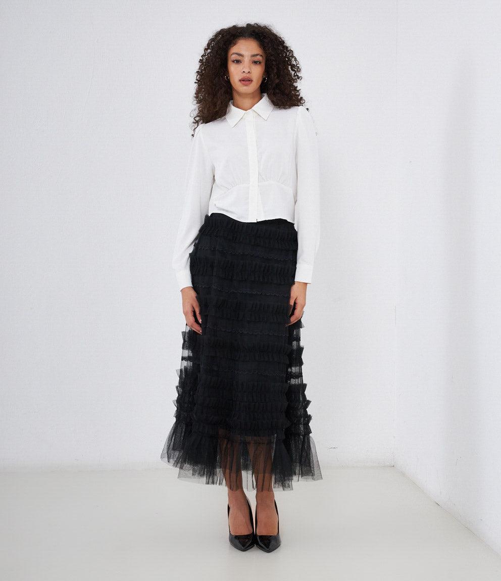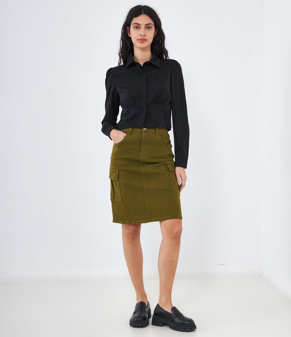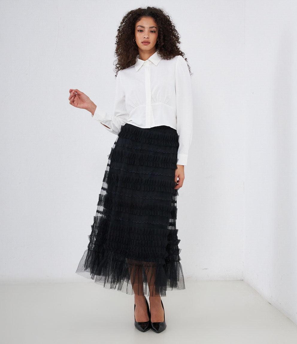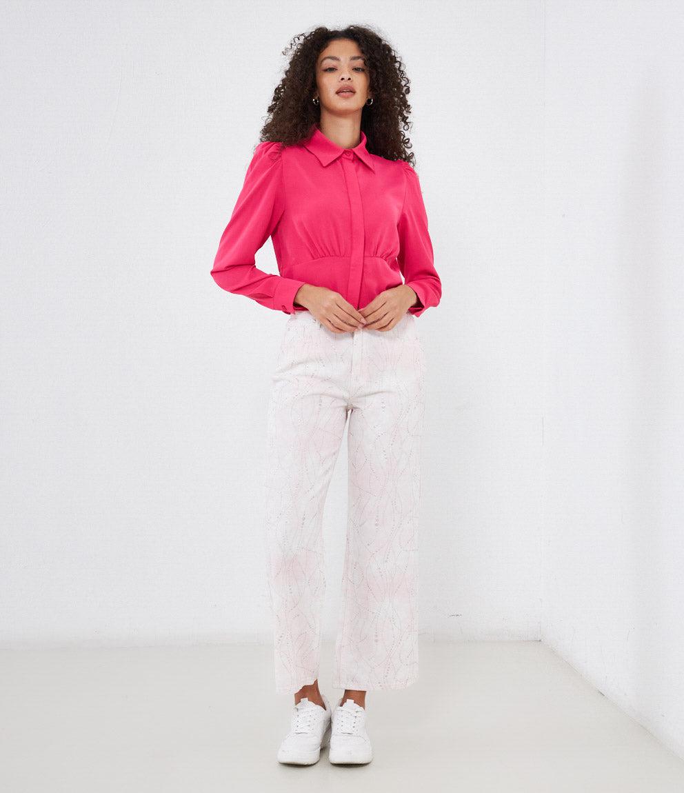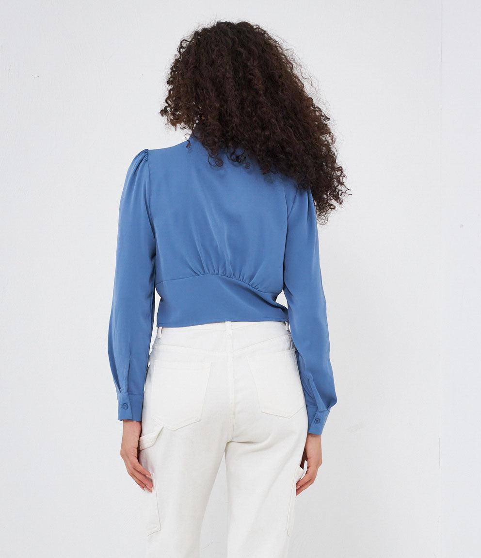 Cropped shirt with hidden buttons, long sleeves and cuffs with button.