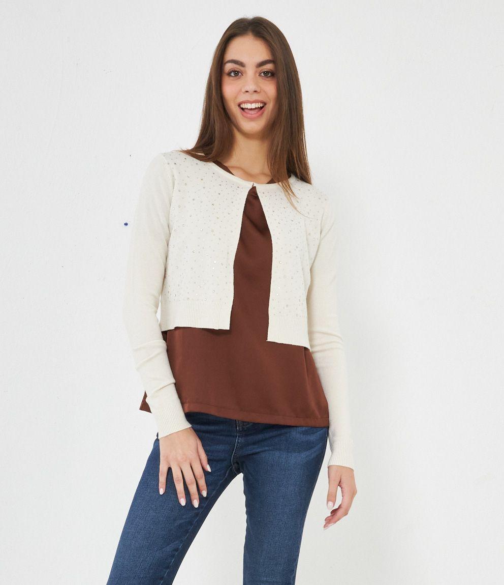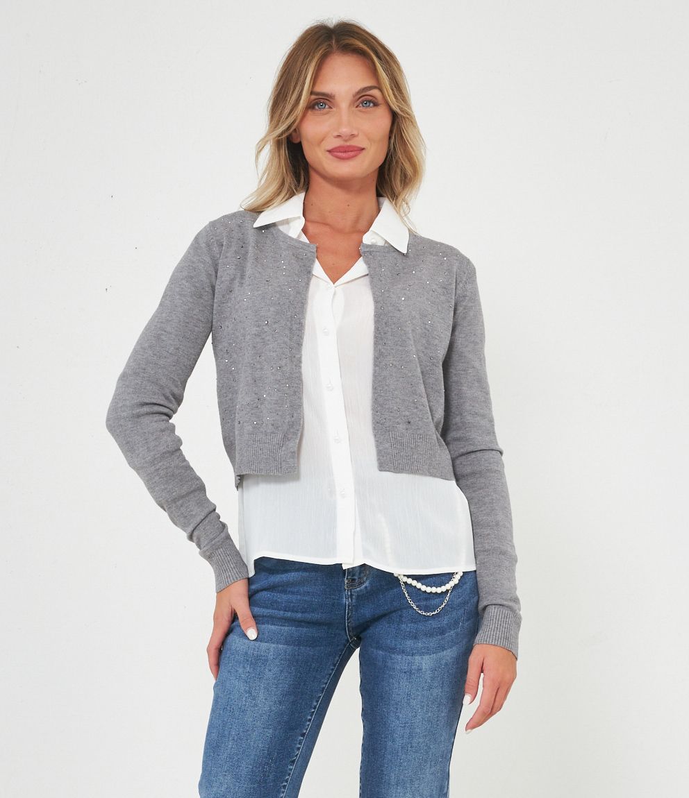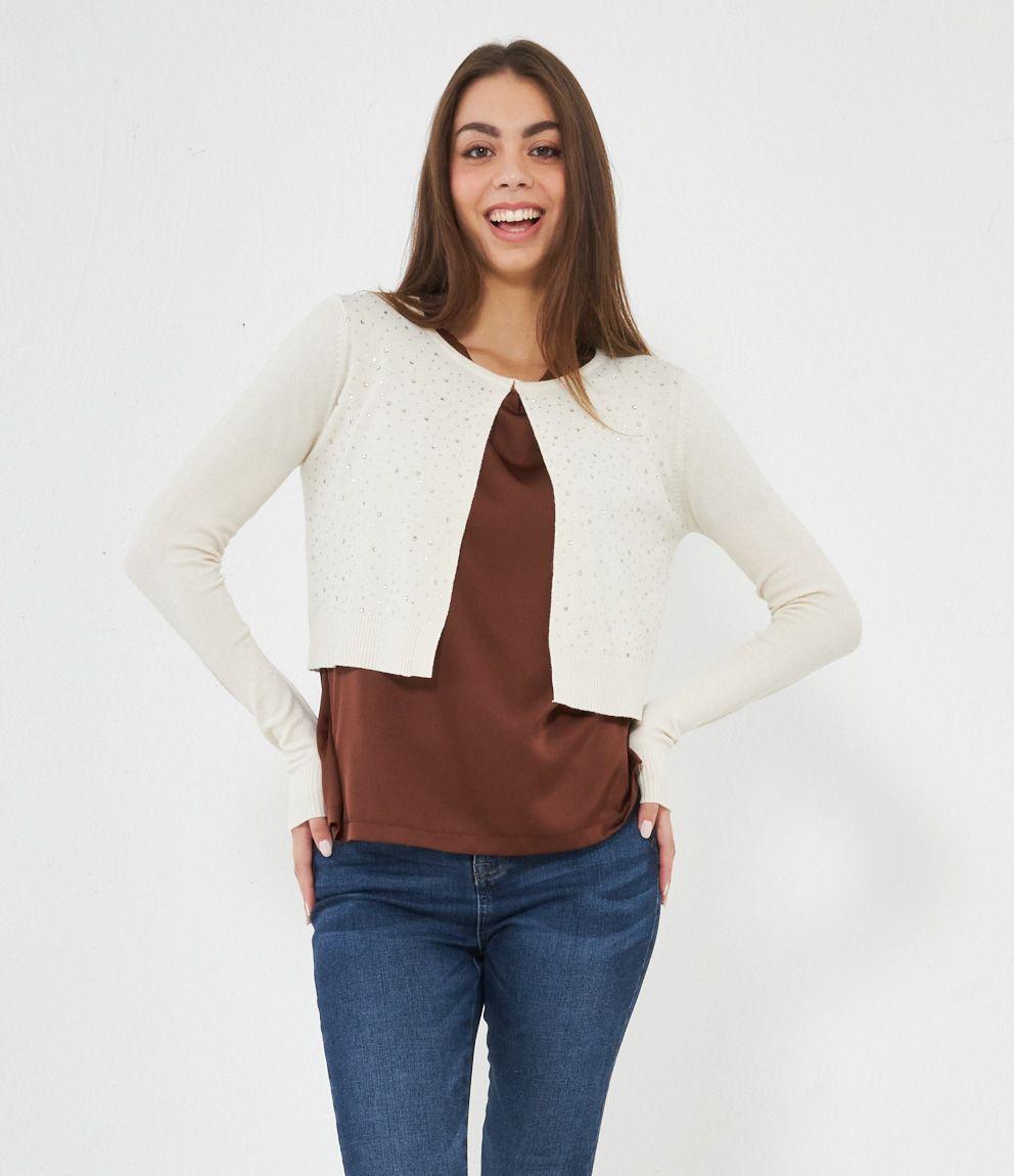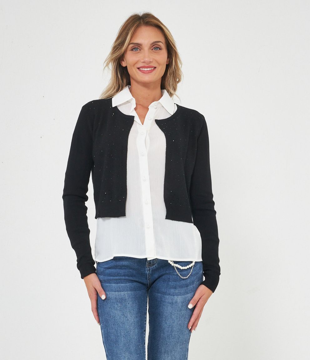 Cardigan modello crop con strass, scollo tondo e chiusura con gancio metallico.