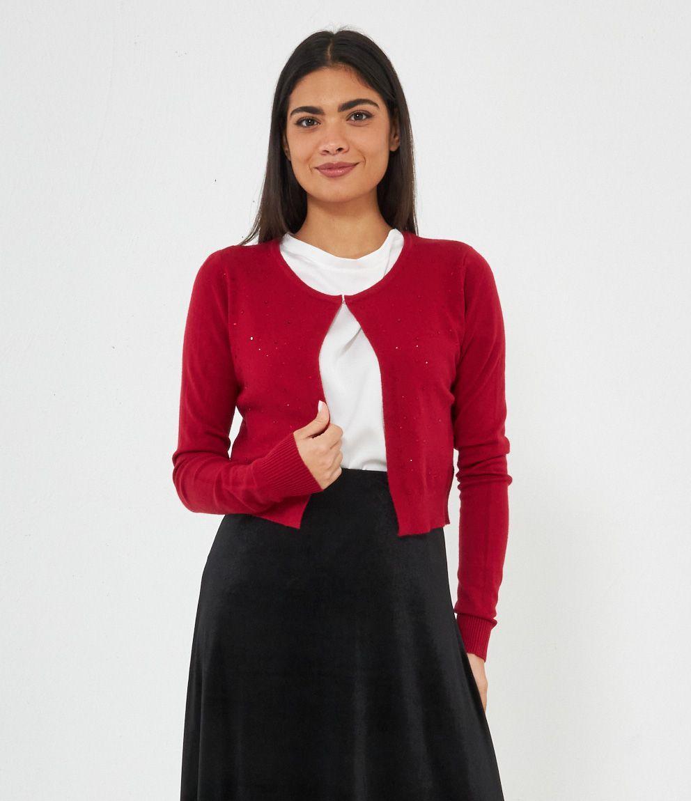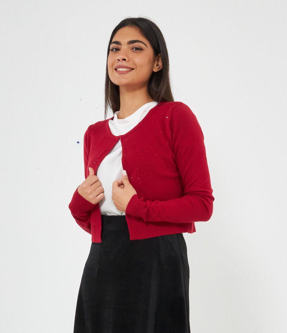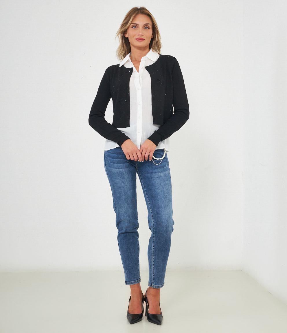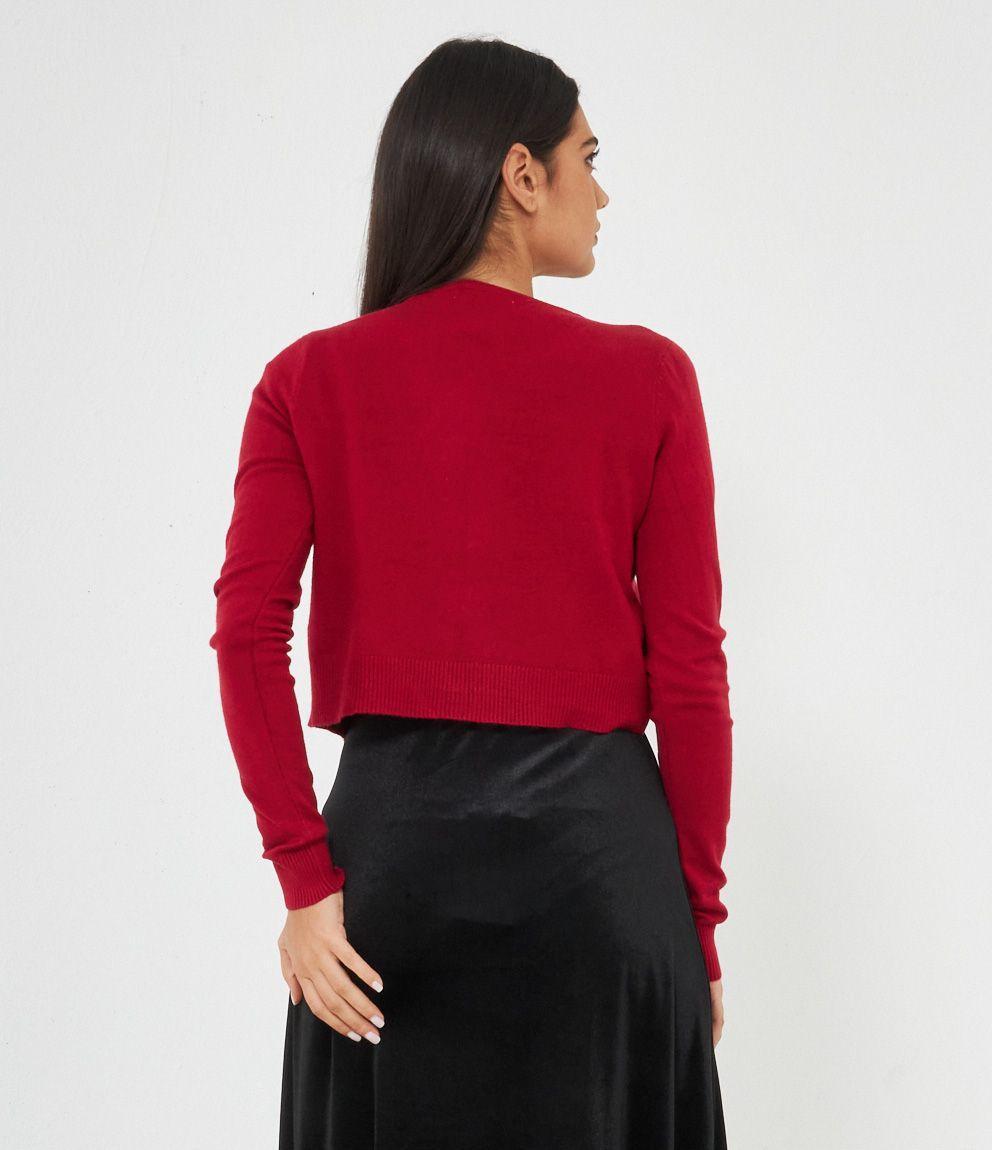 Cardigan modello crop con strass, scollo tondo e chiusura con gancio metallico.