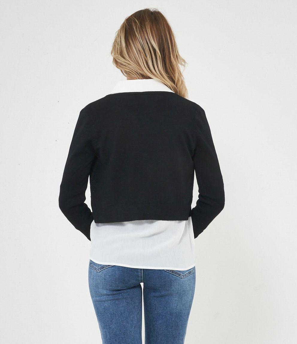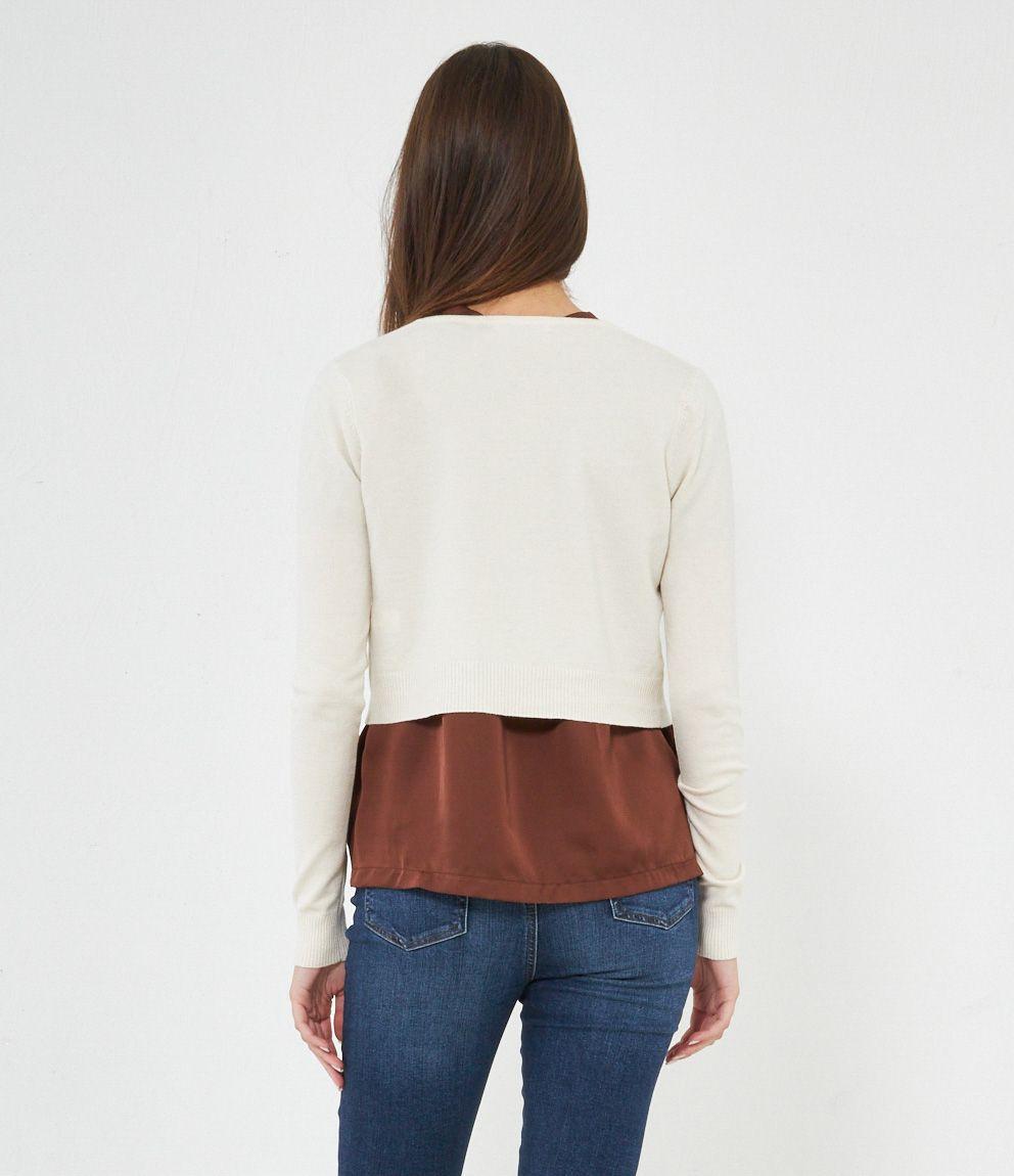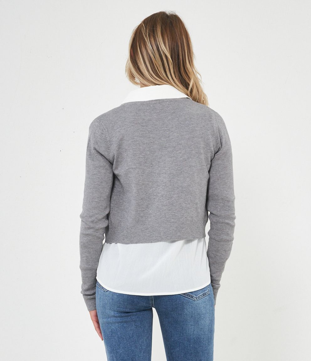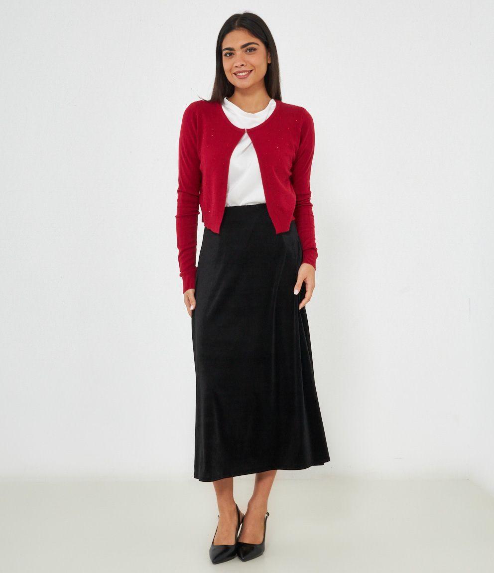 Cardigan modello crop con strass, scollo tondo e chiusura con gancio metallico.