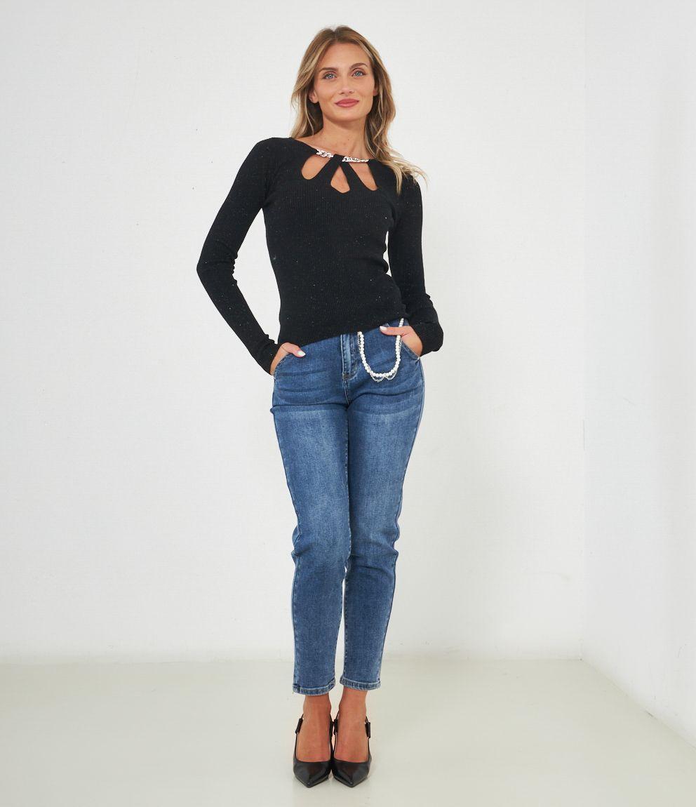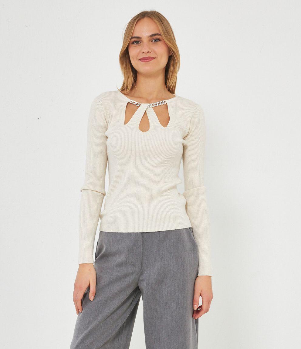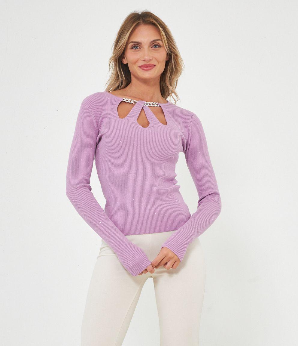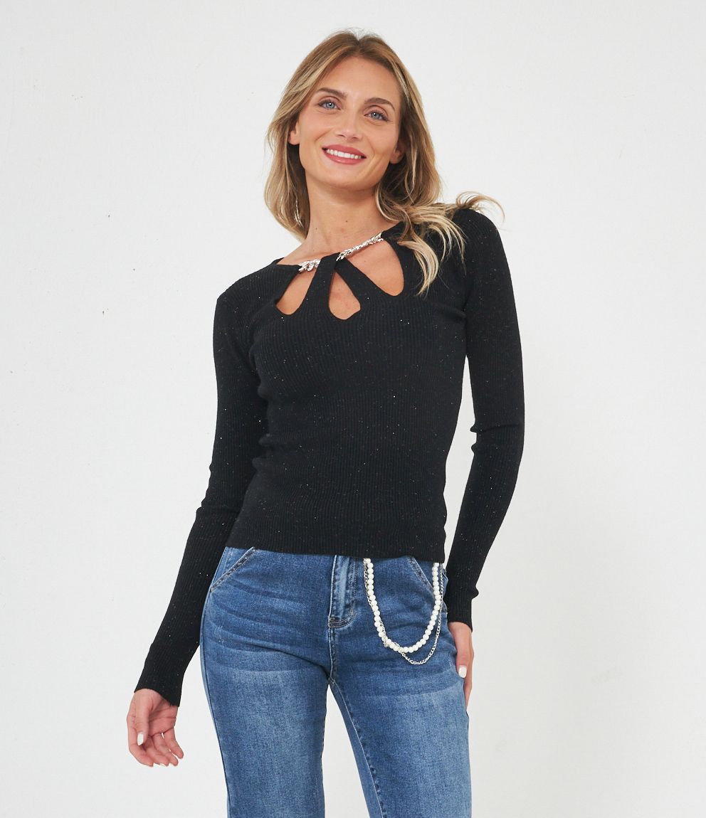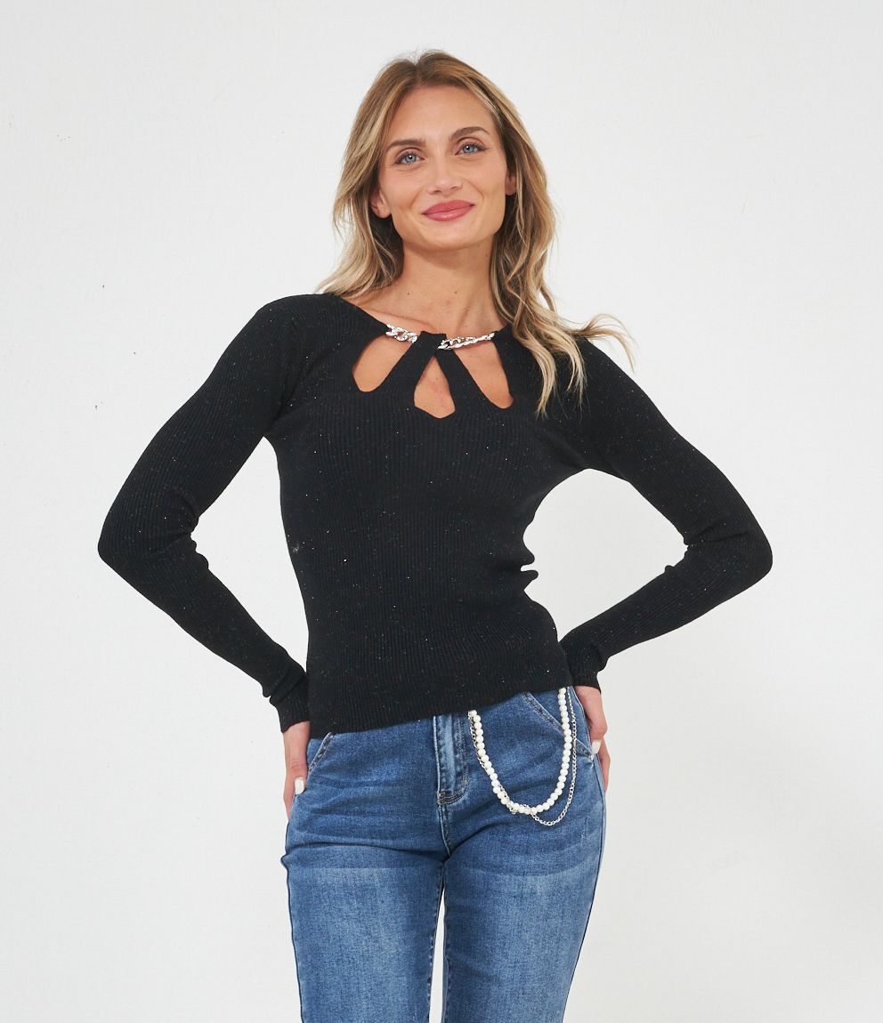 Maglia a costine lurex, slim fit e scollo con cut out e catena con strass.