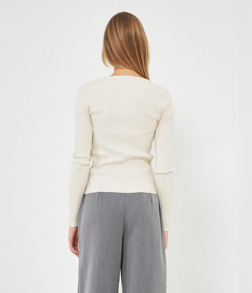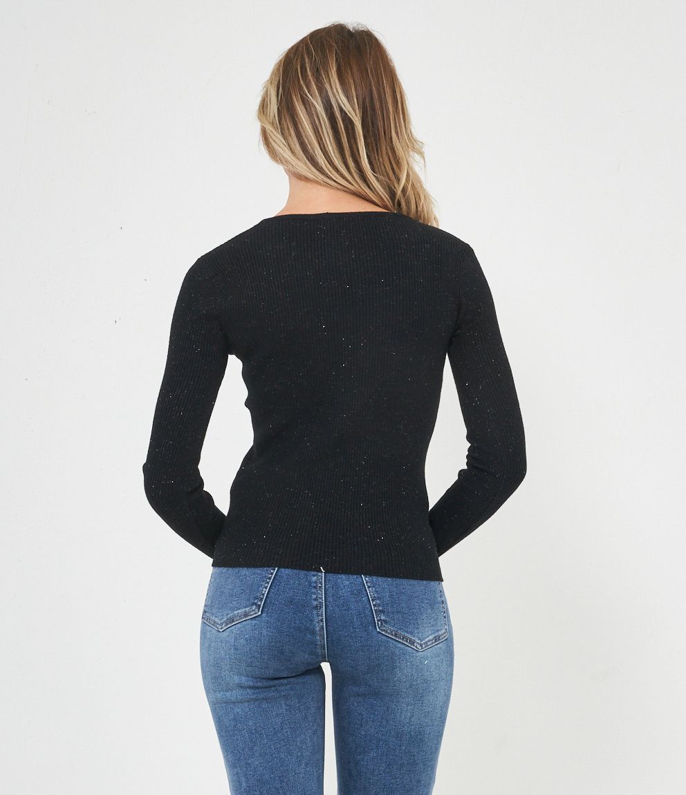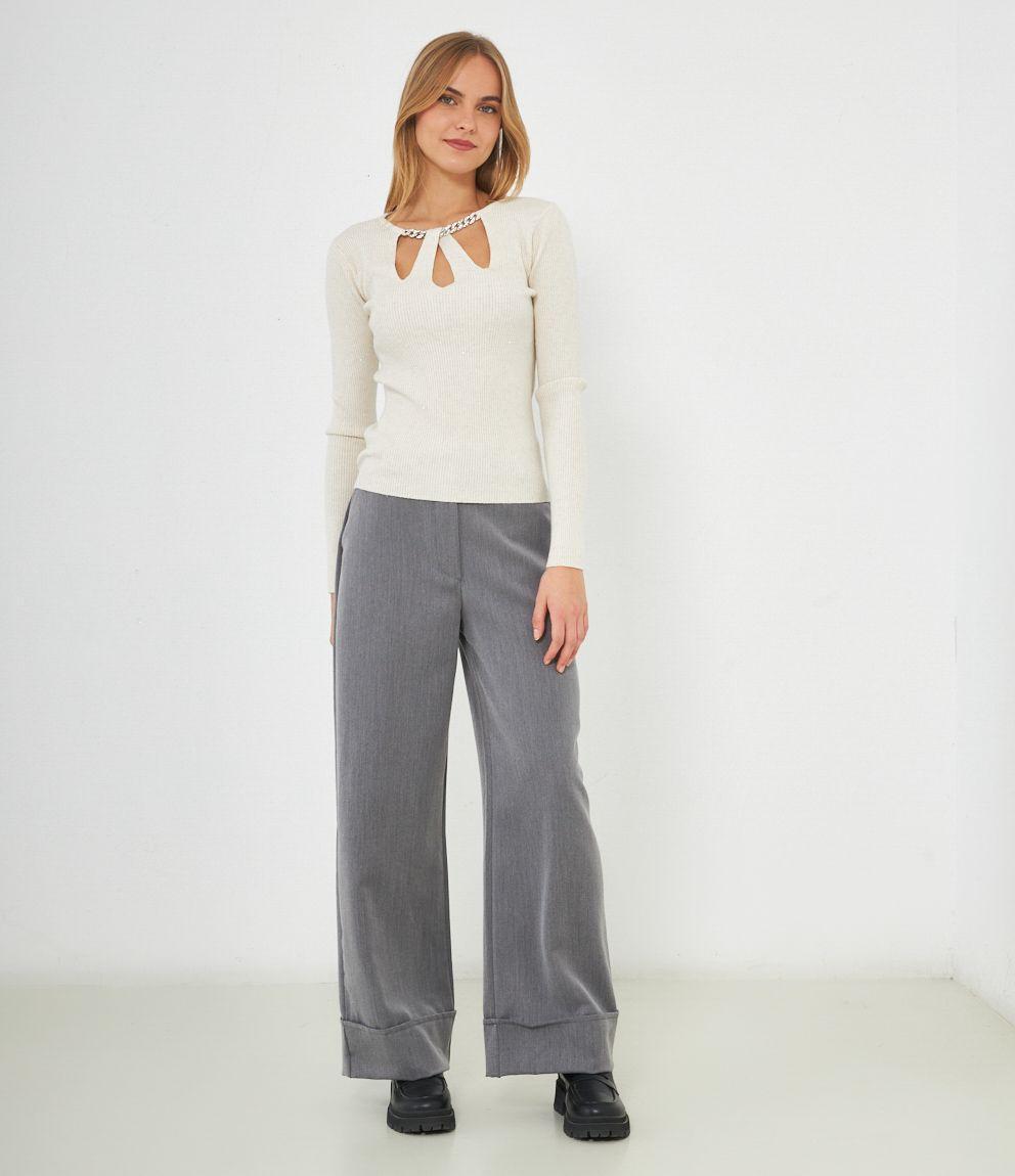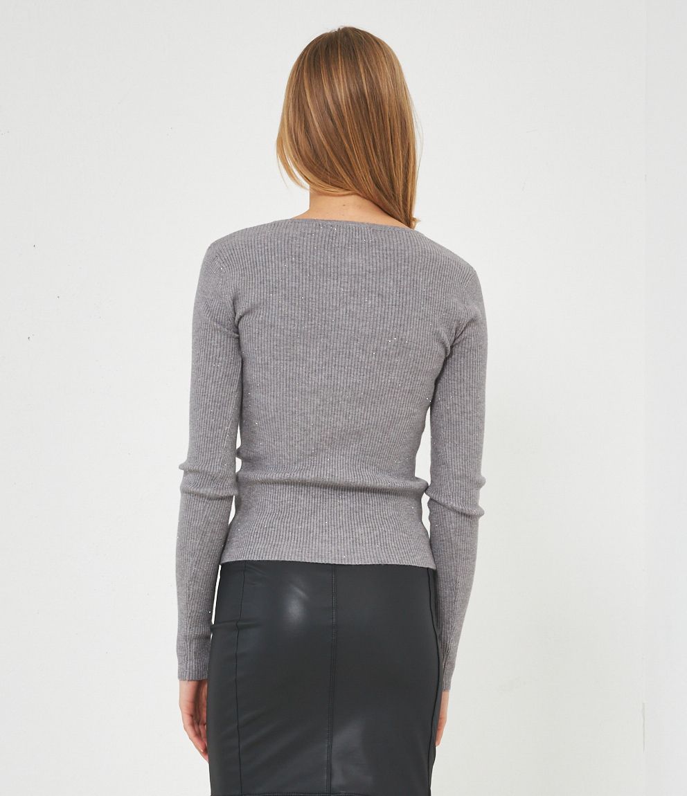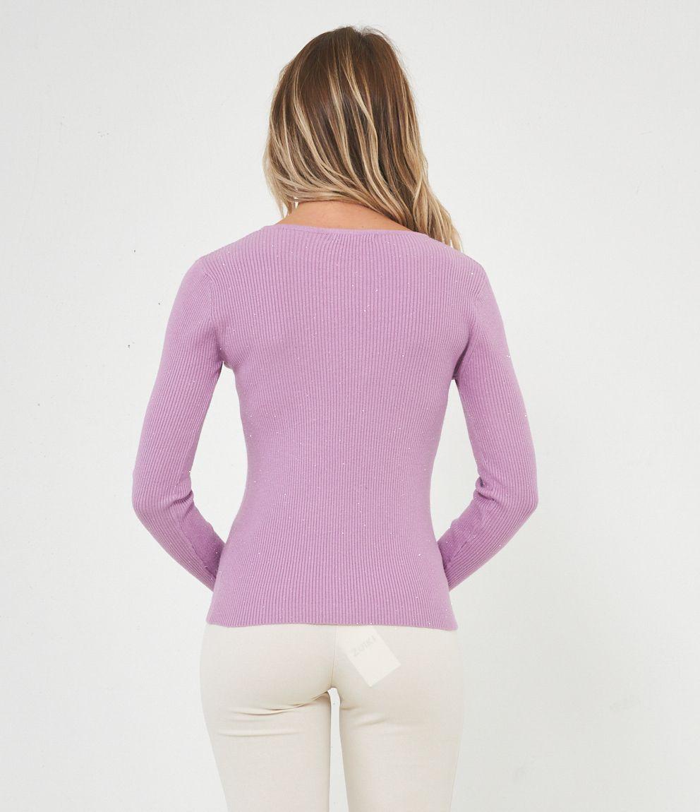 Maglia a costine lurex, slim fit e scollo con cut out e catena con strass.