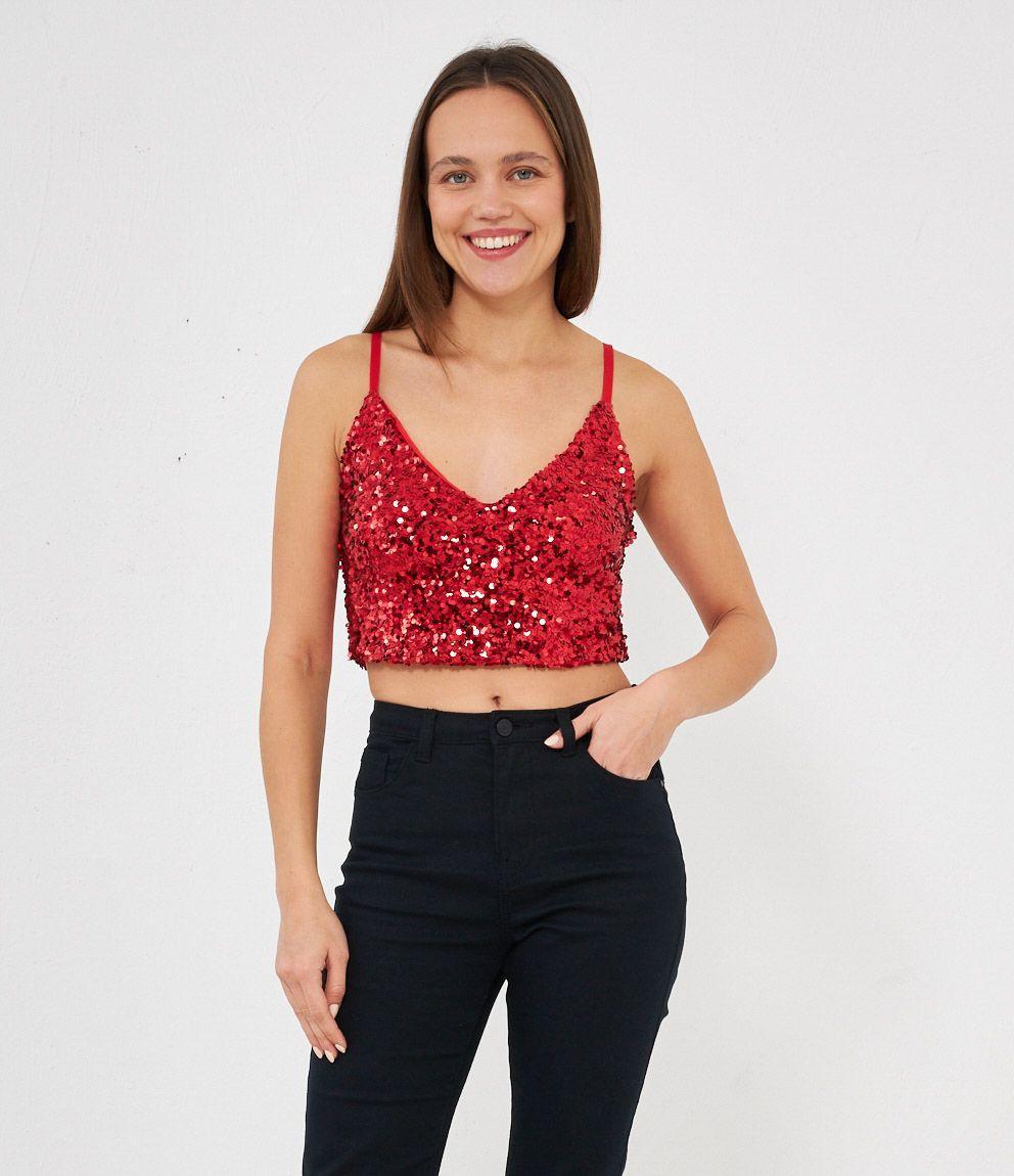 Top modello crop in paillettes, spalline regolabili e chiusura con zip.