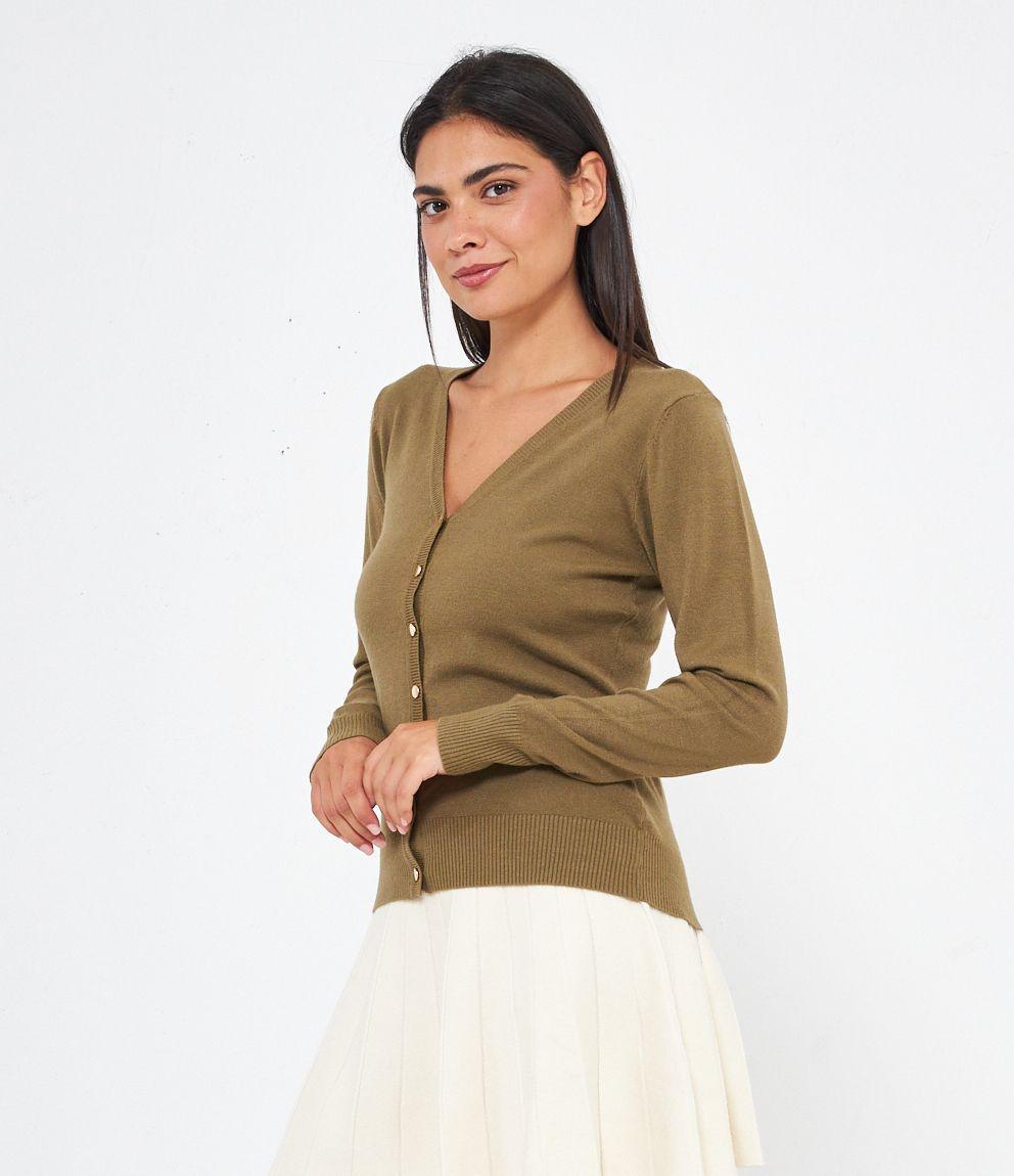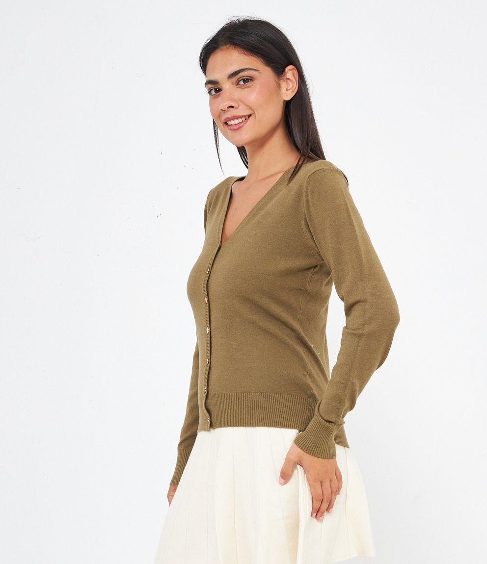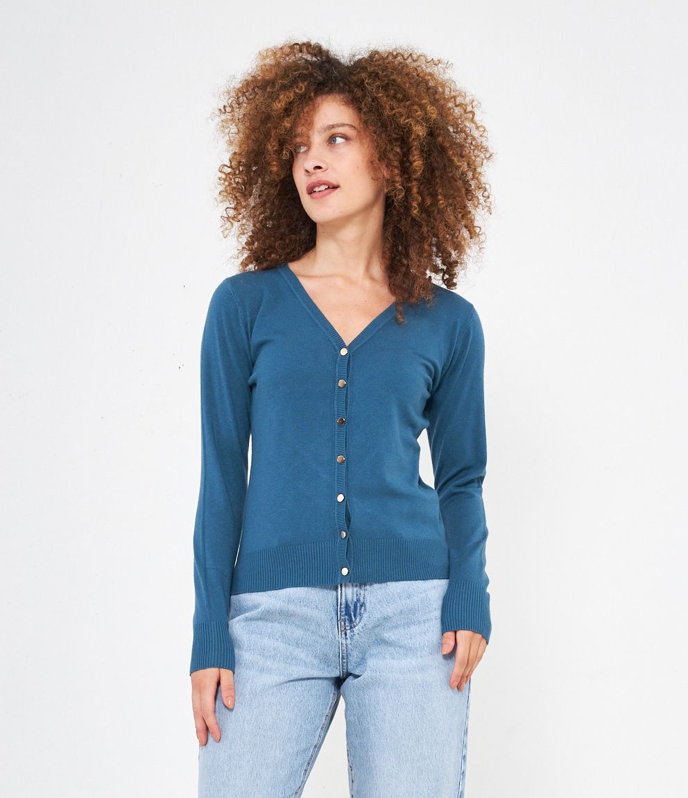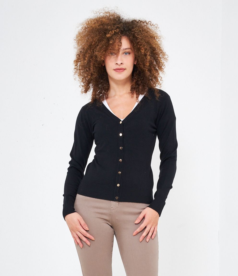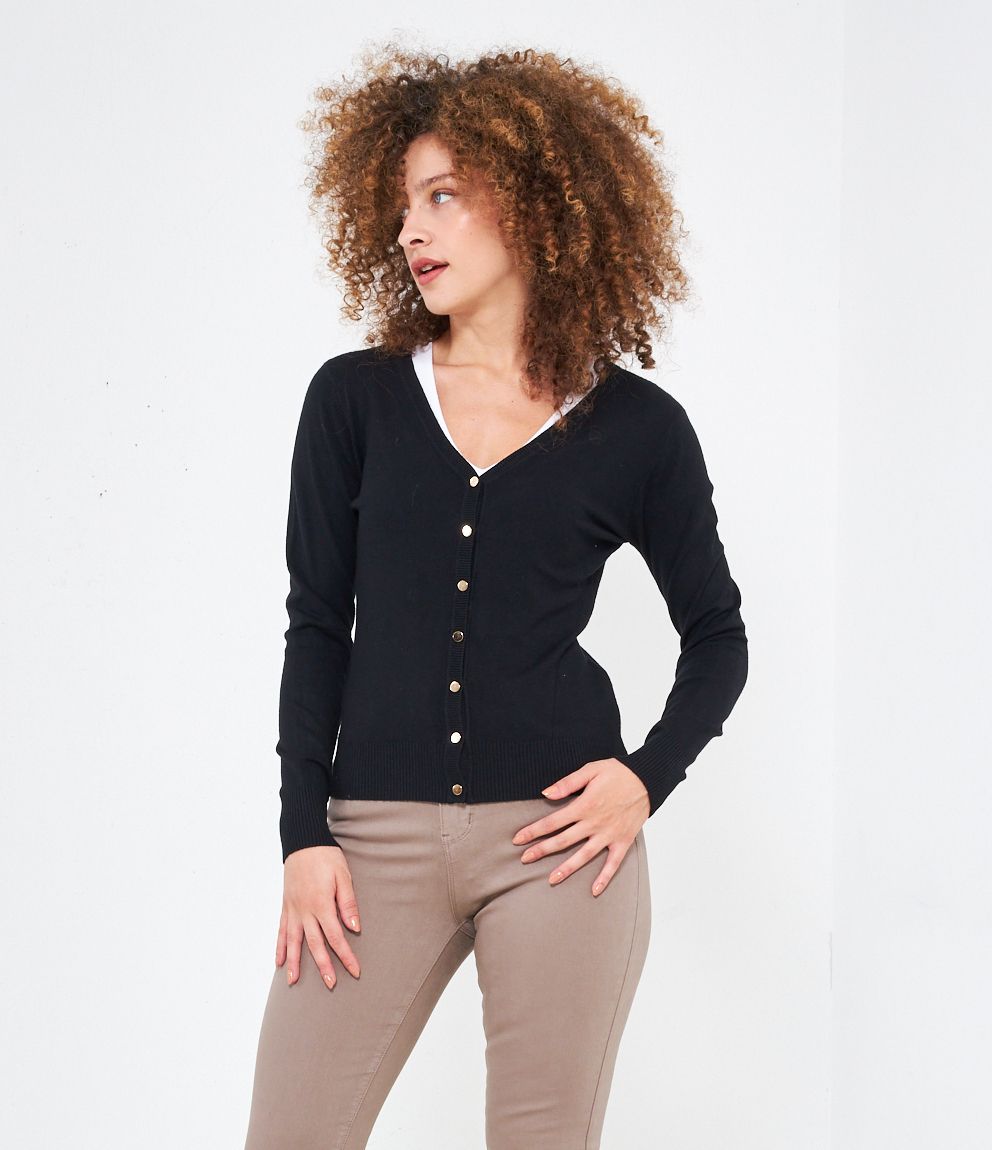 Cardigan modello regular fit in viscosa con bottoni dorati, scollo a V e bordi a costine.