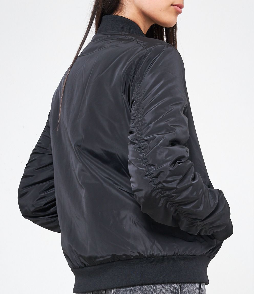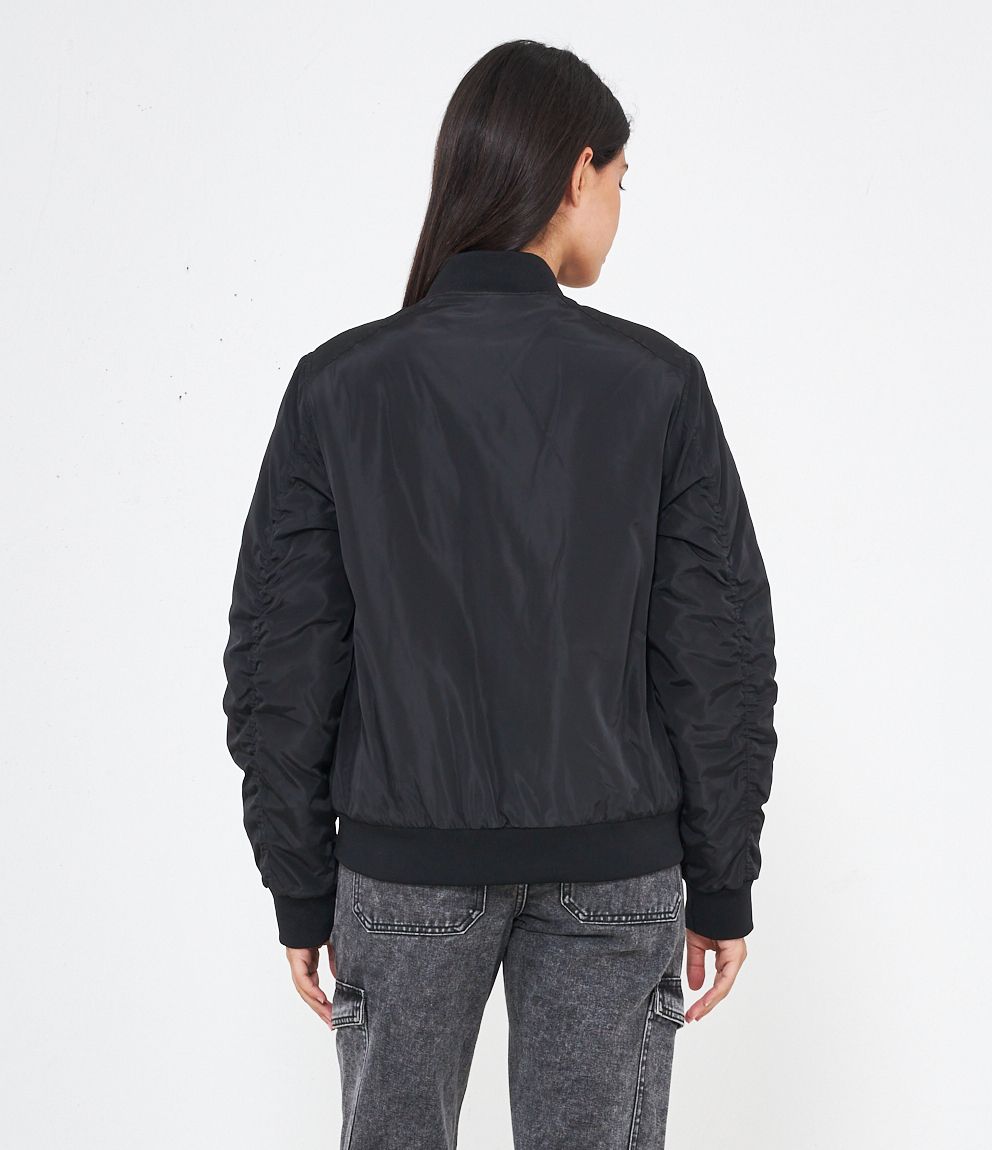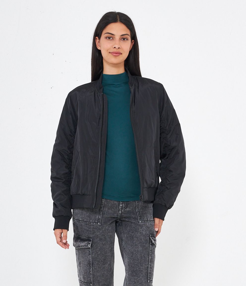 Giubbino modello bomber con zip frontale, tasche e bordi elastici a costine.