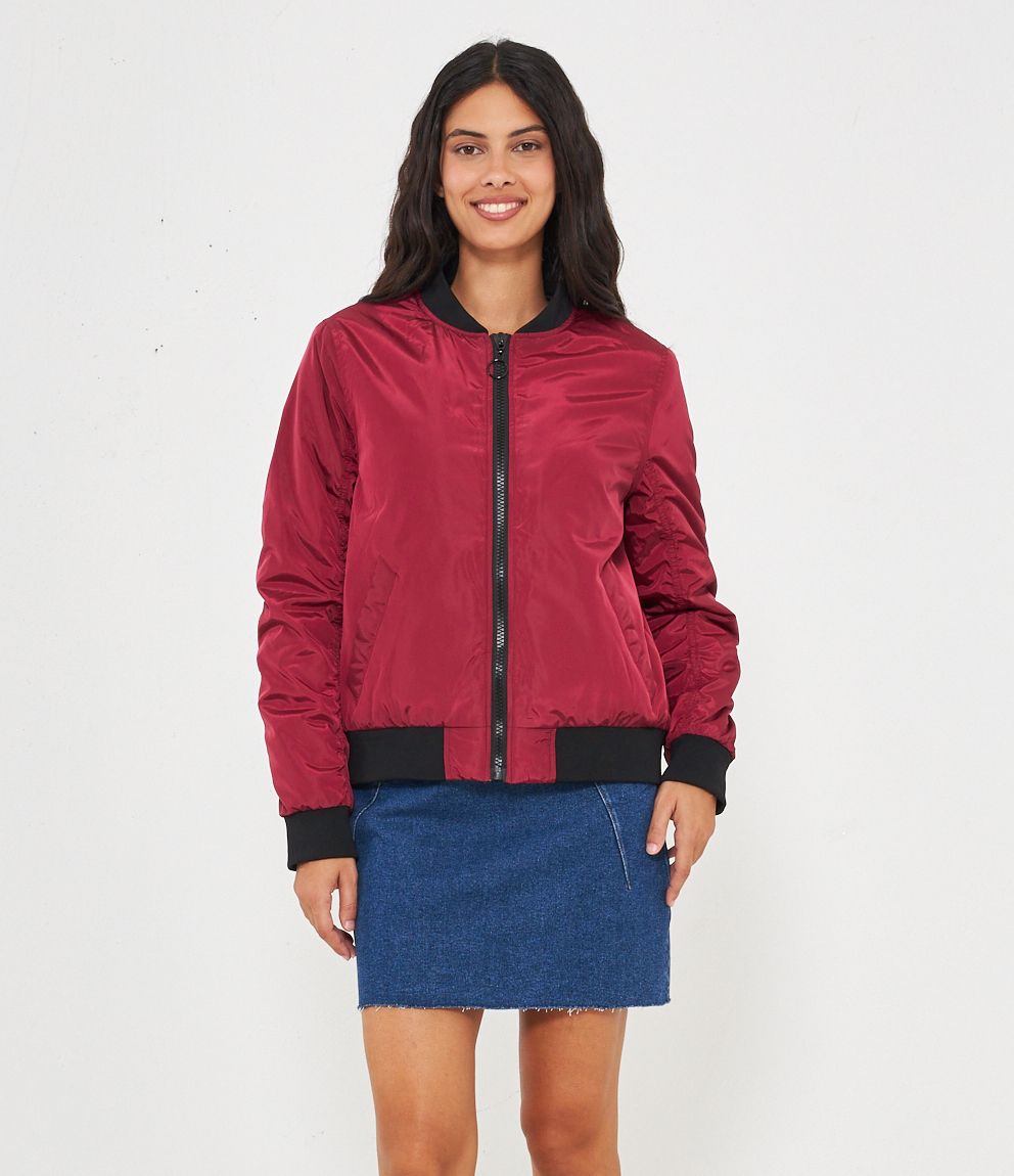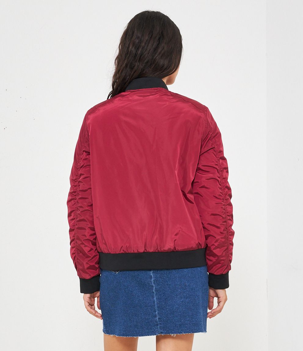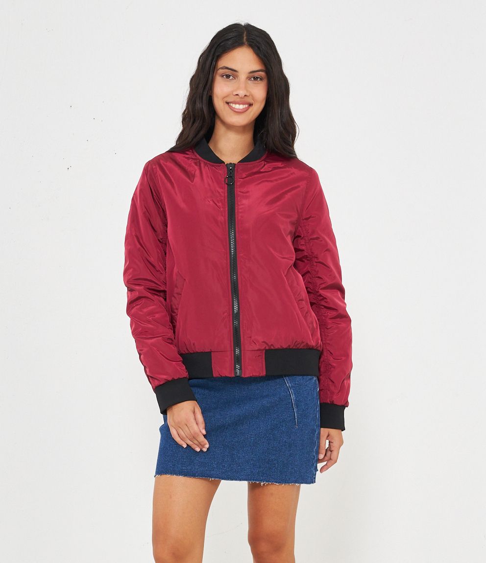 Giubbino modello bomber con zip frontale, tasche e bordi elastici a costine.