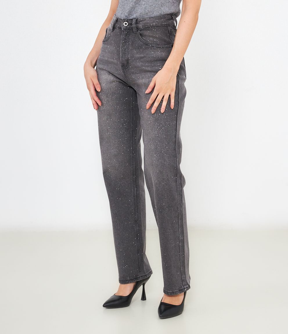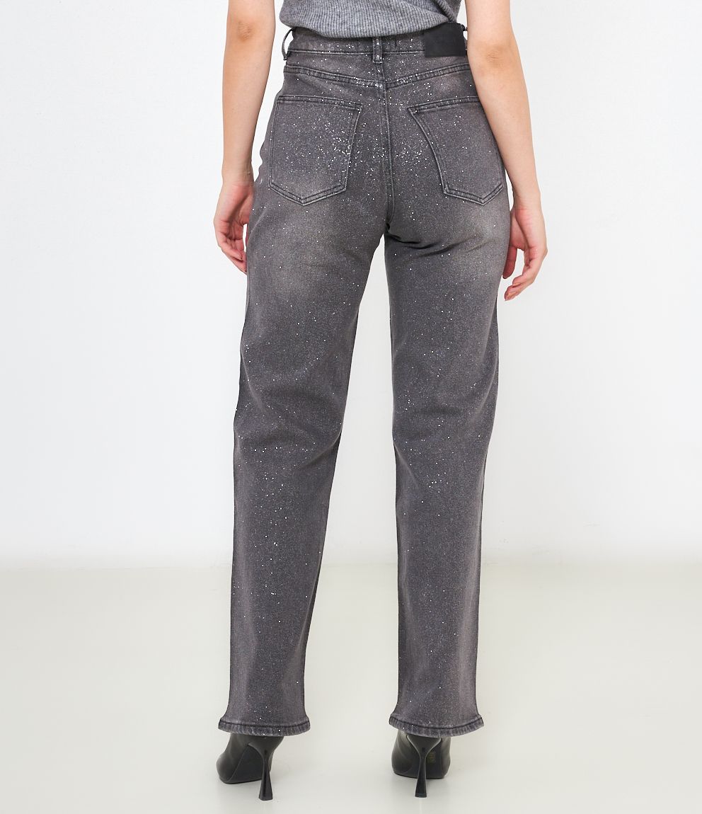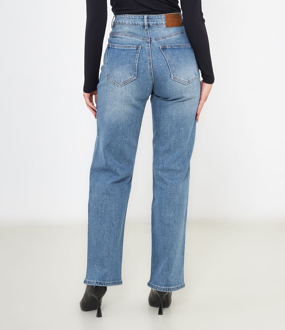 Jeans modello palazzo con glitter, cinque tasche e chiusura con zip e bottone.
